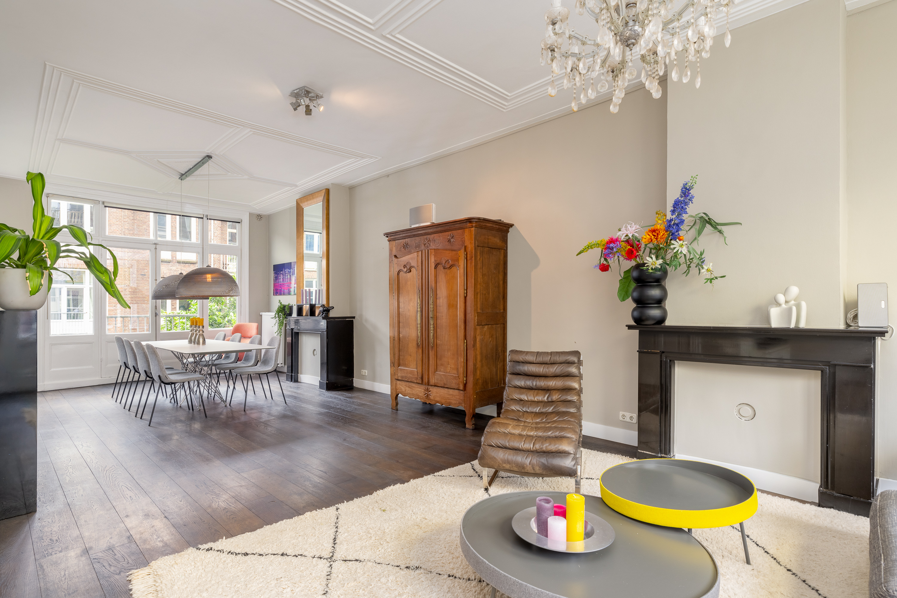 On the landing, you will find a separate toilet with a sink. From the landing, you have access to the spacious through-living room. At the front of the living room, there is enough space for both a formal sitting area and a cozy TV corner. There is also a beautiful balcony with a view of Valeriusstraat and Amstelveenseweg. At the rear of the house is the dining area, open kitchen with island, and a French balcony. The kitchen is equipped with a 5-burner gas stove, oven, microwave, and a fridge/freezer combination. Due to the abundance of glass and the ceiling height of 3.07 meters, this floor is particularly light and spacious.