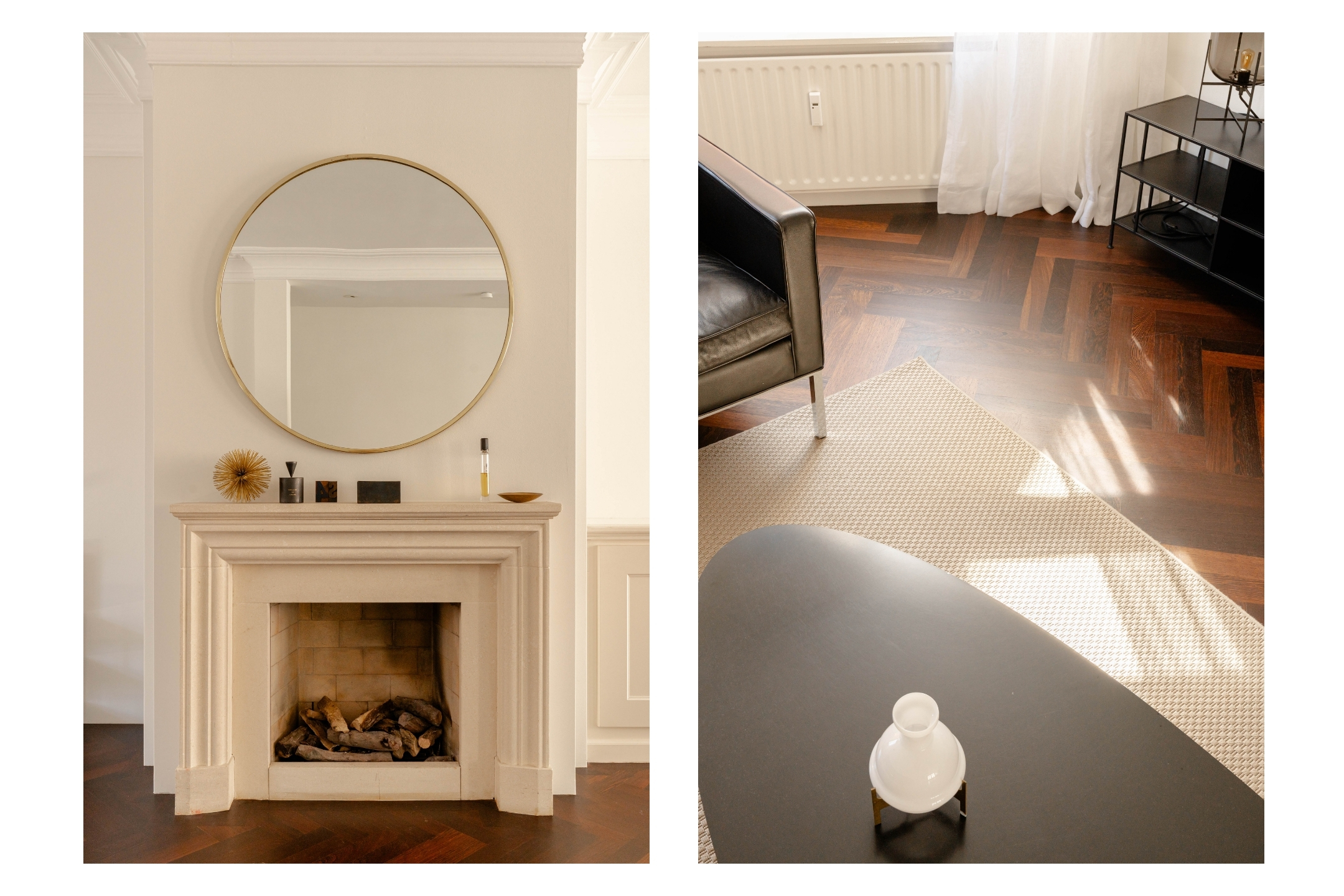 The living room is characterised by authentic features such as decorative mouldings, a fireplace with a classic mantelpiece, a beautiful wenge wood herringbone floor, and elegant wall panelling. French doors opening onto a charming Juliette balcony create a pleasant connection to the outside. The open kitchen is functionally designed and equipped with various built-in appliances and ample storage space.