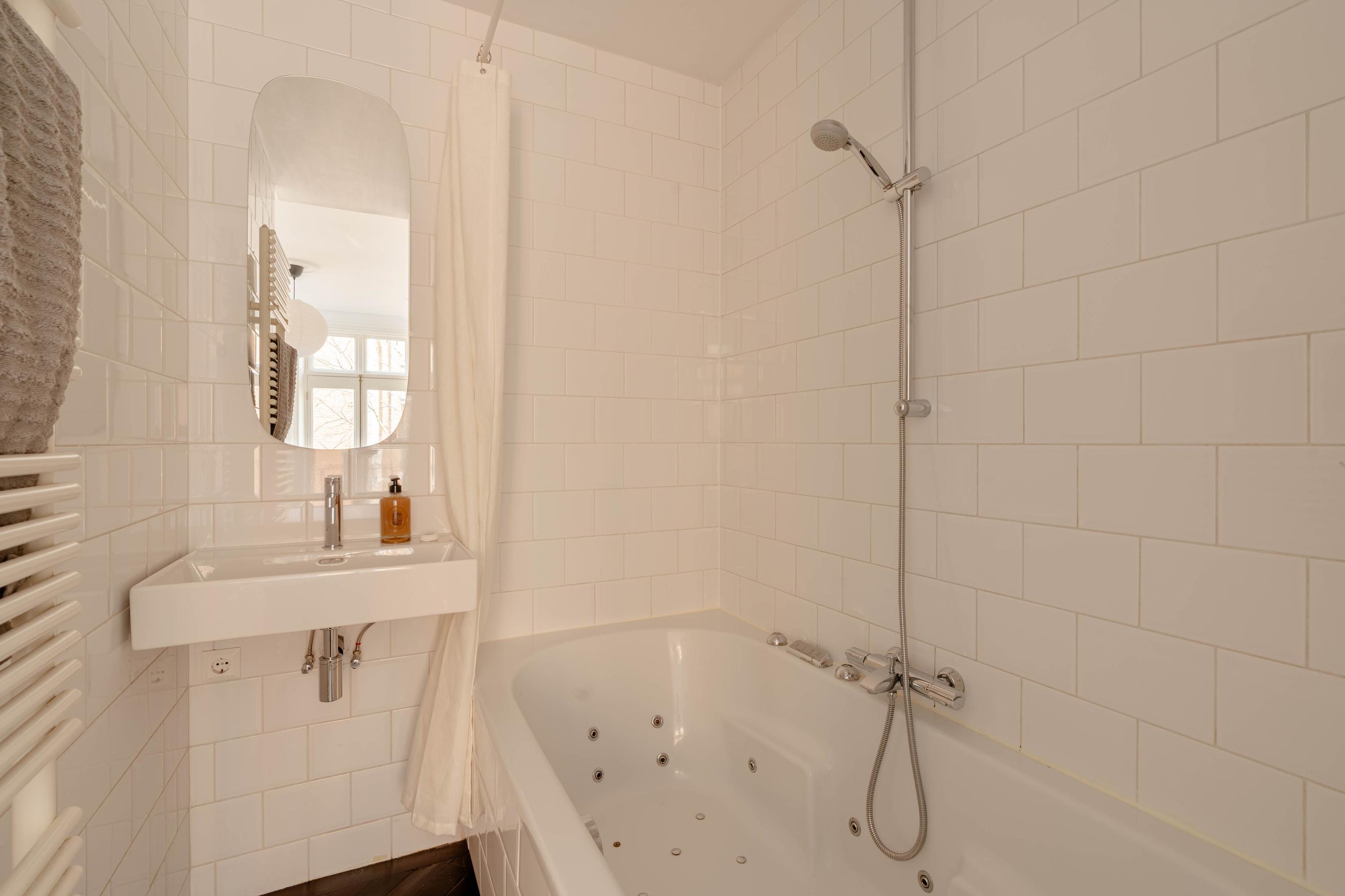At the rear of the apartment is the spacious bedroom, also featuring French doors to a Juliette balcony and practical built-in wardrobes. The en-suite bathroom is fitted with a bathtub and washbasin. The separate toilet is accessible from the living area.