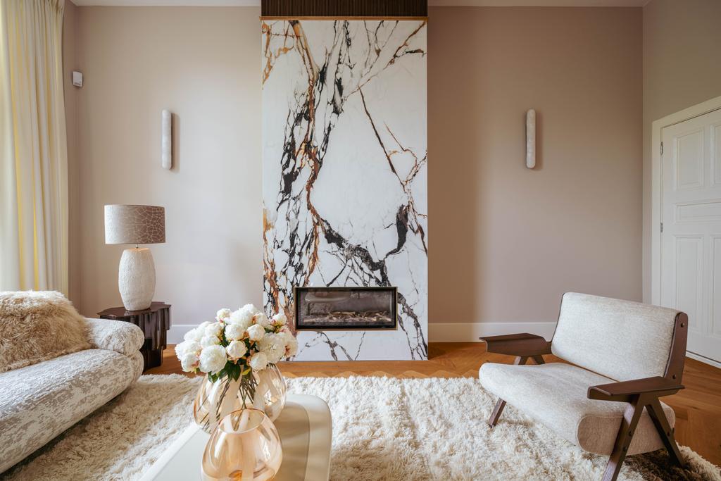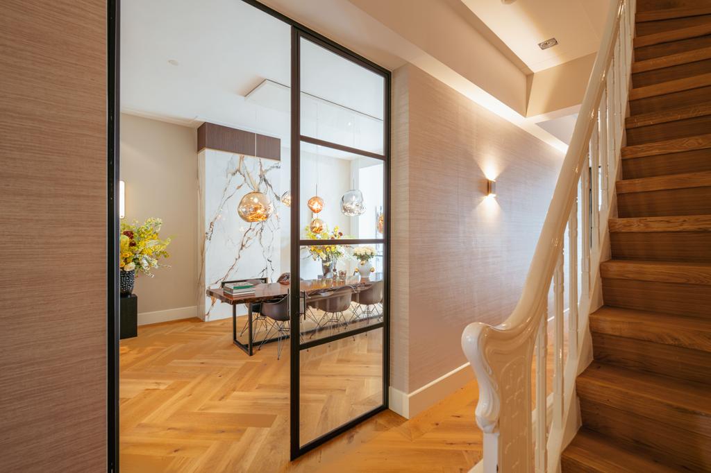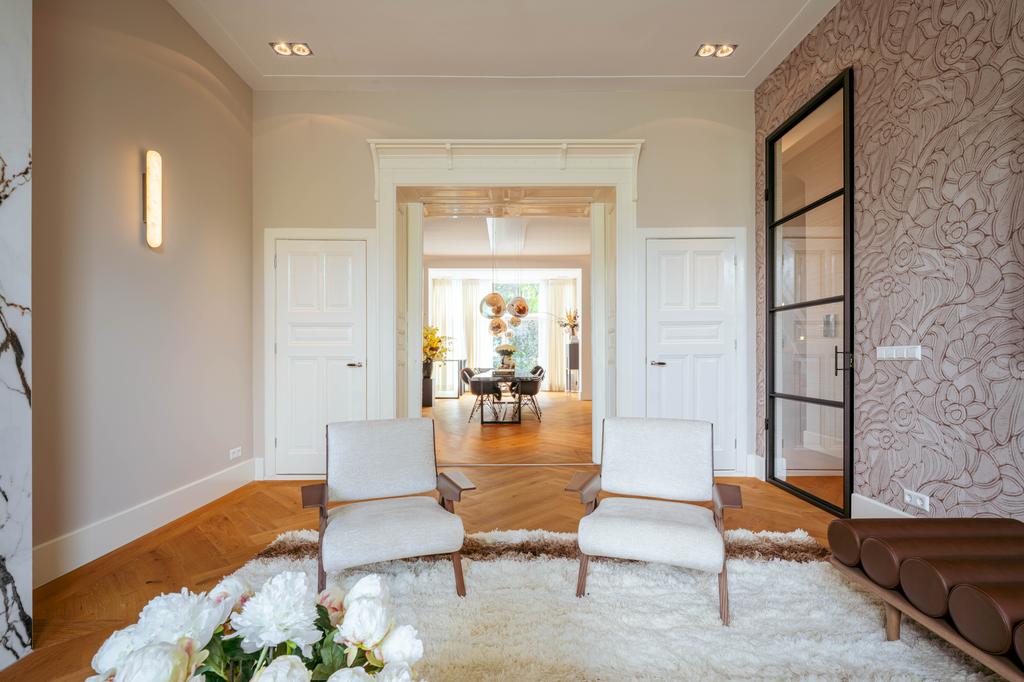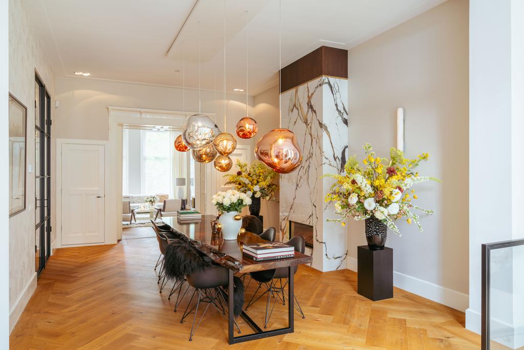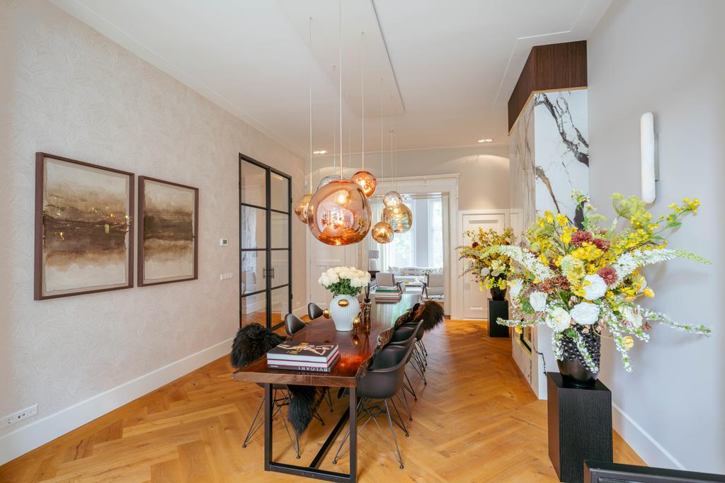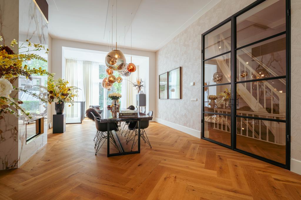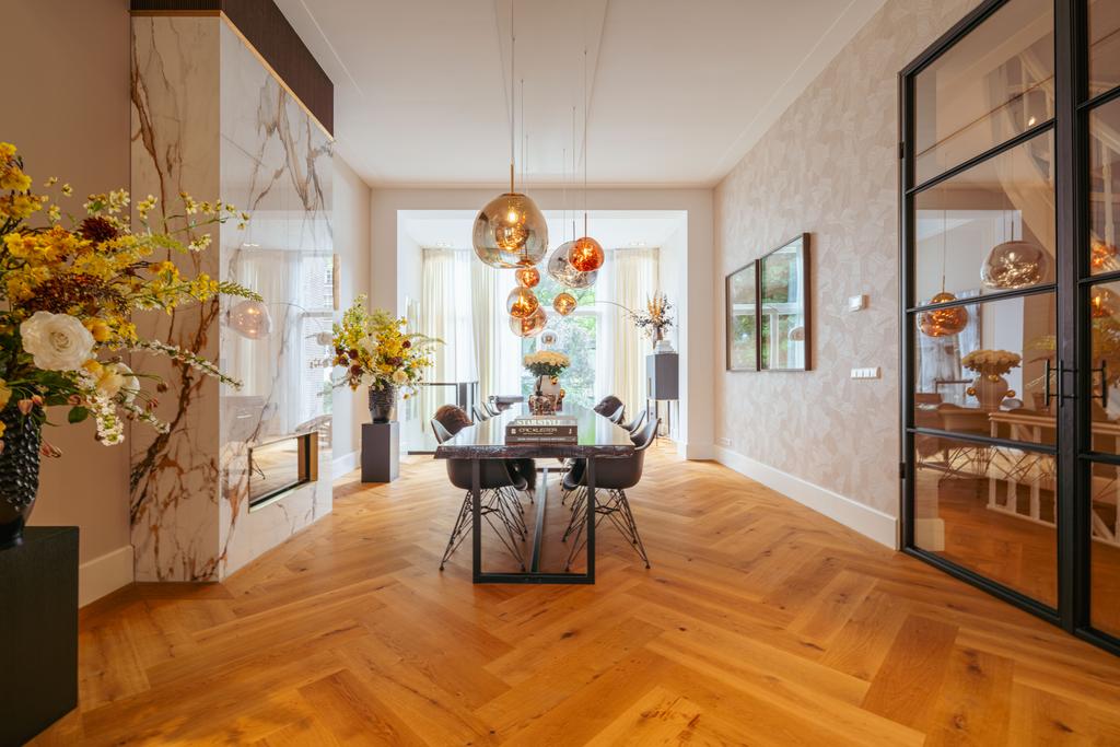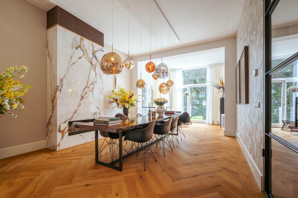 At the front, a cozy sitting area centers around a stylish gas fireplace with a marble mantelpiece, flooded with natural light through large windows and offering an uninterrupted view of Vondelpark. The dining area at the rear is accessible from both the living room and hallway through sleek steel pivot doors and features another gas fireplace with a marble surround, adding warmth and sophistication. A staircase connects this space to the kitchen in the lower ground floor, creating a natural flow between the levels.