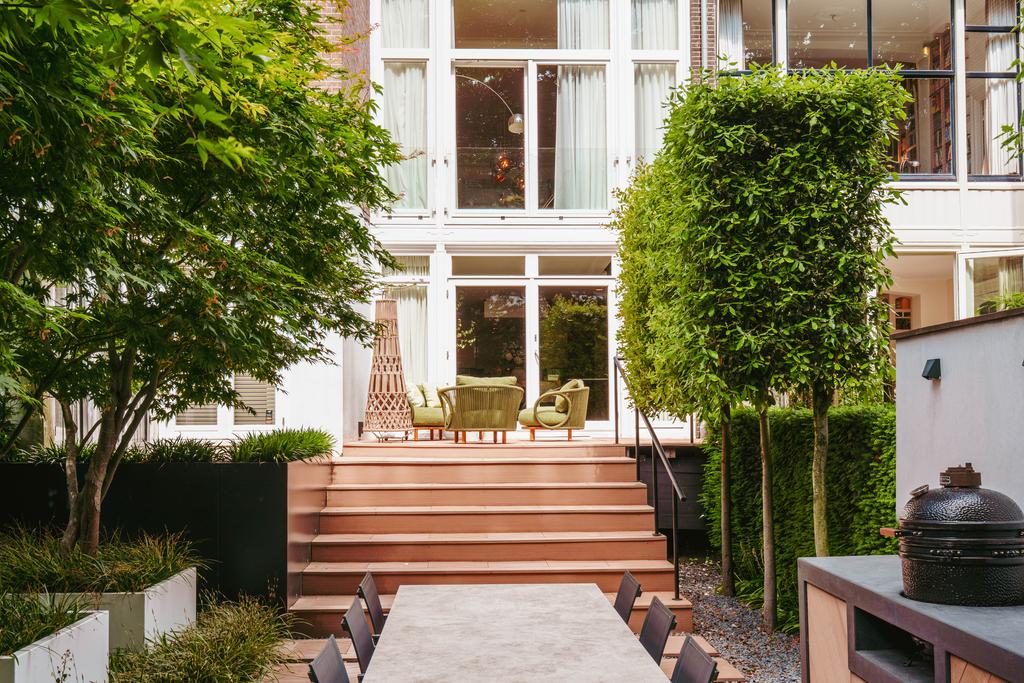 Designed by landscape architect Erik van Gelder, the garden includes a fully equipped outdoor kitchen, making it perfect for summer evenings. A detached storage shed offers additional functionality. This outdoor space is a peaceful and private retreat, ideal for enjoying long, sunny days.
