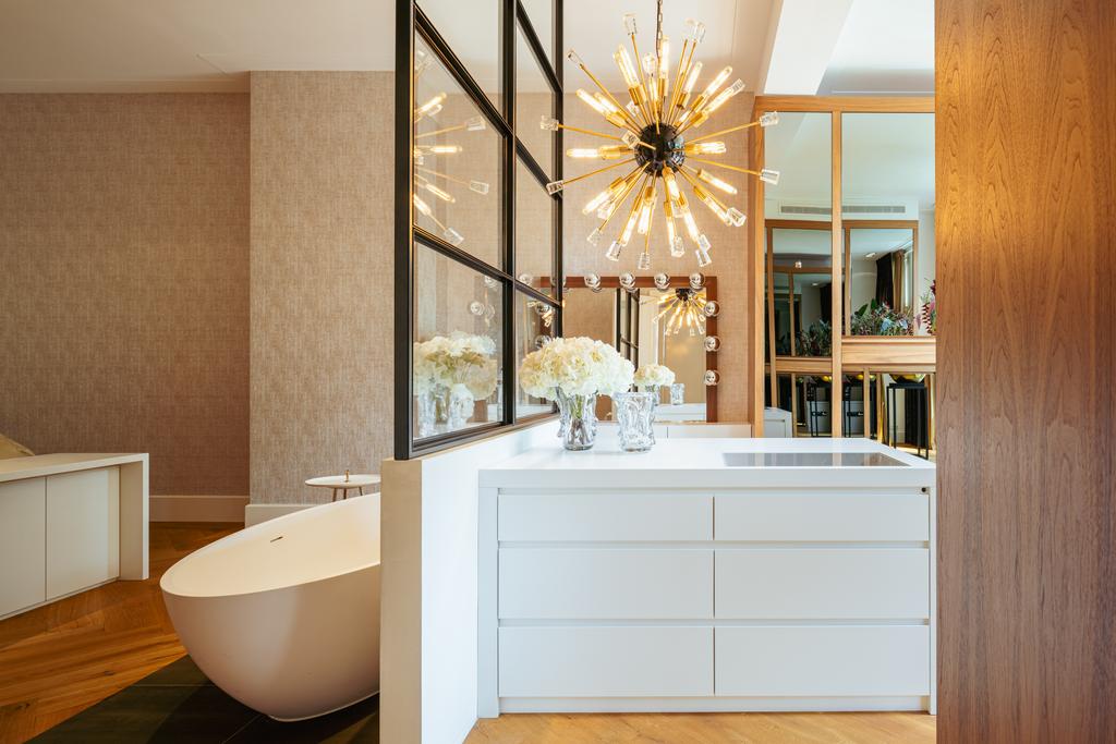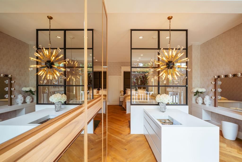Accessible via staircase or lift, the landing leads to all rooms on this level. At the rear is the expansive master bedroom, featuring a glass wall that subtly divides the sleeping area from the bathroom and dressing space. This luxurious suite includes built-in wardrobes, a freestanding bathtub, and French doors overlooking the landscaped garden.