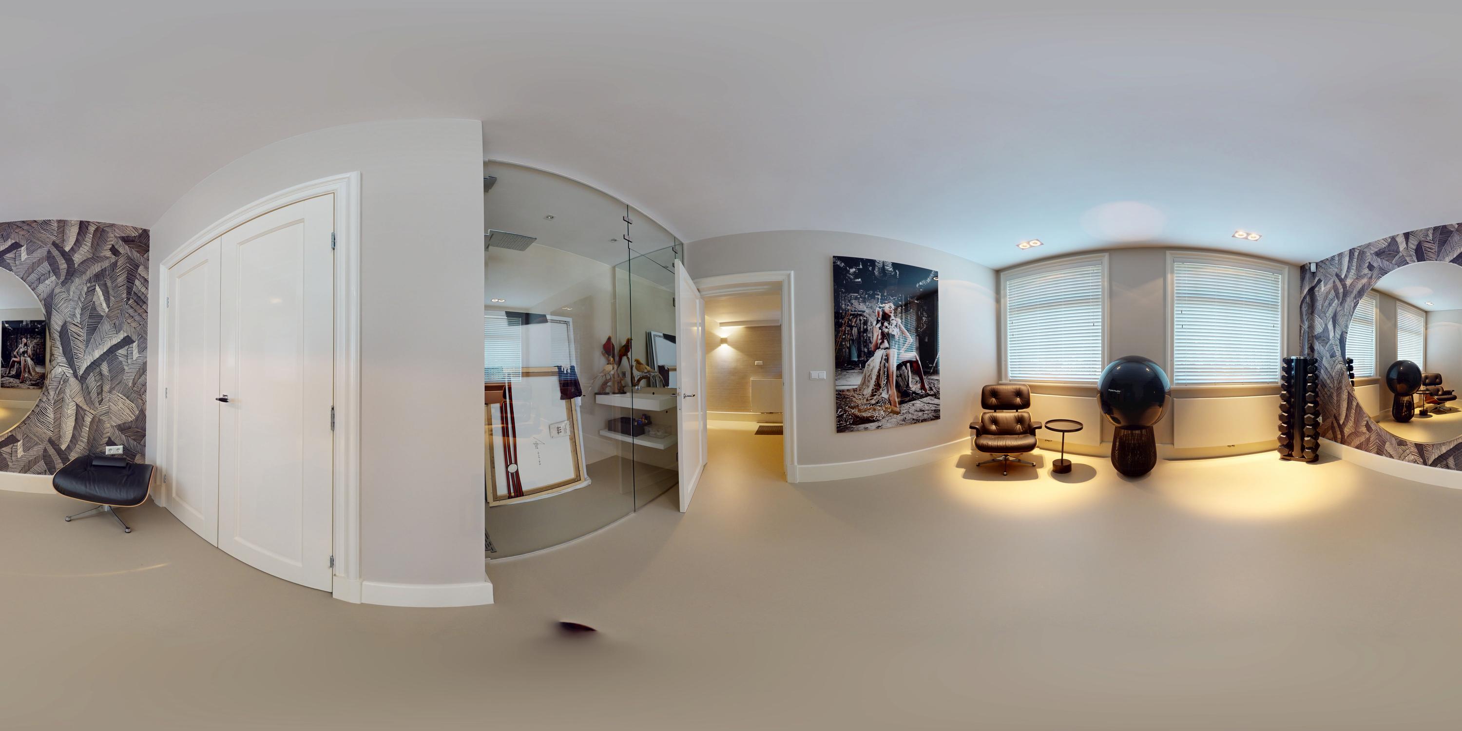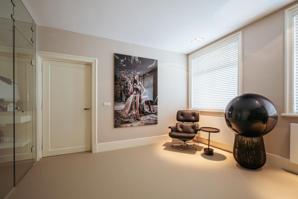 Also at the rear is a modern bathroom with a double vanity, spacious walk-in shower, and toilet. At the front of the home is a second large bedroom, with a gas fireplace, a freestanding bathtub, and French doors opening onto a balcony with breathtaking views over Vondelpark.