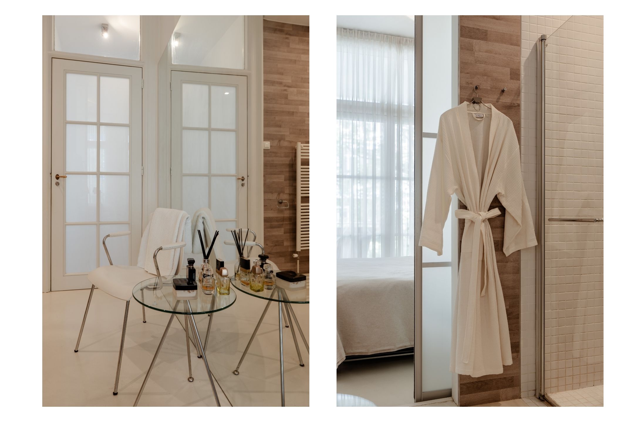 Adjacent to the bedroom is the en-suite bathroom, accessible via a sliding partition and equipped with a walk-in shower, washbasin, toilet and designer radiator.