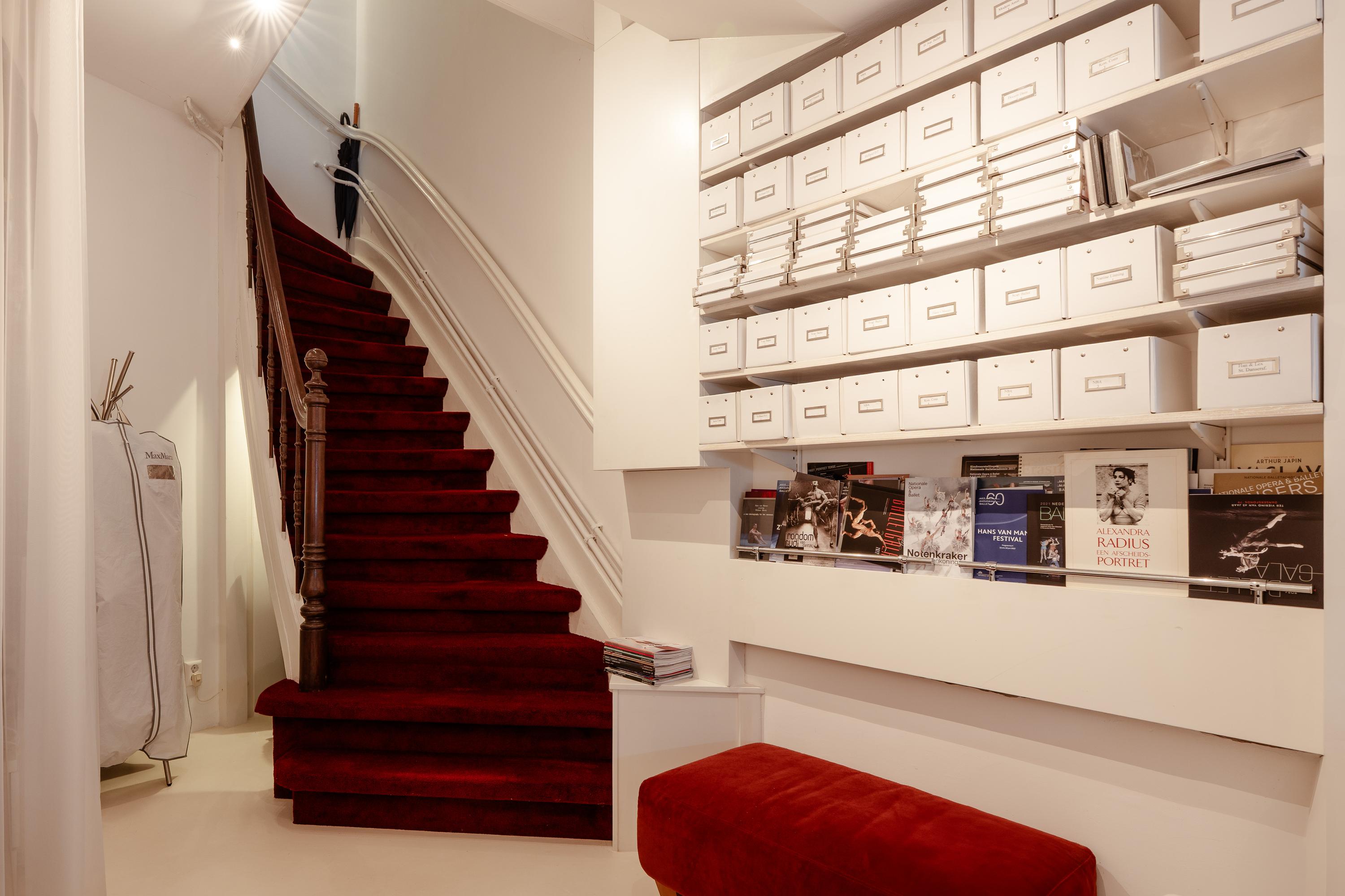 A red-carpeted staircase leads to the basement level with underfloor heating. This space of approximately 13 m² is perfectly suitable as a guest room, yoga or fitness area, with ample storage possibilities. The space is currently used as an office.