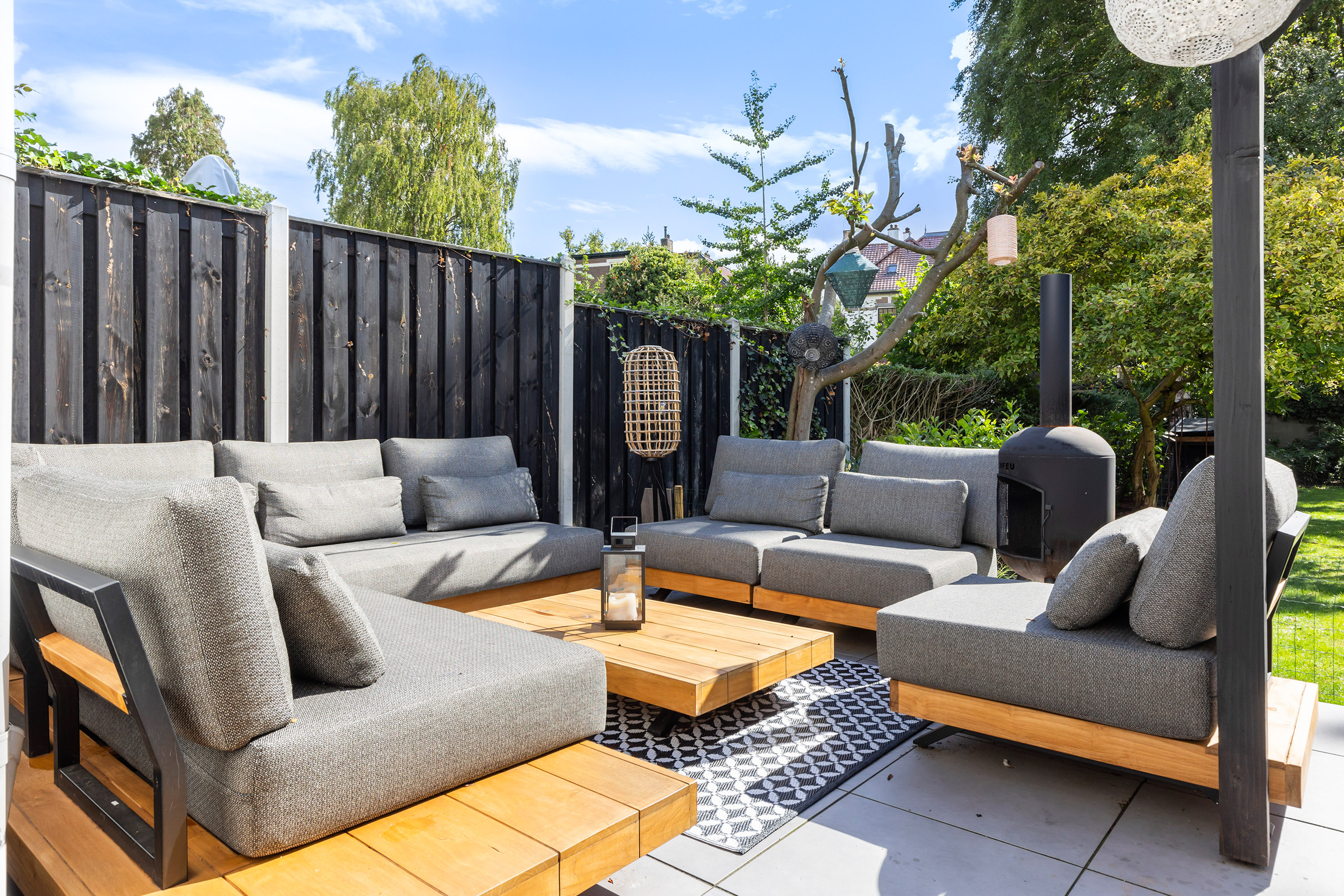 De achtertuin is circa 30 meter diep, volledig besloten en gelegen op het zuidwesten. Dankzij de volgroeide bomen en het groen rondom geniet u hier van optimale privacy. Het royale terras biedt ruimte voor zowel een grote loungeset als een eettafel, zodat u op elk moment van de dag van zon of schaduw kunt genieten. Verder is er een gazon, een kippenren en een houten berging aanwezig.