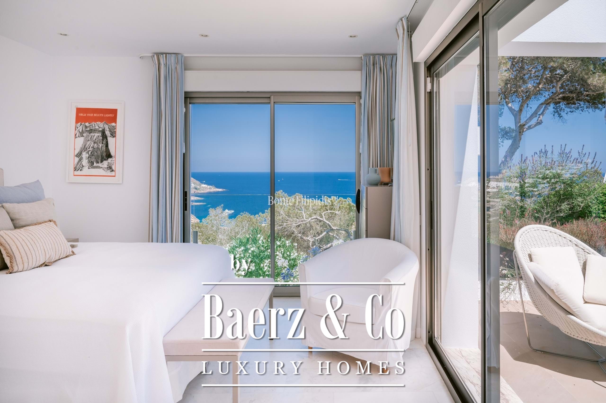 The villa spans generous interiors, featuring seven bedrooms and five bathrooms, along with a fully independent guest apartment. A serene courtyard with a koi pond sets a calming tone upon arrival, leading to light-filled living areas, a fully equipped kitchen, and several sea-facing terraces that create a fluid indoor-outdoor connection.