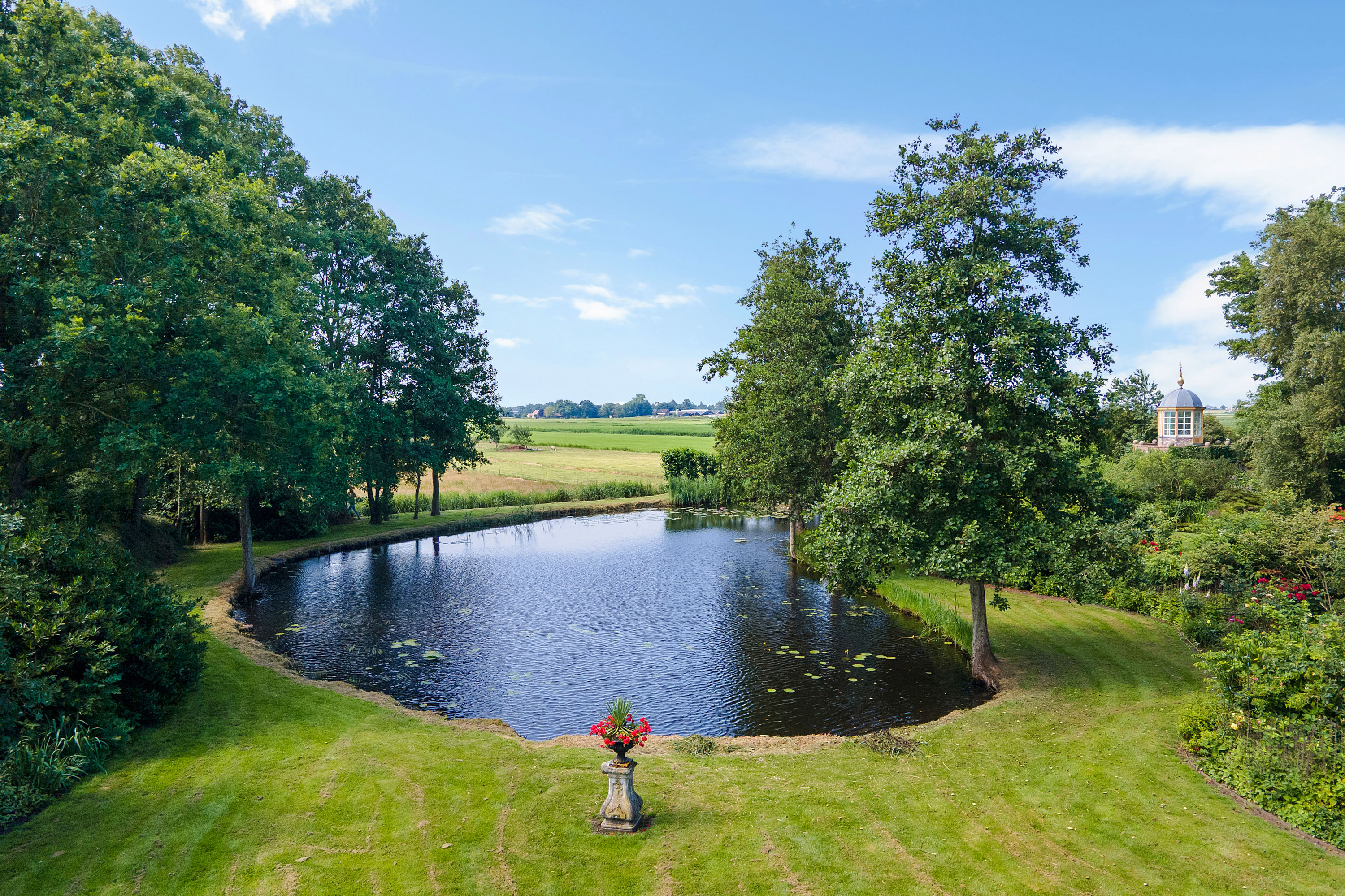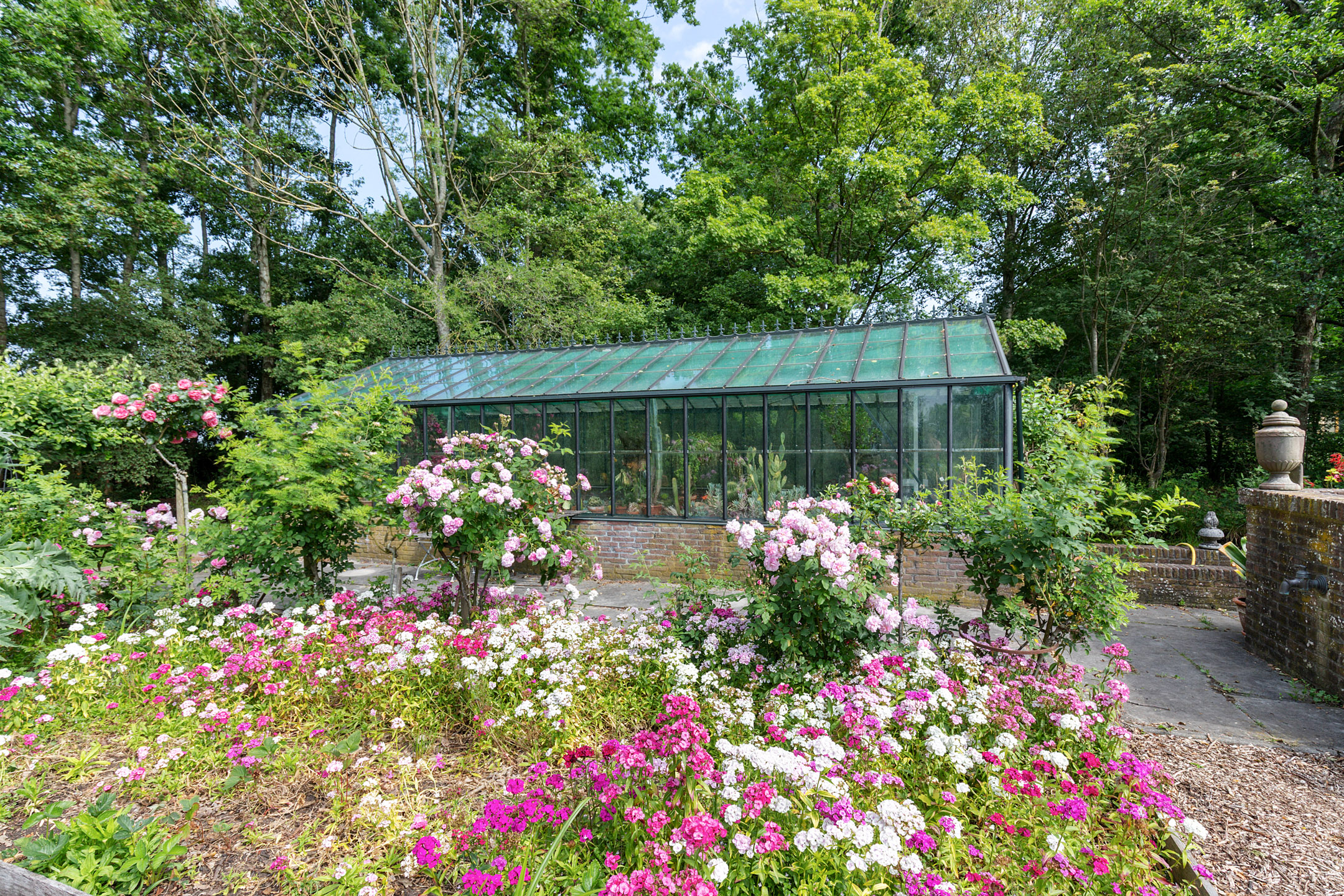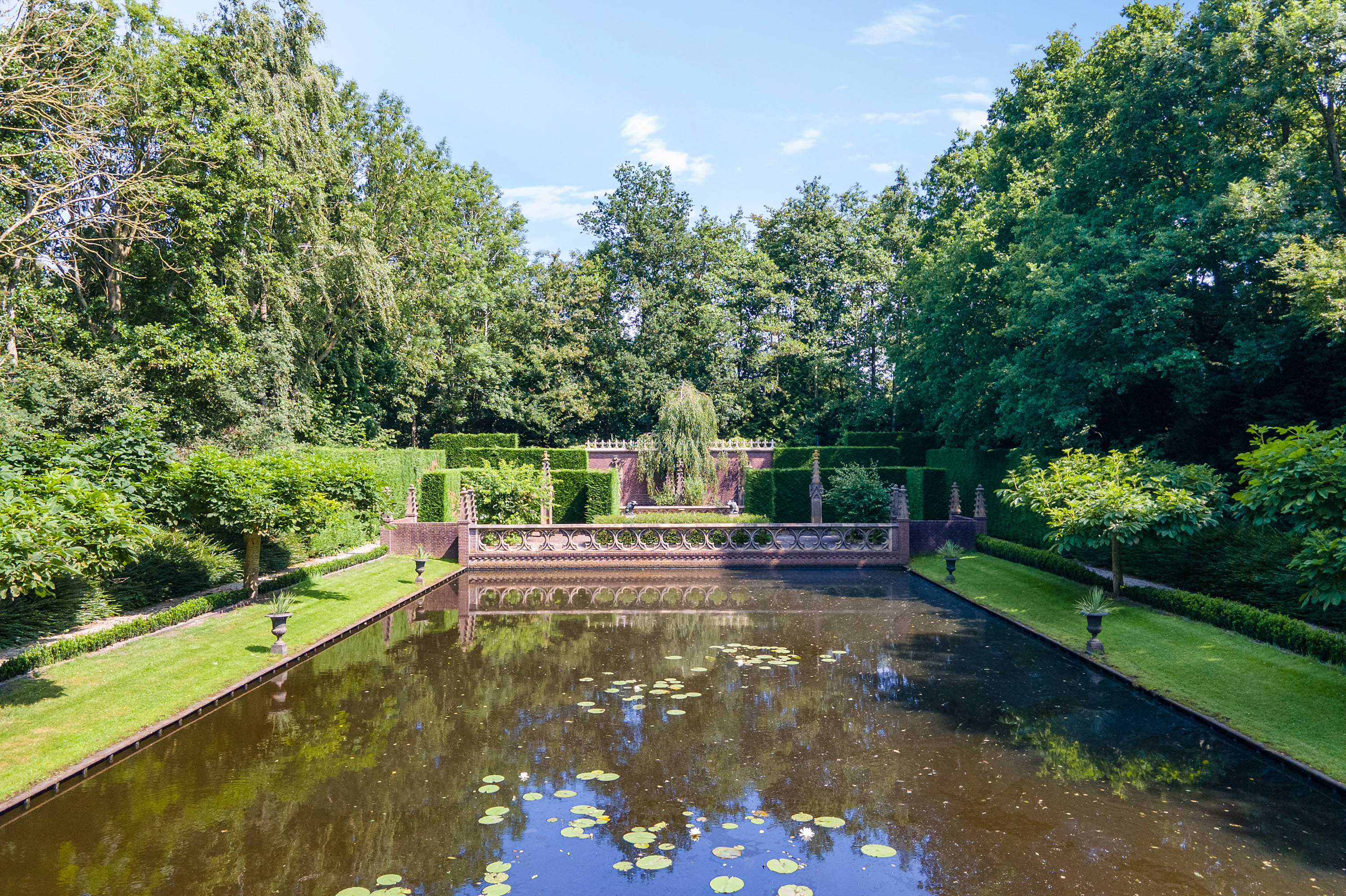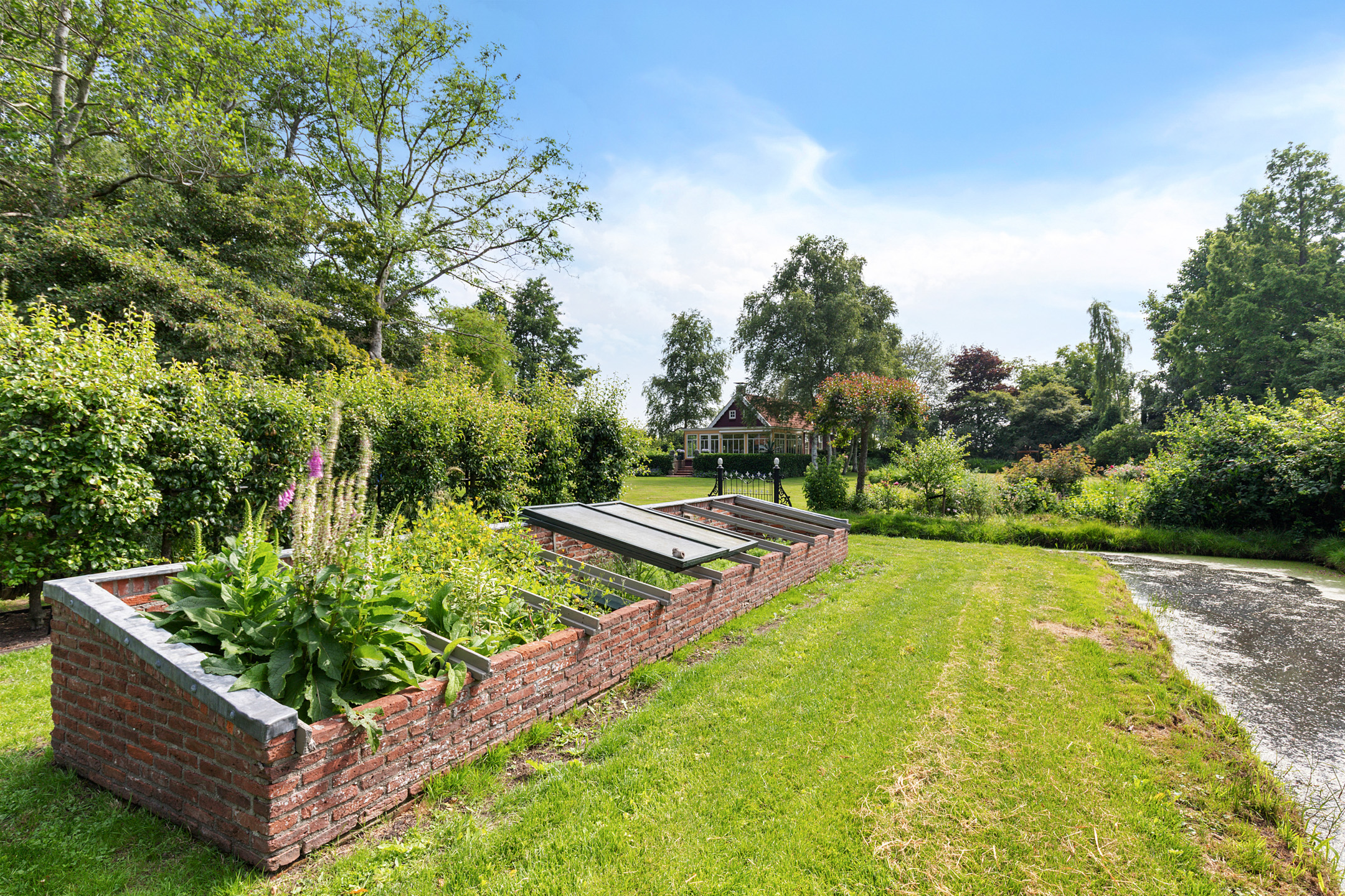 What began as a plot of approximately 1,600 m² has grown into a remarkable estate of approximately 3.18 hectares. The gardens were carefully designed to combine formal and natural elements, including two (swimming) ponds, multiple terraces, garden houses, a conservatory with vegetable garden, wooded areas, and expansive lawns.
