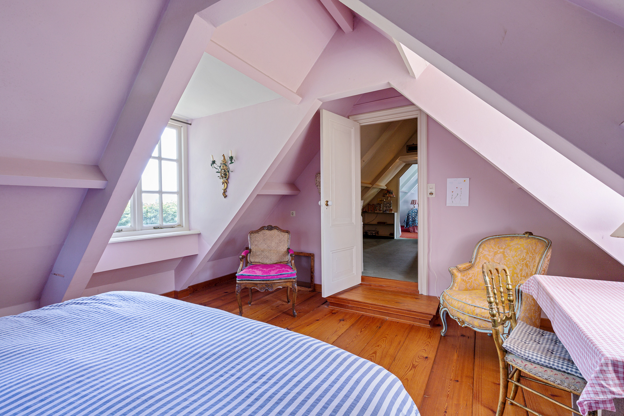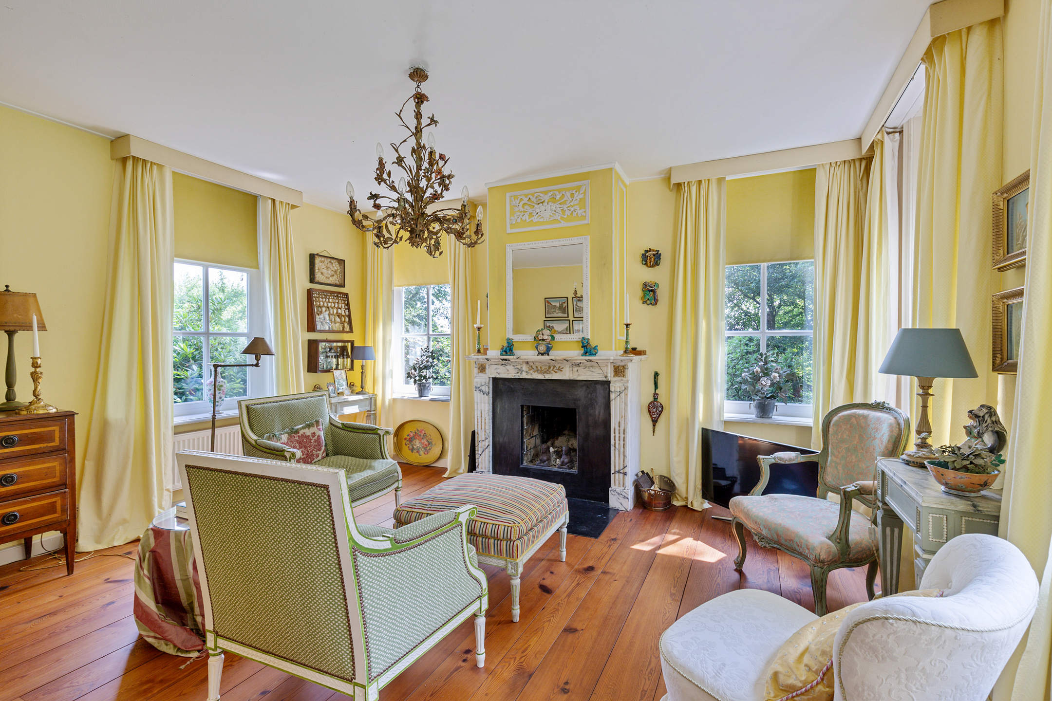 Full of character, it boasts a Stevenson or Norwich cornice, a French dessus-de-porte from the 18th century, a faux marble fireplace, and a trumeau from a Frisian town hall, all contributing to its historic charm.