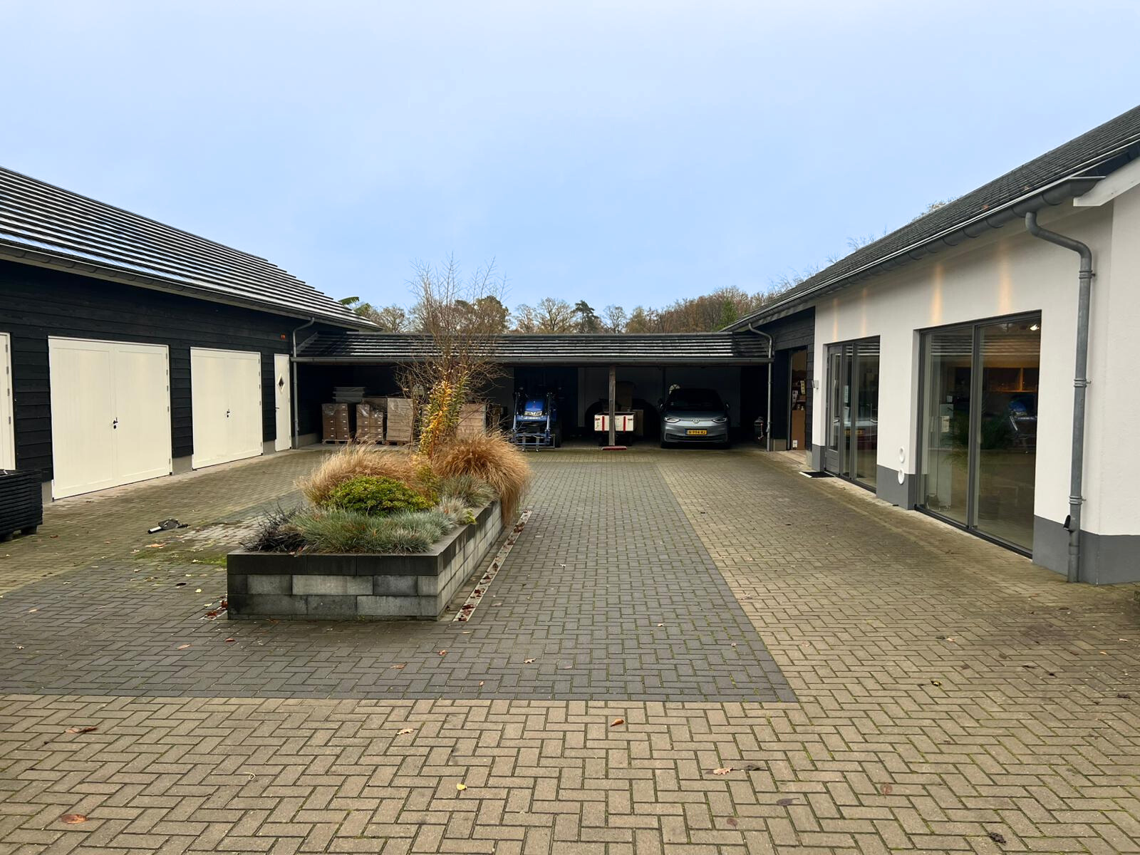 Adjacent to this is a carport/car shed (12 m by 5 m). In addition, the U-shape is filled with a double lockable garage (46 m²) and an adjoining second large storage/parking space (approx. 62 m²). The paved outdoor area provides parking space for at least six cars with a 22kW charging station (currently available to the public).