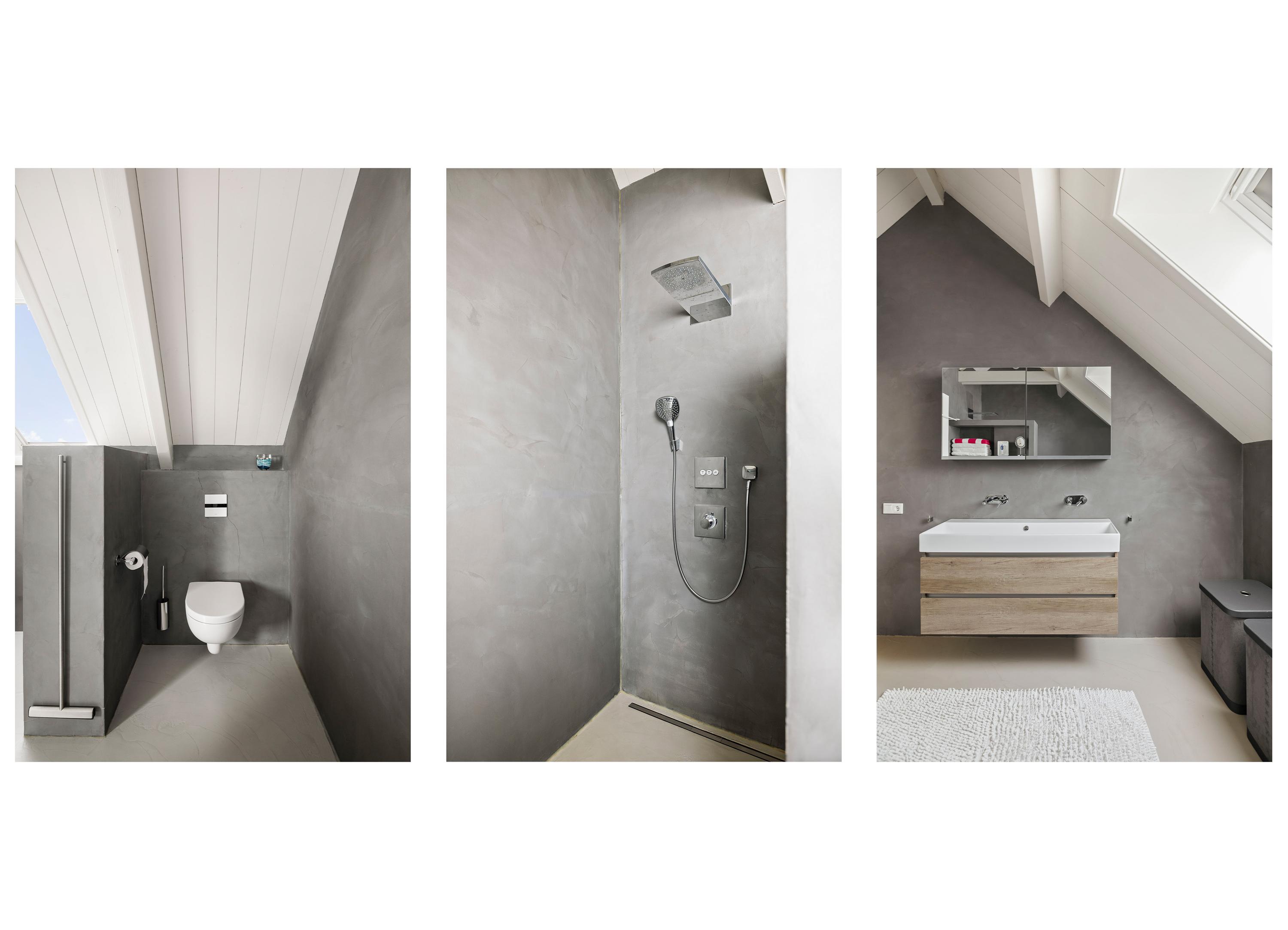 Upstairs is a spacious landing with plenty of storage space and two lovely bedrooms, also with plenty of storage space and each with its own bathroom. The walls with concrete Ciré give the rooms a chic and contemporary look. Both bathrooms have a spacious walk-in shower, toilets with Wisa non-touch flushing system and washbasin (Grohe Sphinx).