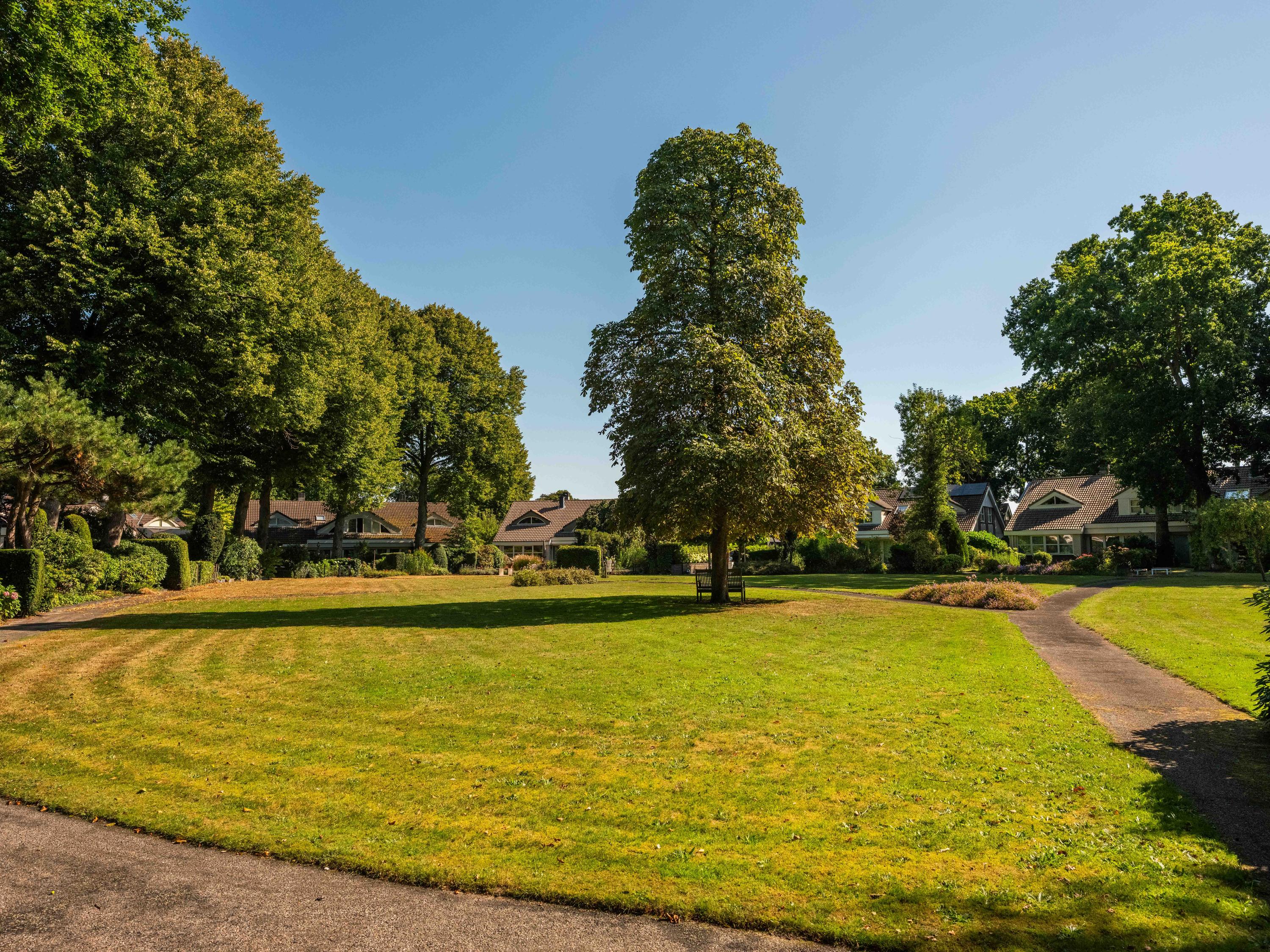 Through the large sliding doors, you step into the sunny, sheltered backyard, a wonderful place to enjoy peace and privacy, with a terrace and a view of the pond. The beautifully landscaped, sunny garden is an oasis of peace and privacy. The terrace borders the exclusive, communal park with ponds – a unique place where you can enjoy nature to the fullest. The park is exclusively accessible to local residents.