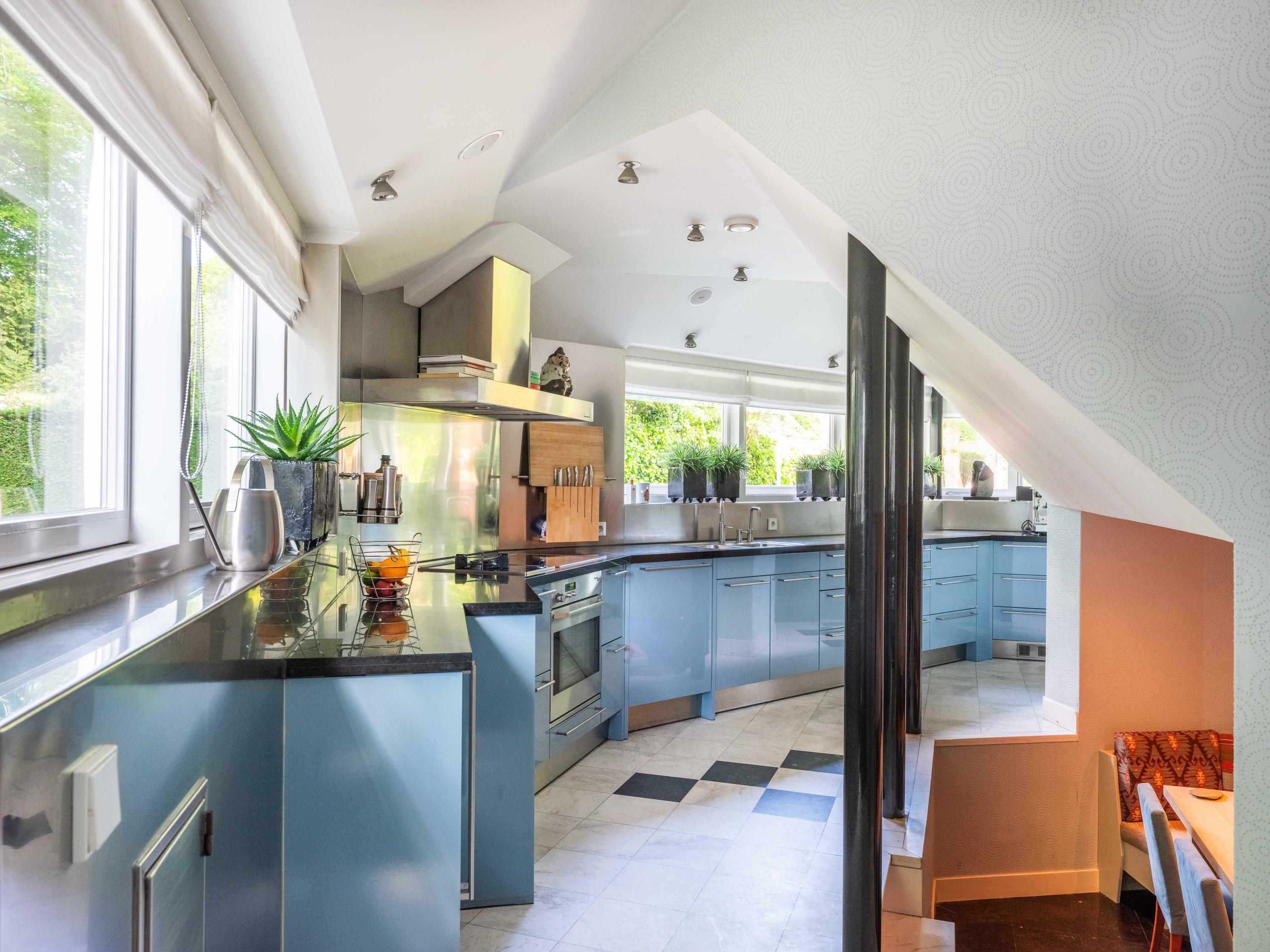 French doors lead to the spacious living room with fireplace, a dining area and conservatory. A striking feature is the raised section, known as the ‘wheelhouse’, which has monumental value. A beautiful parquet floor with piping, the rounded shapes of the fireplace, the ‘compass balls’ near the raised section and the trapezoidal window with columns give the whole a special appearance.