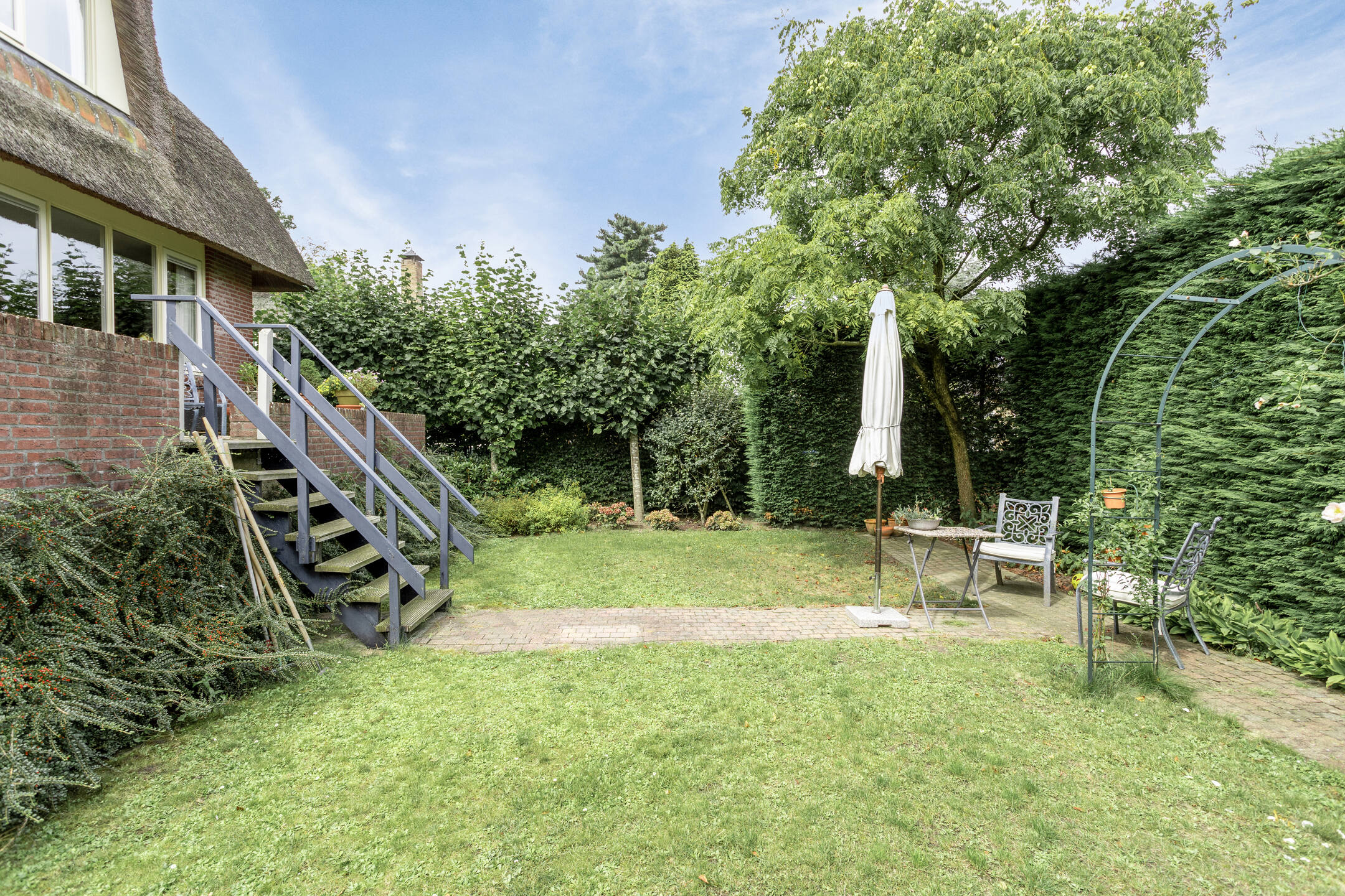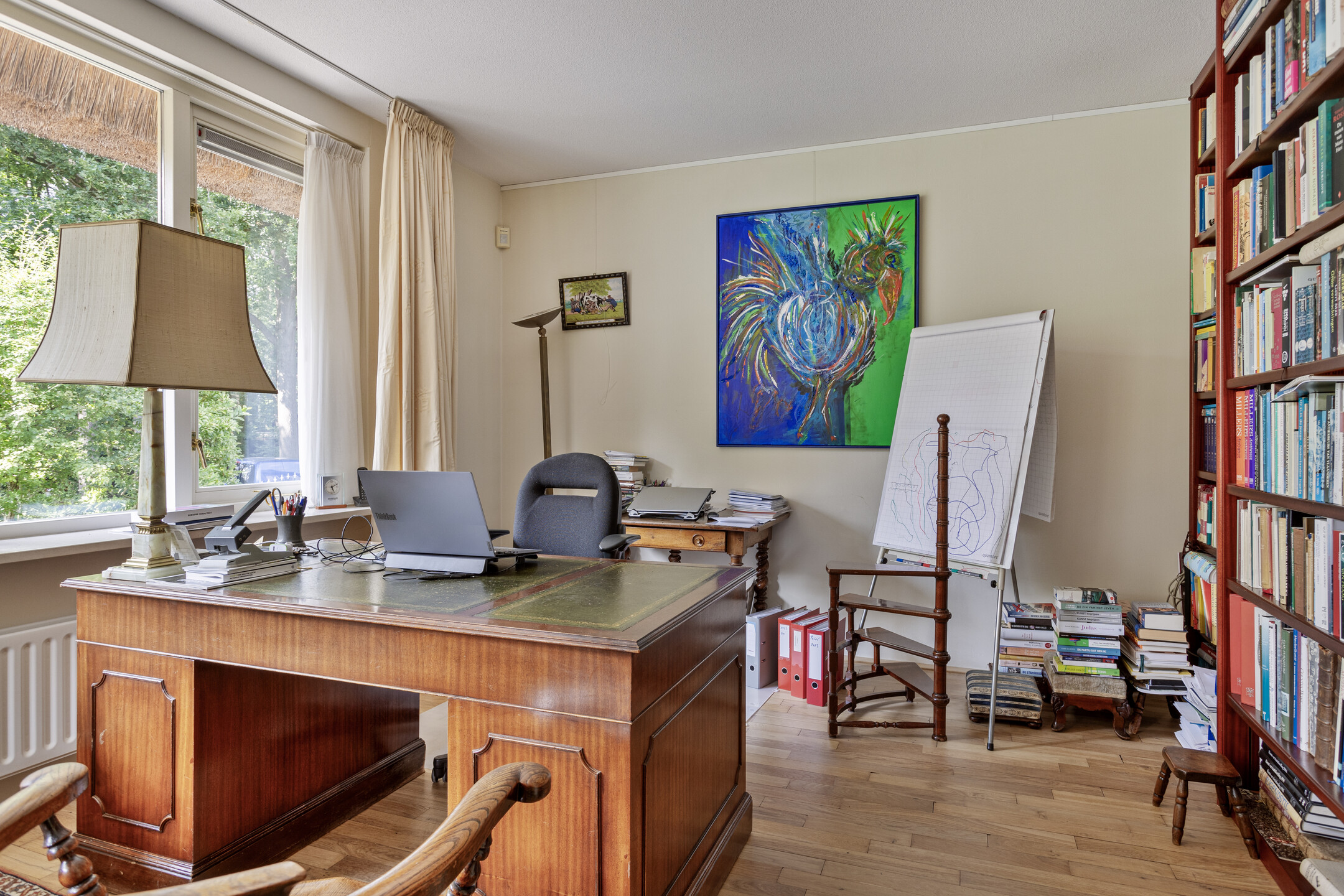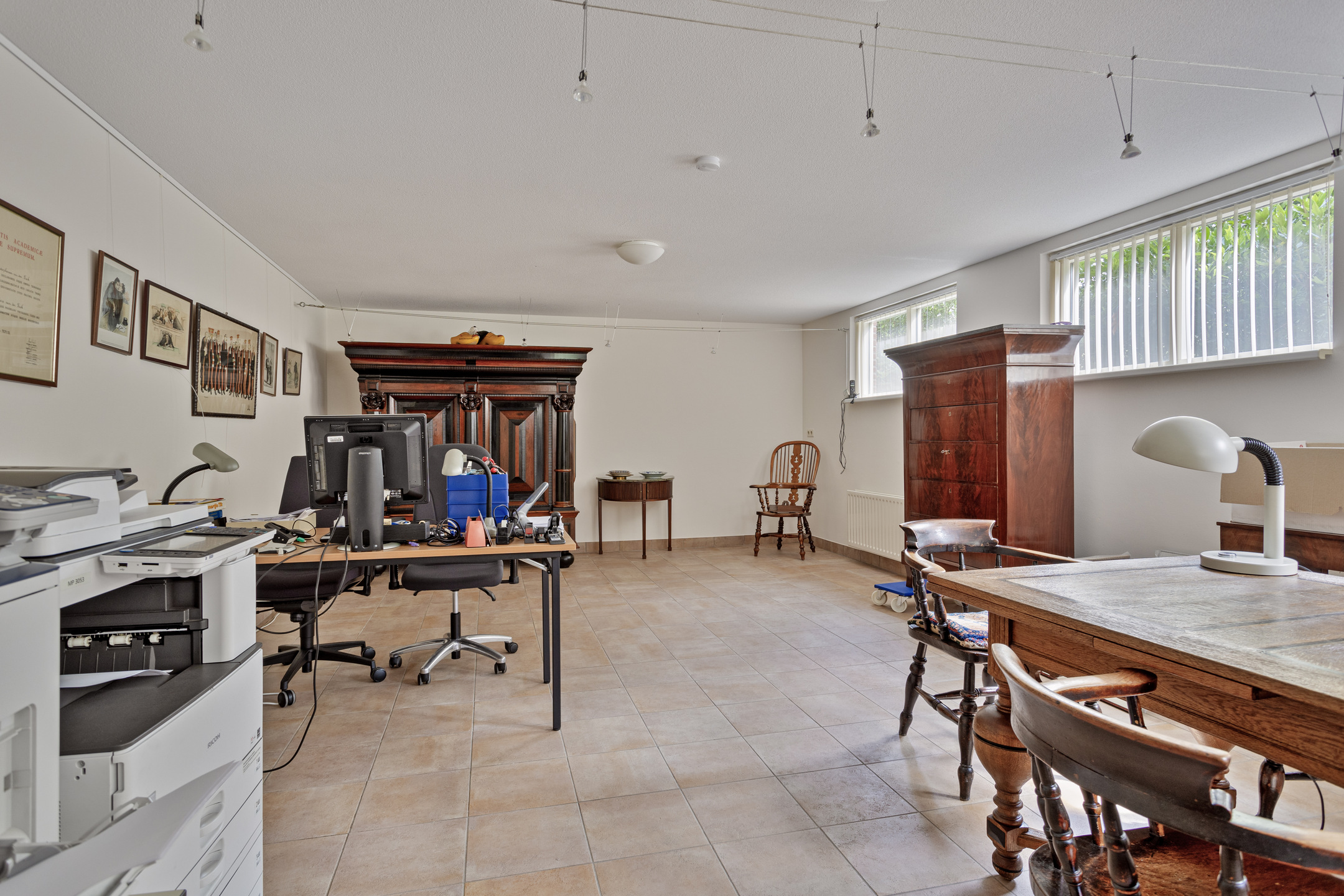 The architecture nods to the elegance of the 1930s with a distinctive thatched roof, enhancing its visual appeal. Within, solid oak flooring, smooth stucco finishes, and carefully considered spatial flow create a refined atmosphere. The expansive living and dining areas connect seamlessly to a landscaped garden and an inviting terrace, both designed for privacy and relaxation. A flexible ground floor office, five bedrooms, and a full basement with garage, wine cellar, and additional work or fitness rooms cater to diverse living and working needs.