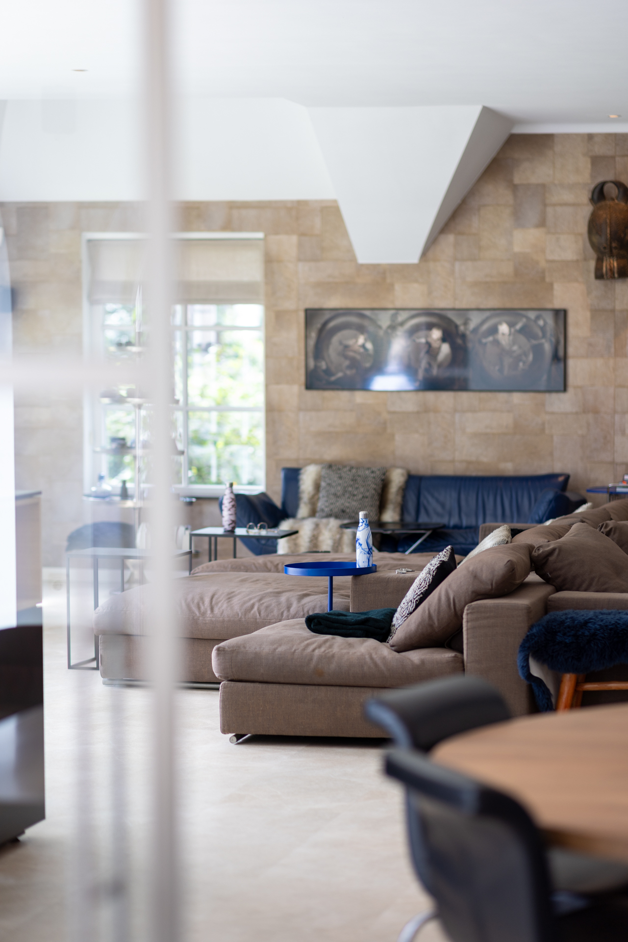 The living room was expanded in 2005. The extension connects nicely to the thatched roof, making the garden doors extra high and offering a fantastic view of the garden. With the windows all around, the living room has a beautiful light. From the living room you have access to the second office / fitness room and through a beautiful sliding door to the kitchen.