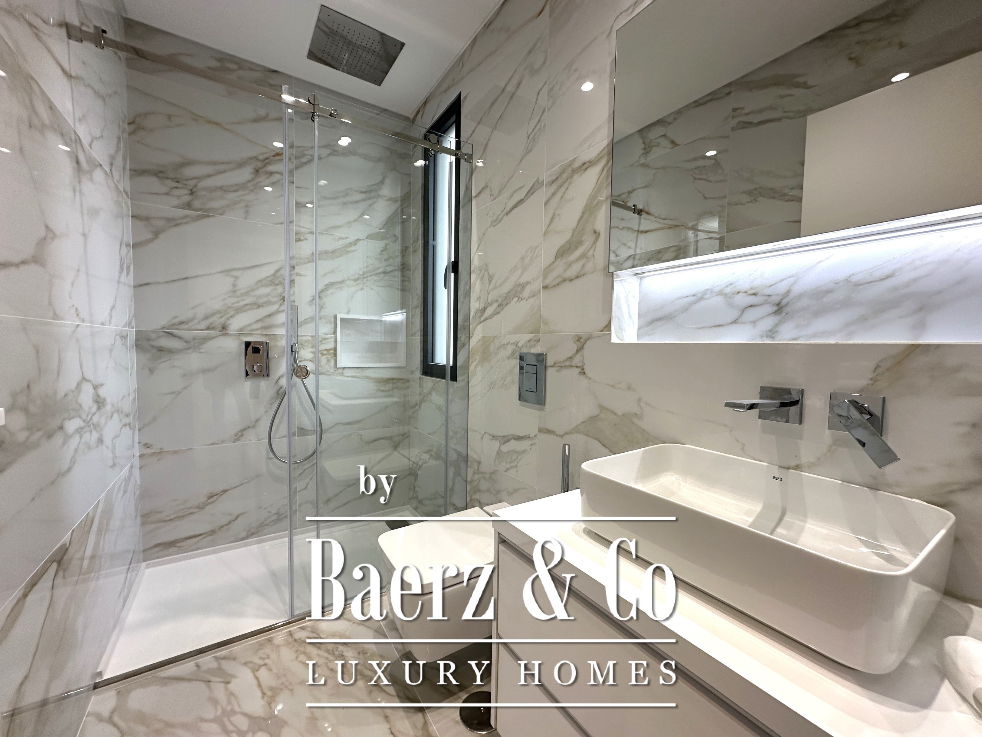 The expansive main level accommodates a 62 m² open living and kitchen area, suffused with natural light. Each of the four bedrooms is appointed as a suite, three on the ground floor ranging from 12 m² to 27 m², thoughtfully designed for comfort and flexibility. The absence of built-in wardrobes invites bespoke solutions, allowing the living space to adapt to individual requirements. On the upper level, a private 106 m² terrace offers a setting for outdoor leisure and panoramic views, complemented by an additional technical area.