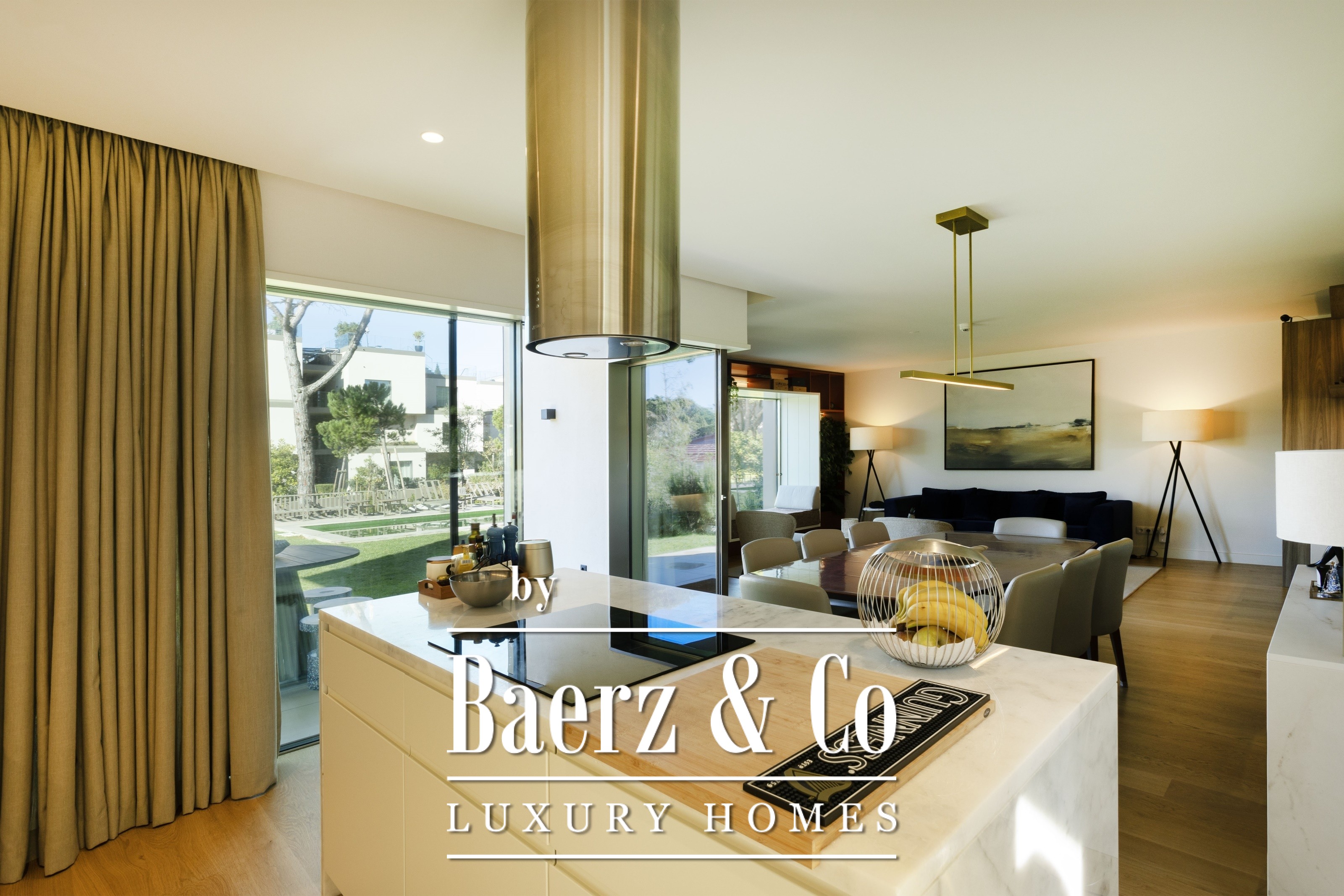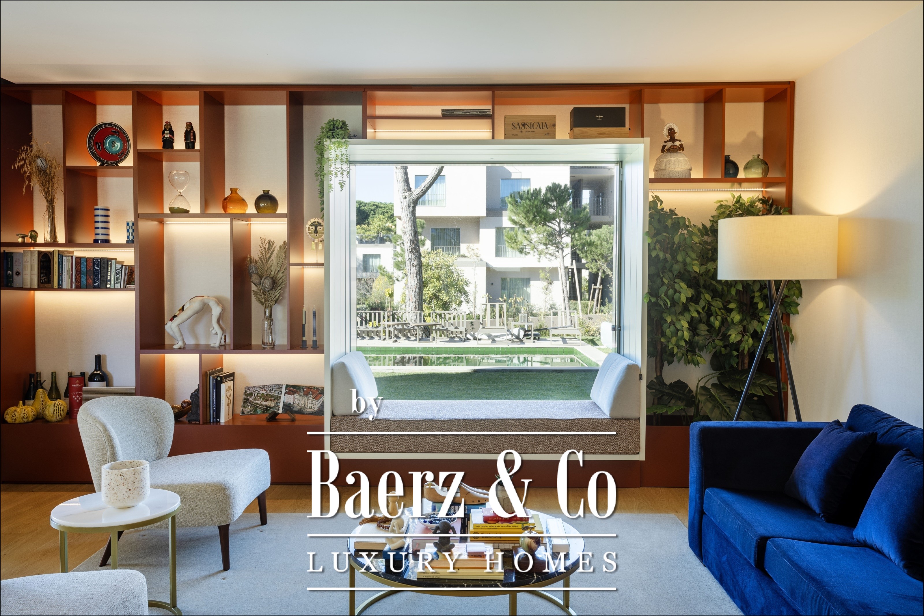 Apartment Cascais blends architecture and tranquility in the Marinha Prime Condominium, where design and privacy converge. This three-bedroom apartment, with 182 m² of private gross area, offers a seamless connection between interior living and a manicured 400 m² garden. Each bedroom is a suite, all with built-in wardrobes, underfloor heated bathrooms, and calming garden views. The living and dining rooms open to the terrace, a 33 m² space leading directly to a private heated swimming pool. A fully equipped kitchen adjoins a closed balcony, while a dedicated office, TV room, and laundry enhance daily rhythms. Air conditioning is present throughout, ensuring year-round comfort.
