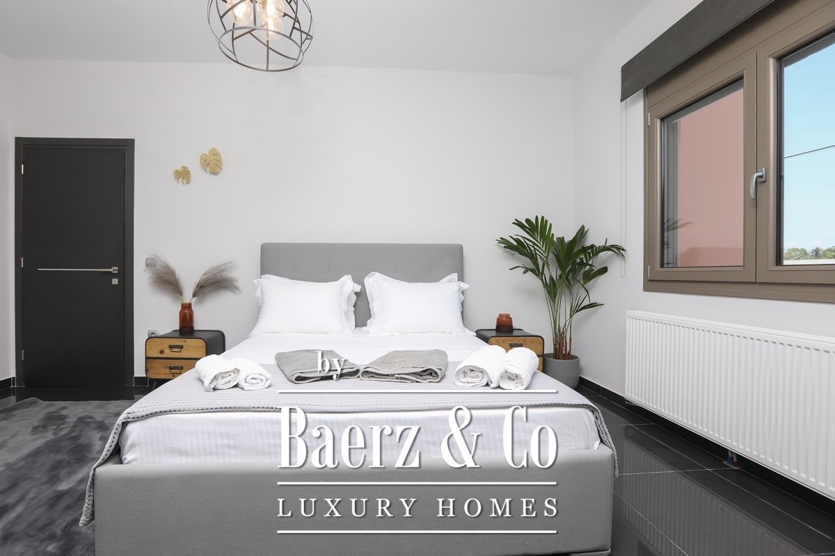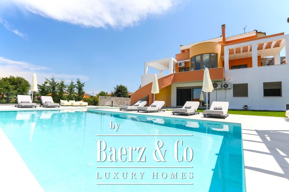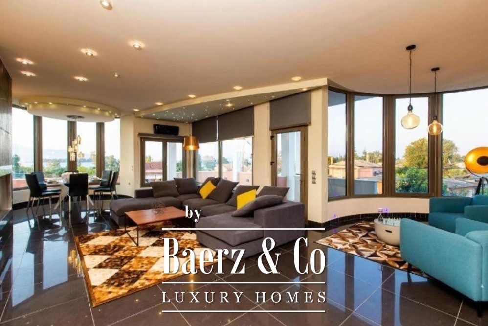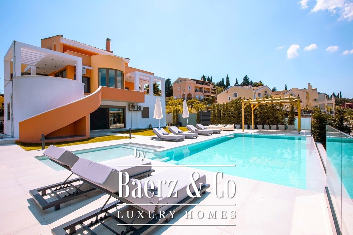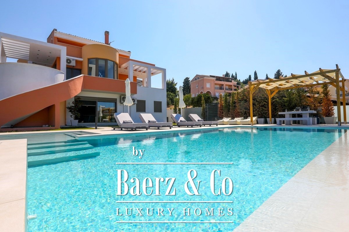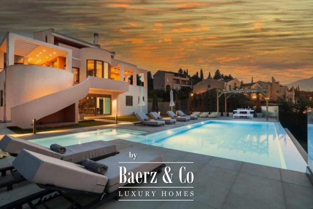 Villa Corfu offers a refined, contemporary statement in the northeast of the island, combining 497 m² of sophisticated living space with panoramic Ionian Sea views. This villa occupies a privileged plot of 1,073.59 m² in Alykes Potamou, less than four kilometers from Corfu town, the port, and international airport. The villa’s setting on a gentle hill assures privacy, with seamless access to renowned beaches including Kommeno and Paleokastritsa.