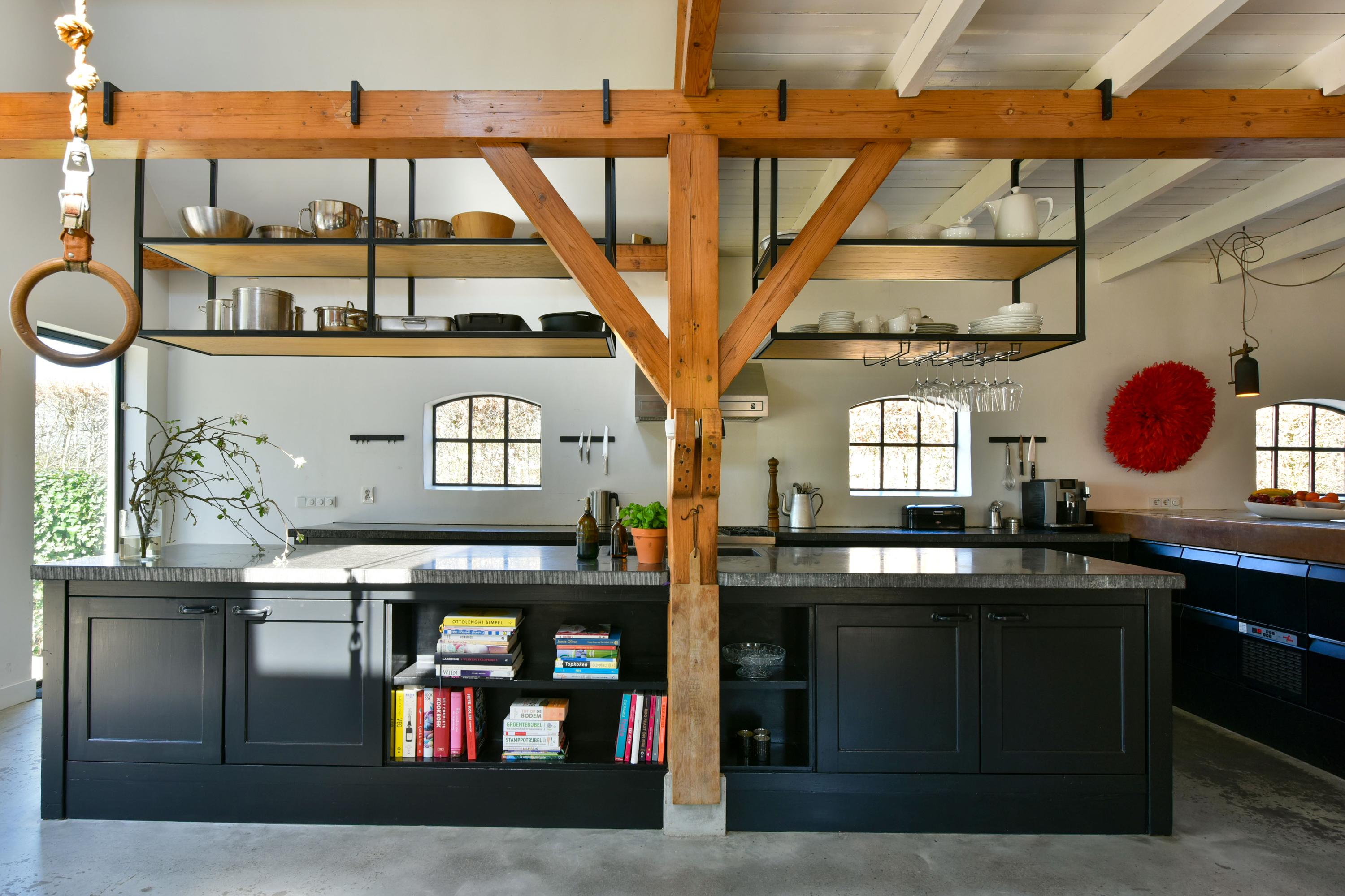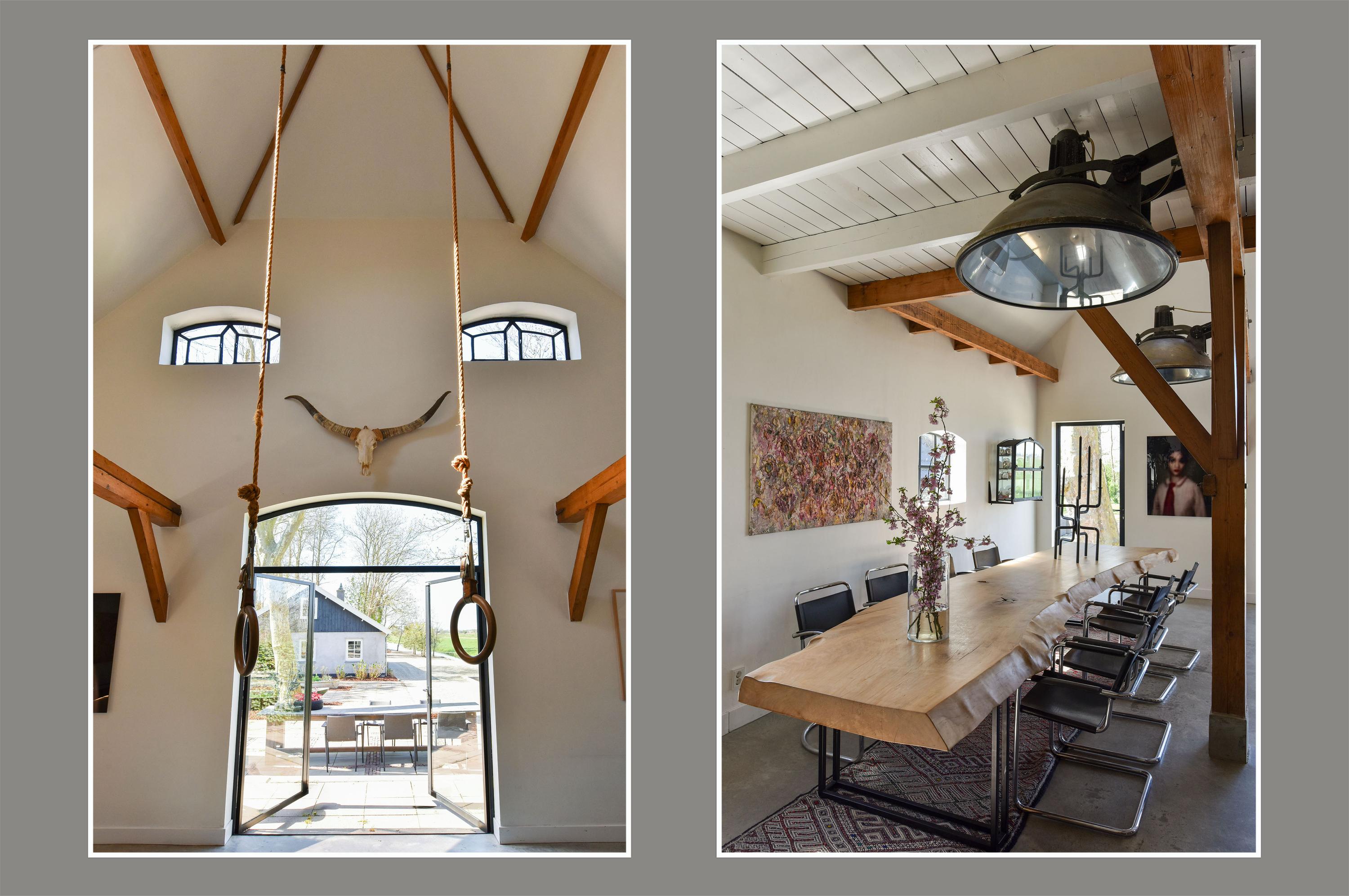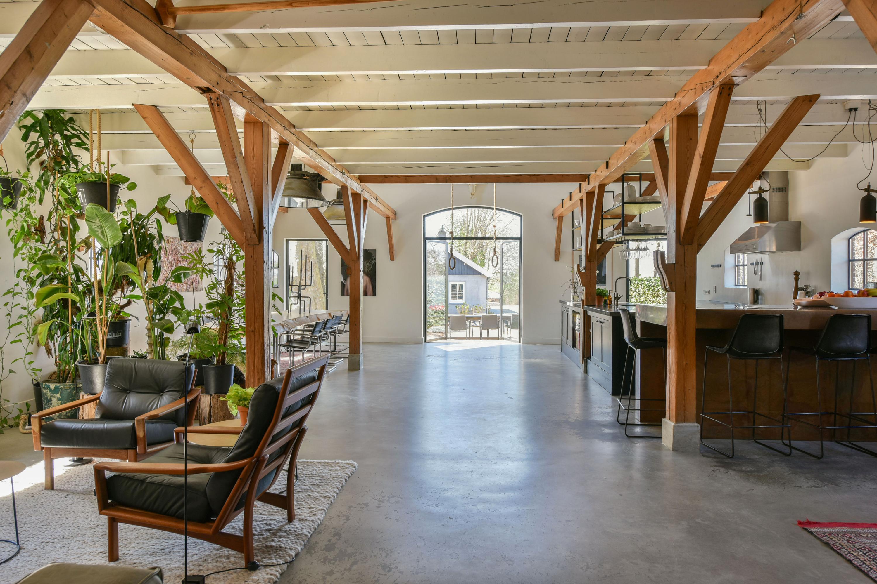 To the right, the former stable has been transformed into an impressive living room and kitchen. Original stable windows and charming wooden shutters to the former hayloft pay homage to the home's agricultural past. The concrete floor has underfloor heating, and sturdy gymnastic rings hang from the ceiling – a playful invitation to let your inner child roam free. Picture yourself swinging through the space with sunlight pouring in through tall windows – whether it’s your children playing or you taking a break from gravity, these unique details add real personality.