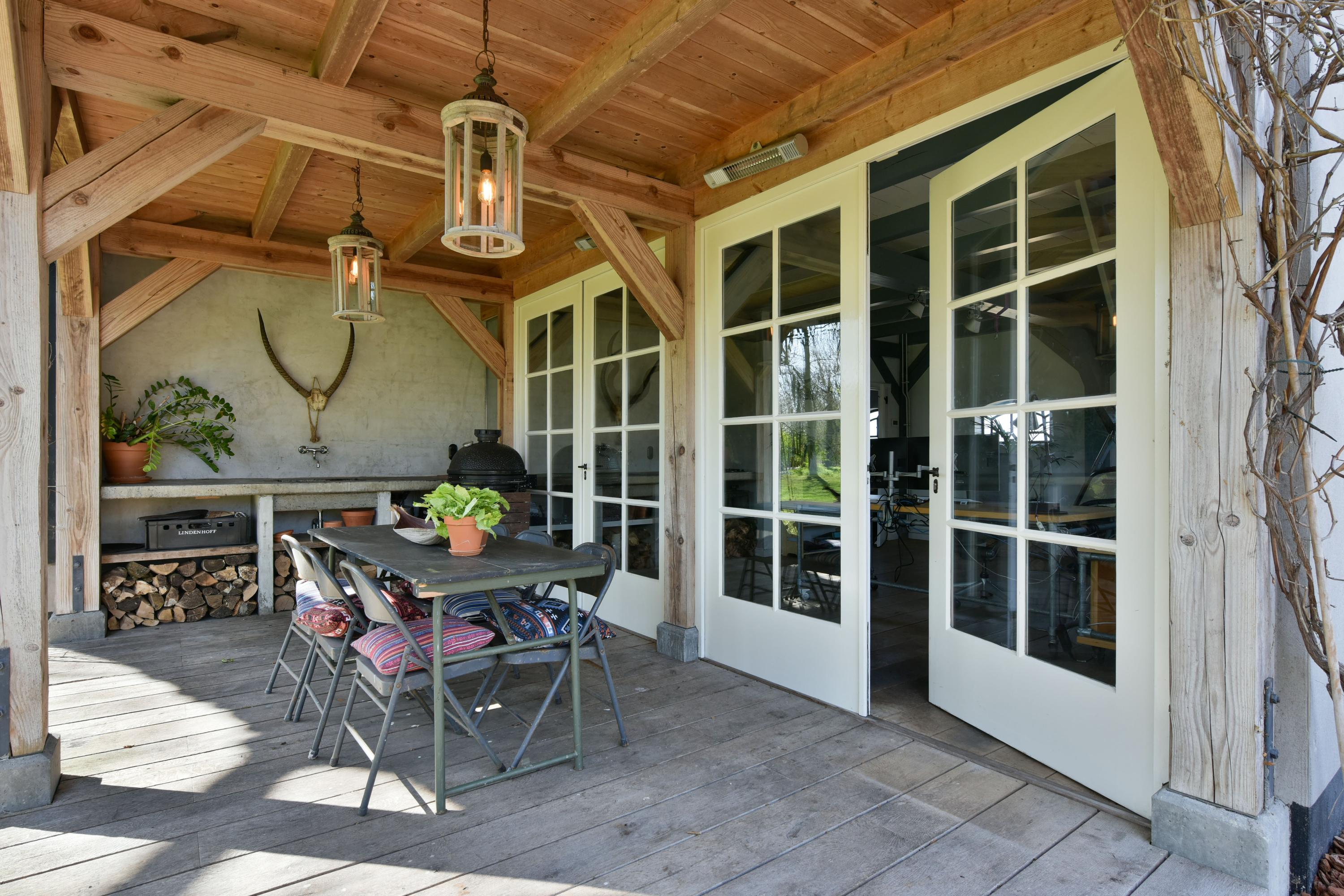 To the side of the house is a versatile and characterful outbuilding. Begin under the covered area, where a unique outdoor kitchen immediately catches the eye. The countertop seamlessly runs from outside to inside, serving as both outdoor and indoor workspace – a stylish, practical detail.