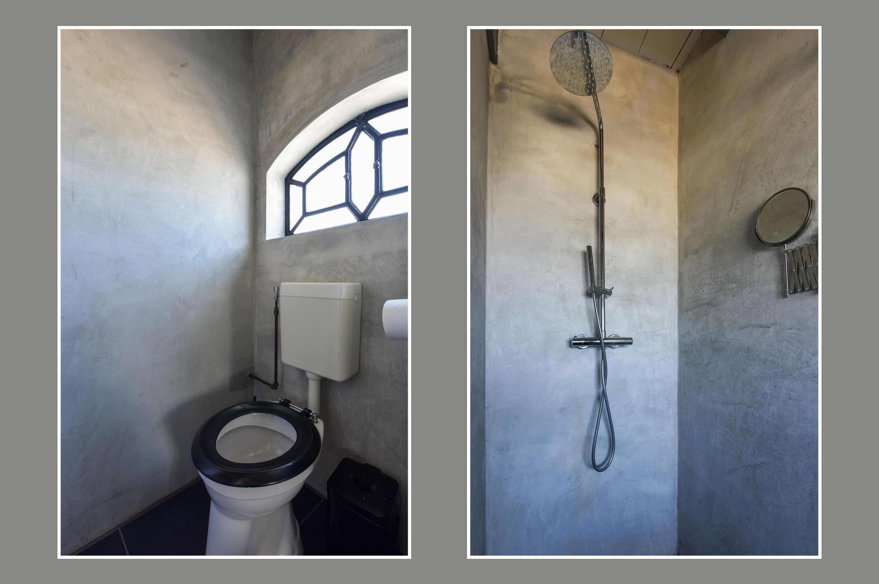 The former hayloft is now an impressive primary suite. A dormer window brings in plenty of light, while the adjacent walk-in closet is a dream come true. The open-plan bathroom adds style and edge, featuring a zinc bathtub as the focal point, a spacious zinc shower tray with rain shower, and a stone basin vanity. A separate toilet offers privacy.