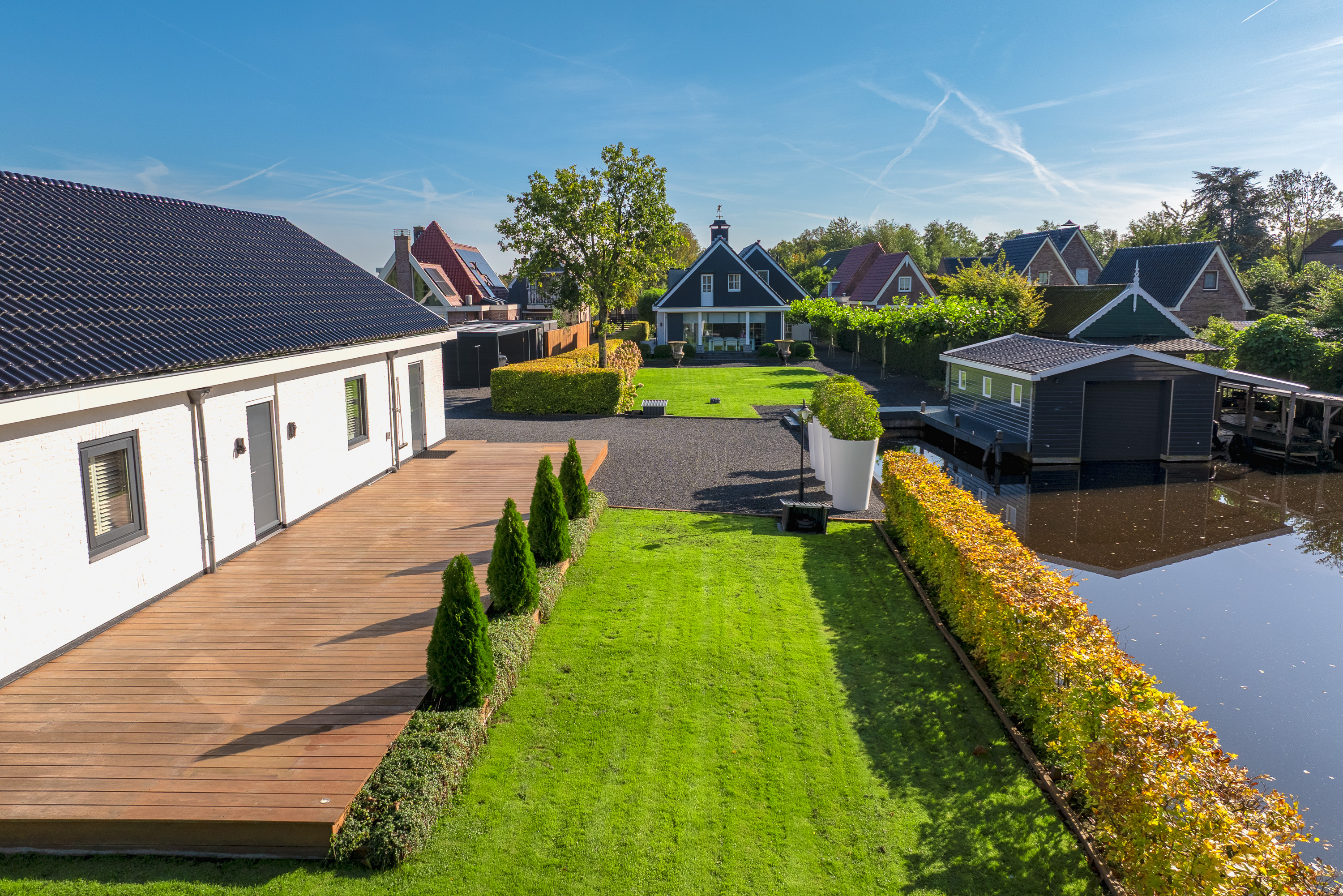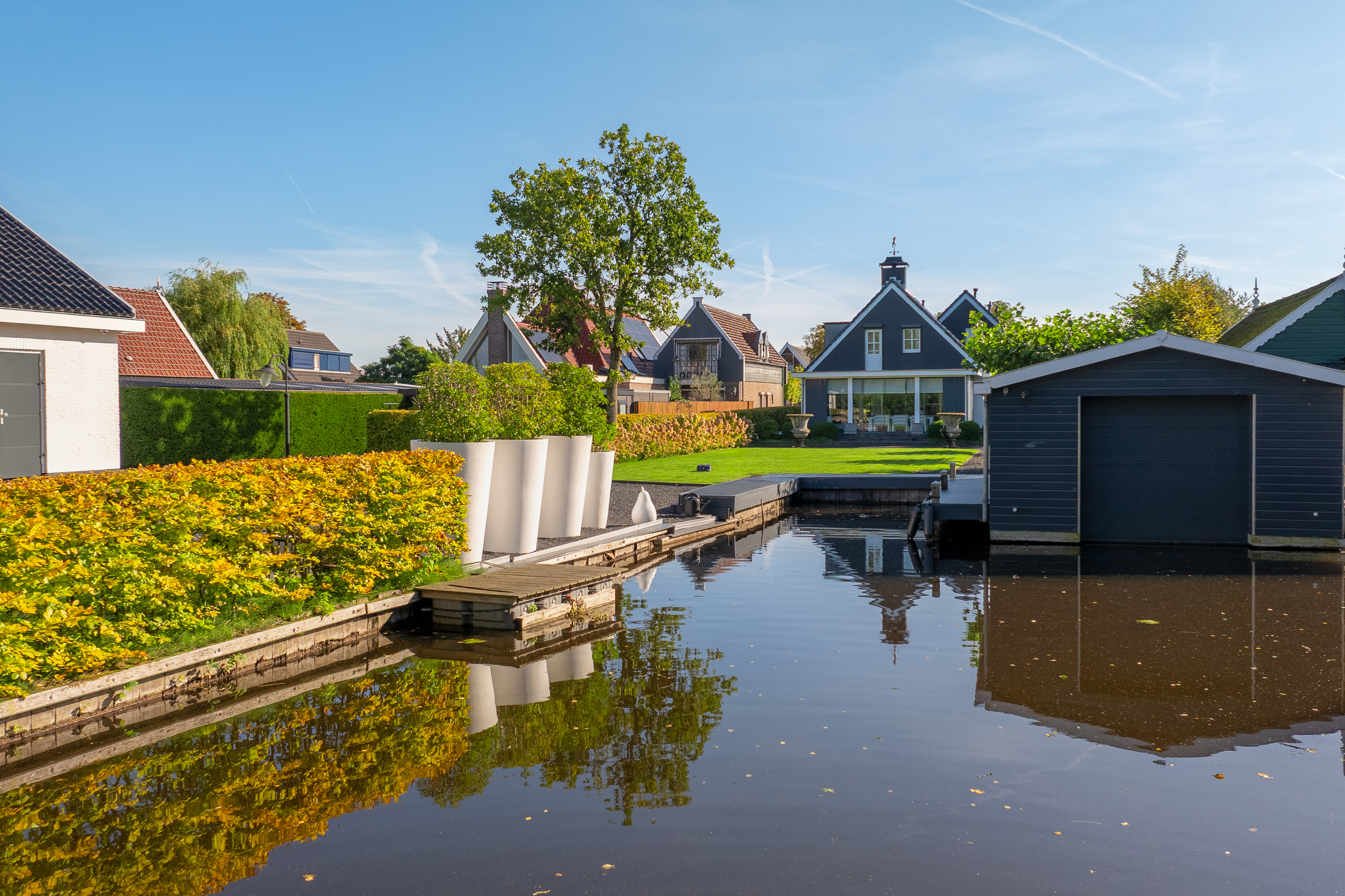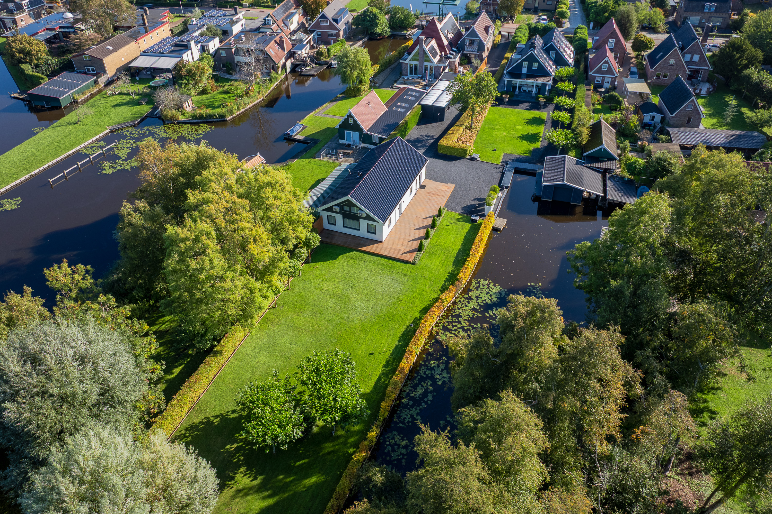The beautifully landscaped garden is an oasis of peace and elegance. Sleek terraces, mature trees, and perfect positioning toward sun and water create an environment where privacy and relaxation take center stage. From the private boathouse, you step directly into your boat for a trip across open waterways — from Het Twiske to the canals of Amsterdam.