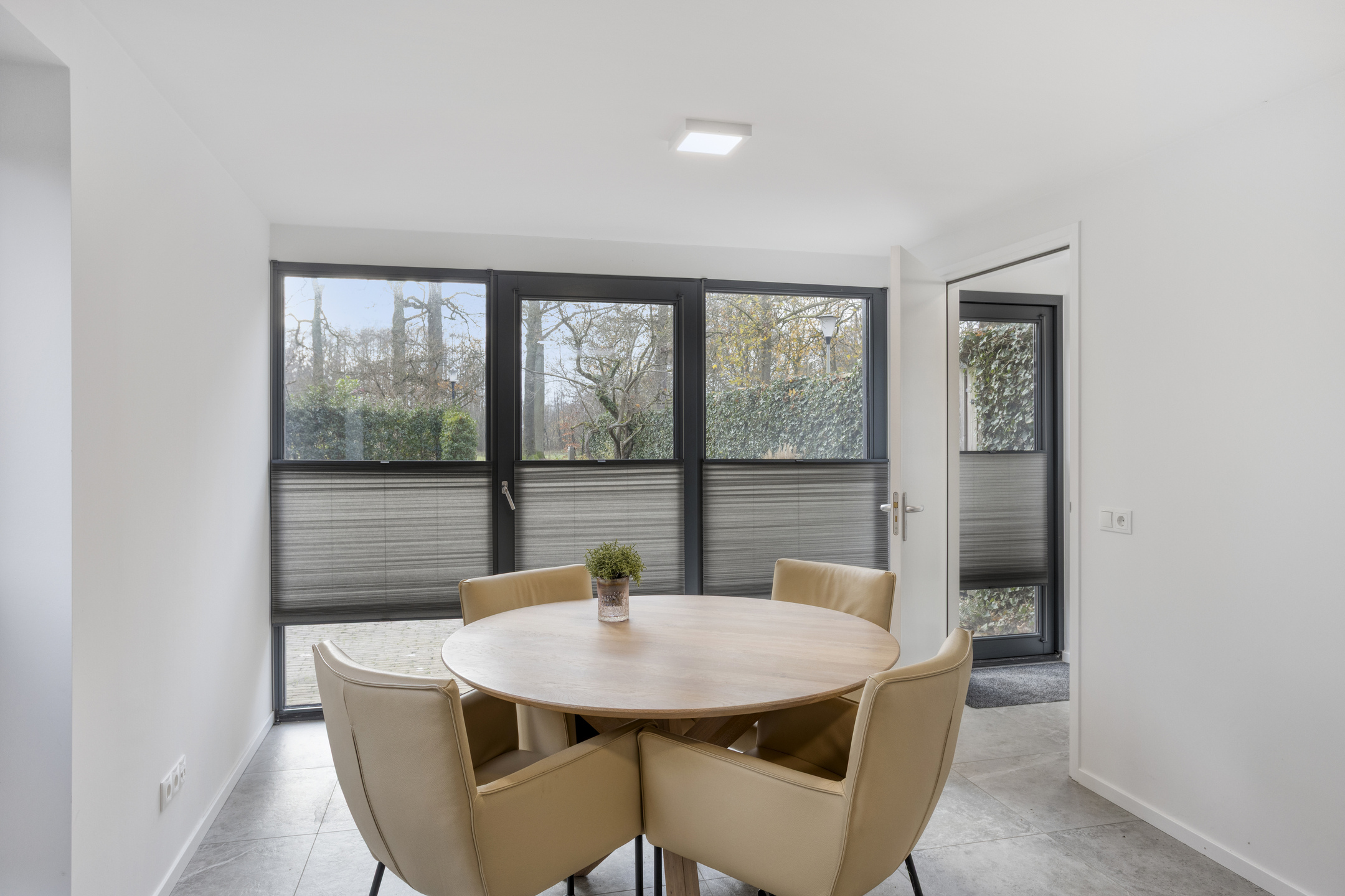 Via de hal kom je in de eetkamer, een lichte en uitnodigende ruimte dankzij de grote schuifpui. De eetkamer is voorzien van een houtkachel. Hier bevindt zich ook de trapopgang naar de eerste verdieping. Vanuit de eetkamer loop je door naar de woonkamer en de keuken. De woonkamer is ook voorzien van een sfeervolle houtkachel. De dichte keuken heeft een speels effect dank zij de bar aan het keukenblad. De keuken is uitgerust met diverse inbouwapparatuur, waaronder een 4-pits inductiekookplaat met afzuigkap, oven, koelkast, vaatwasser, stoomoven, warmhoudlade en een keukenboiler.