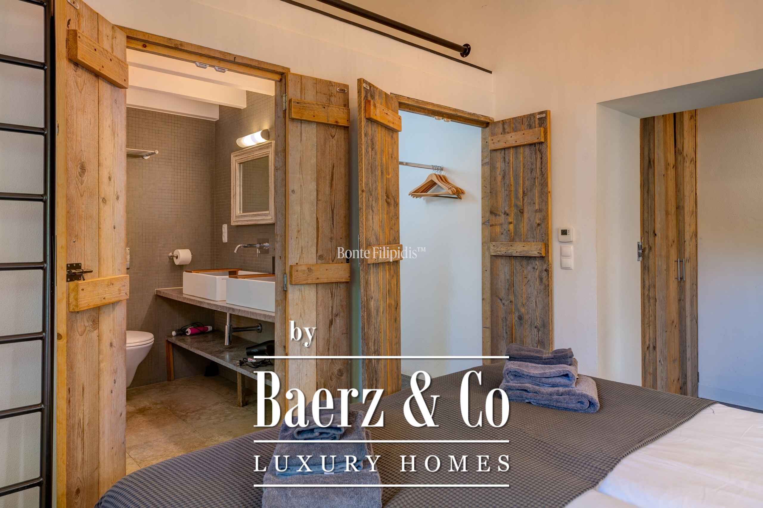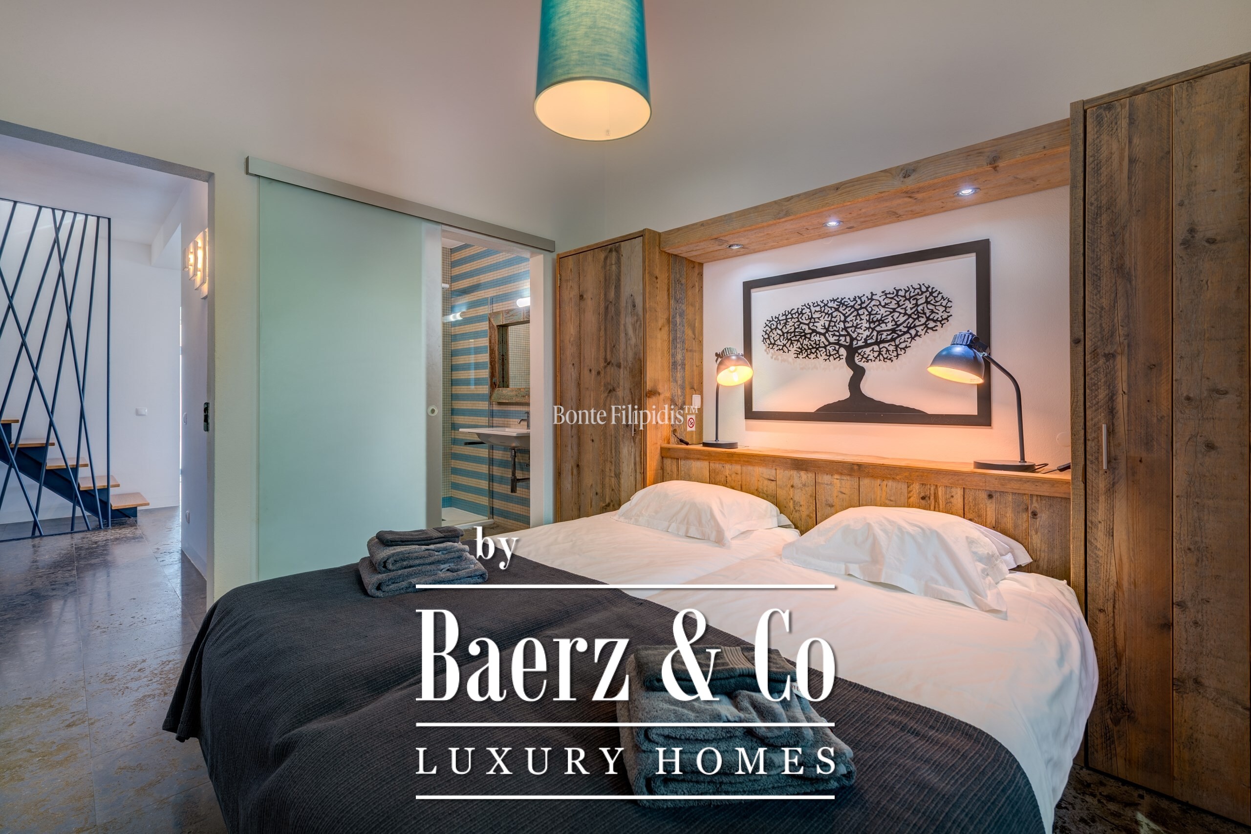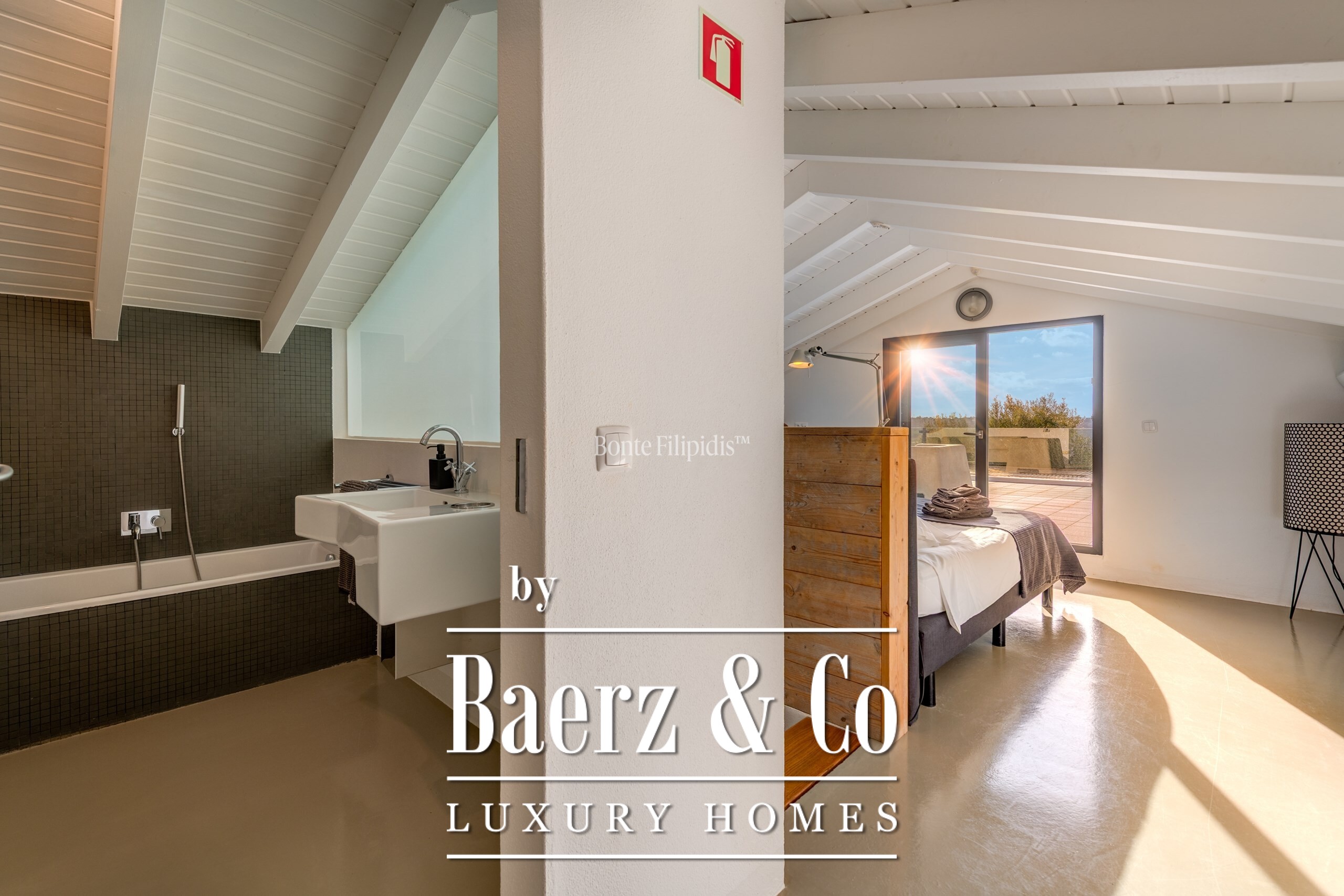 Set on a 2,440 m² plot, mature olive groves and vineyards frame landscaped gardens, while a private pool and jacuzzi for six evoke privacy and ease. Energy efficiency defines the experience, with a 48-panel photovoltaic system, underfloor heating, and a Salamander fireplace offering year-round comfort. Indoors and out, fully equipped kitchens anticipate both quiet mornings and convivial gatherings.