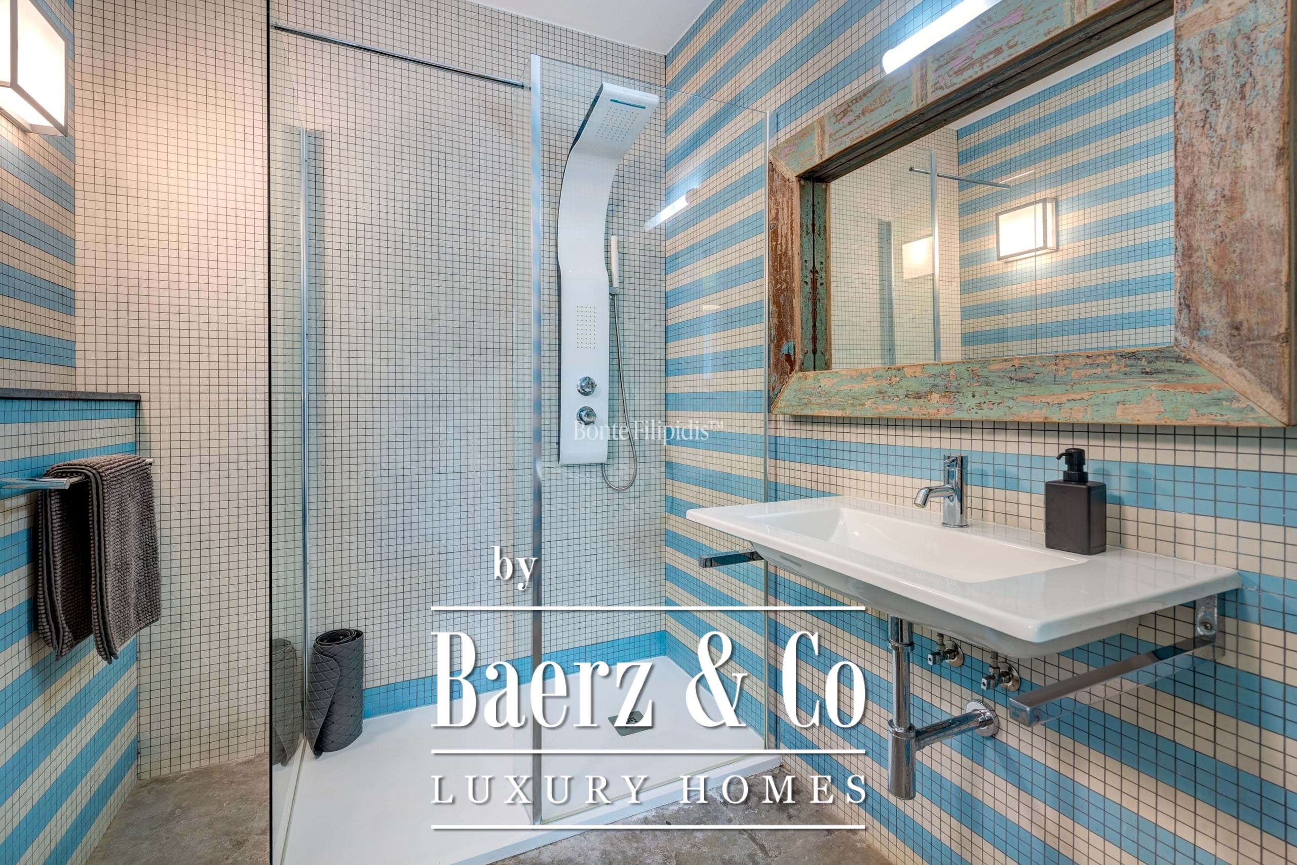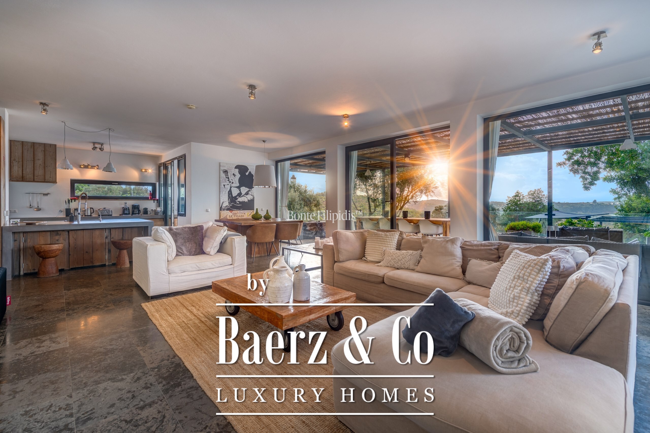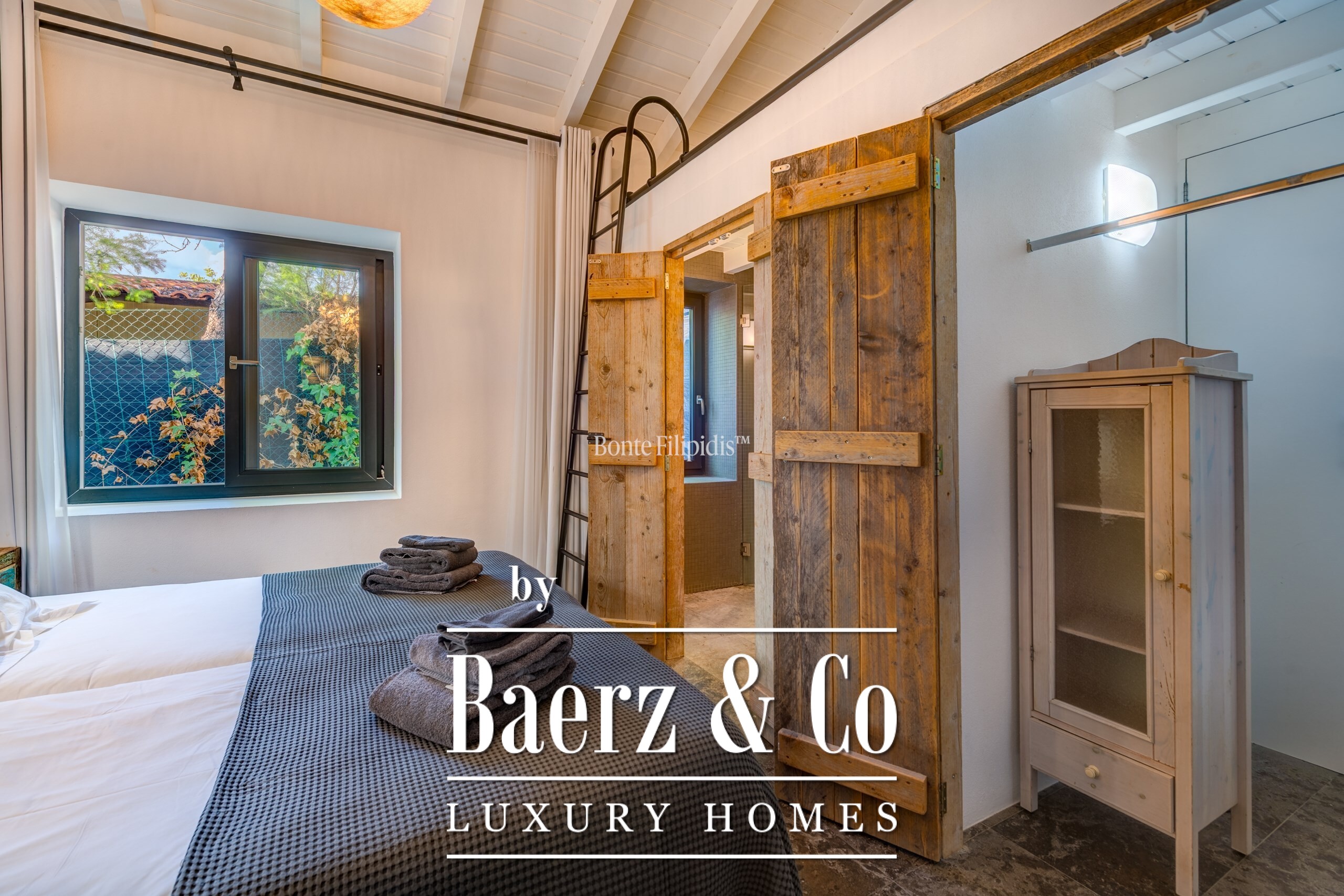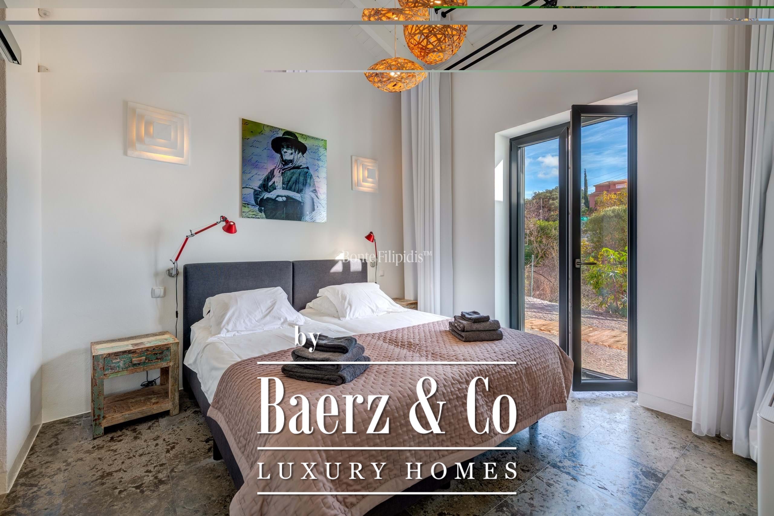 Set on a 2,440 m² plot, mature olive groves and vineyards frame landscaped gardens, while a private pool and jacuzzi for six evoke privacy and ease. Energy efficiency defines the experience, with a 48-panel photovoltaic system, underfloor heating, and a Salamander fireplace offering year-round comfort. Indoors and out, fully equipped kitchens anticipate both quiet mornings and convivial gatherings.