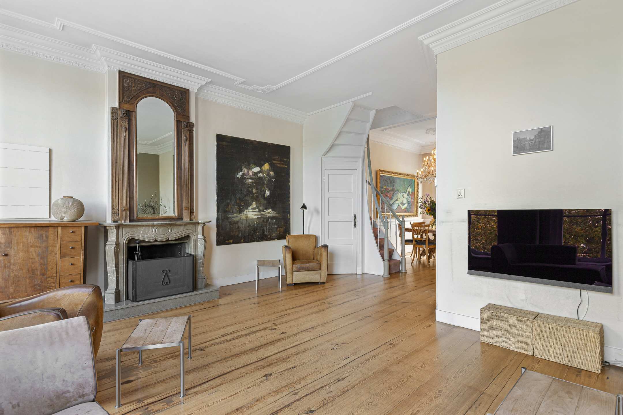 The distinguished façade with its golden lion heads, central risalit, and six-pane sash windows exudes timeless elegance. Inside, a wealth of original details awaits: high ornamental ceilings, wide antique wooden floors, refined paneling, and marble fireplaces. Spread across four spacious floors are nine generously sized rooms and three stylish bathrooms – a remarkable blend of practicality and grandeur.