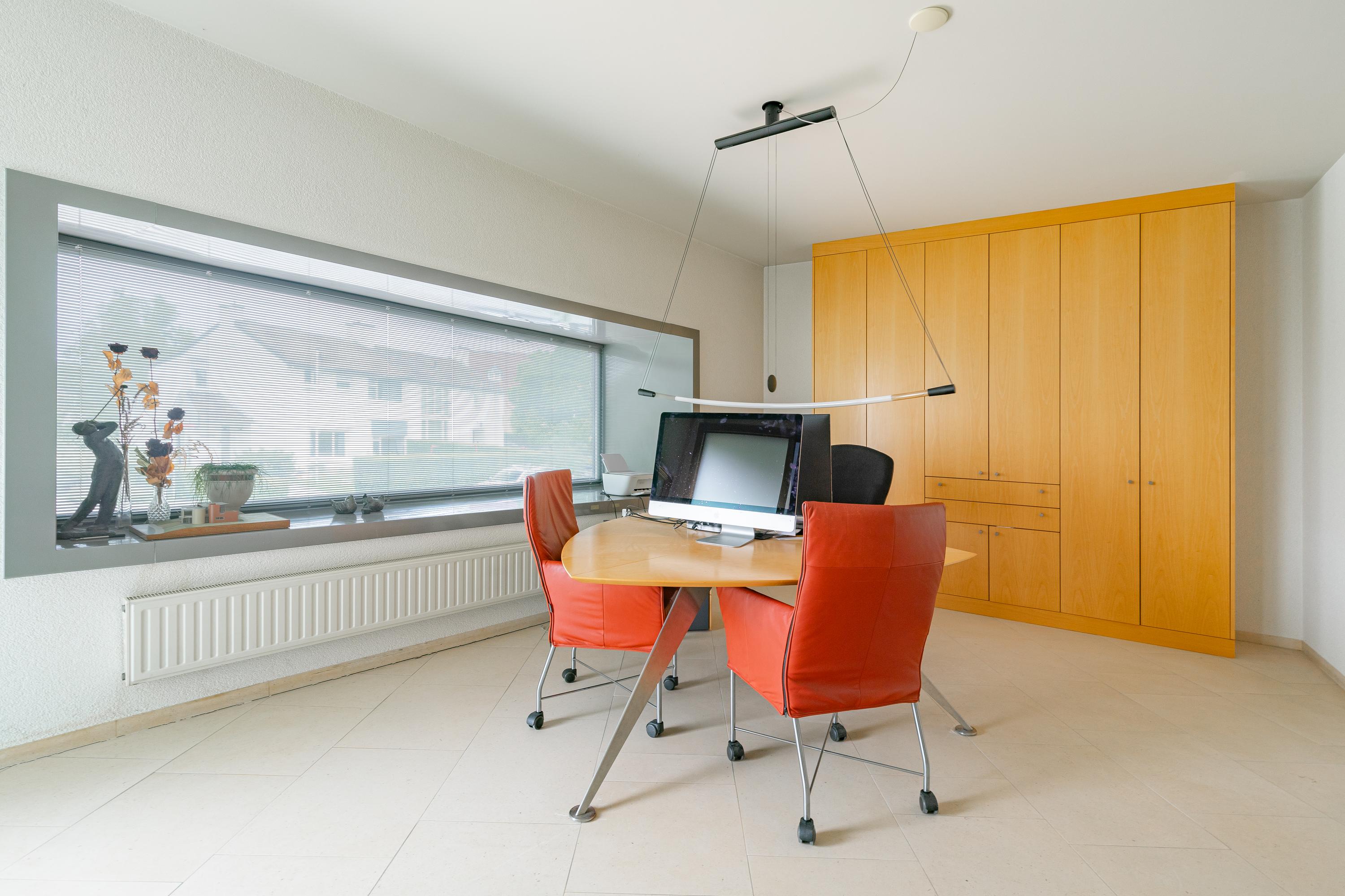Natural stone stairs to the covered entrance. The spacious reception hall with lots of light provides access to the basement and the first floor. To the left of the hall is the meter cupboard and spacious toilet. The toilet is equipped with floating toilet and stone sink. The spacious toilet room is prepared with a walk-in shower and can serve as a bathroom if the office space is used as a bedroom. Directly adjacent to the hall is located at the front of the villa the office space with a beautiful bay window overlooking the Caumerdalschestraat. An impressive hard glass pivot door to ceiling height provides access to the beautiful living room. The over three meter high ceilings and generous glass doors at the rear of the living room feature two sliding elements.