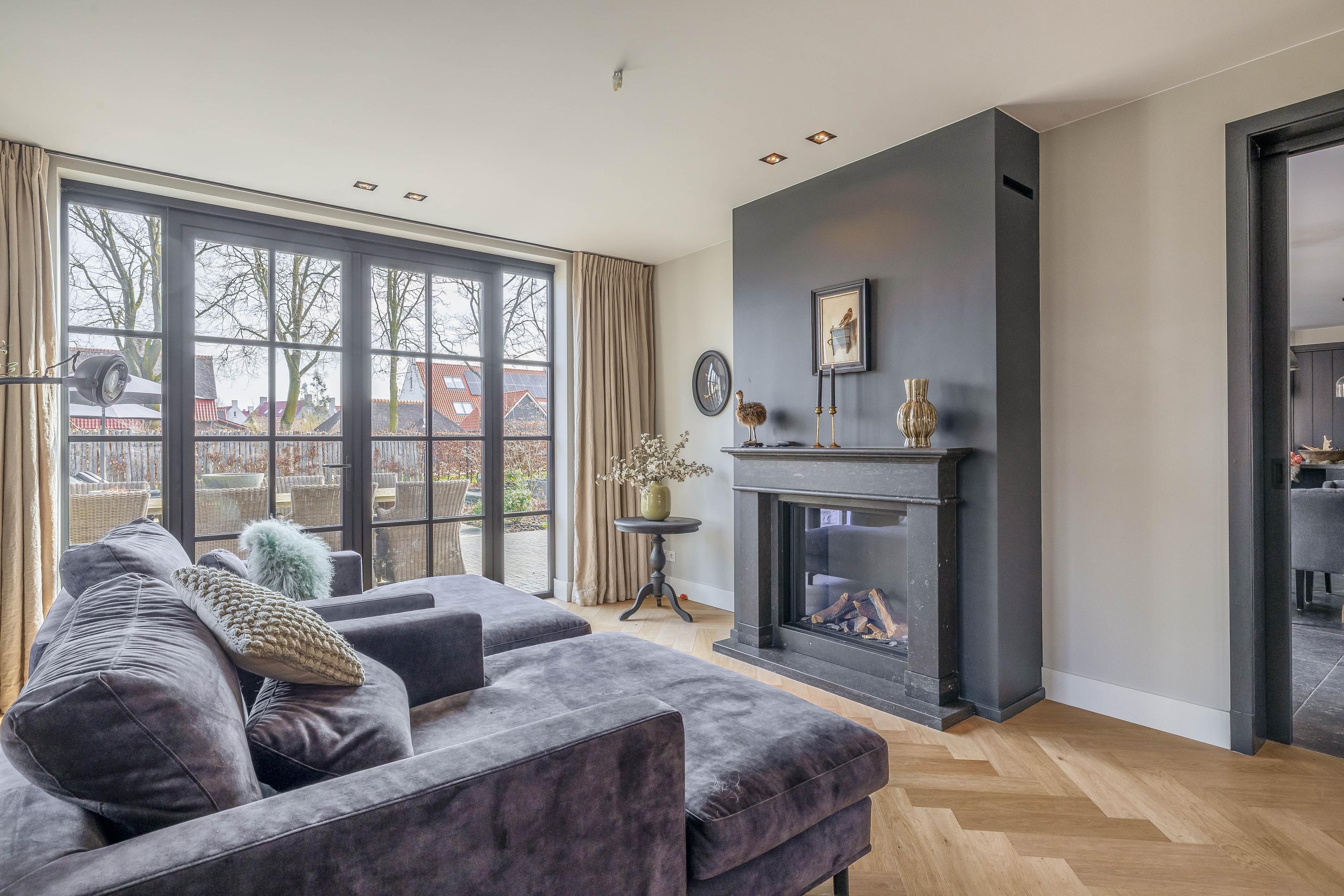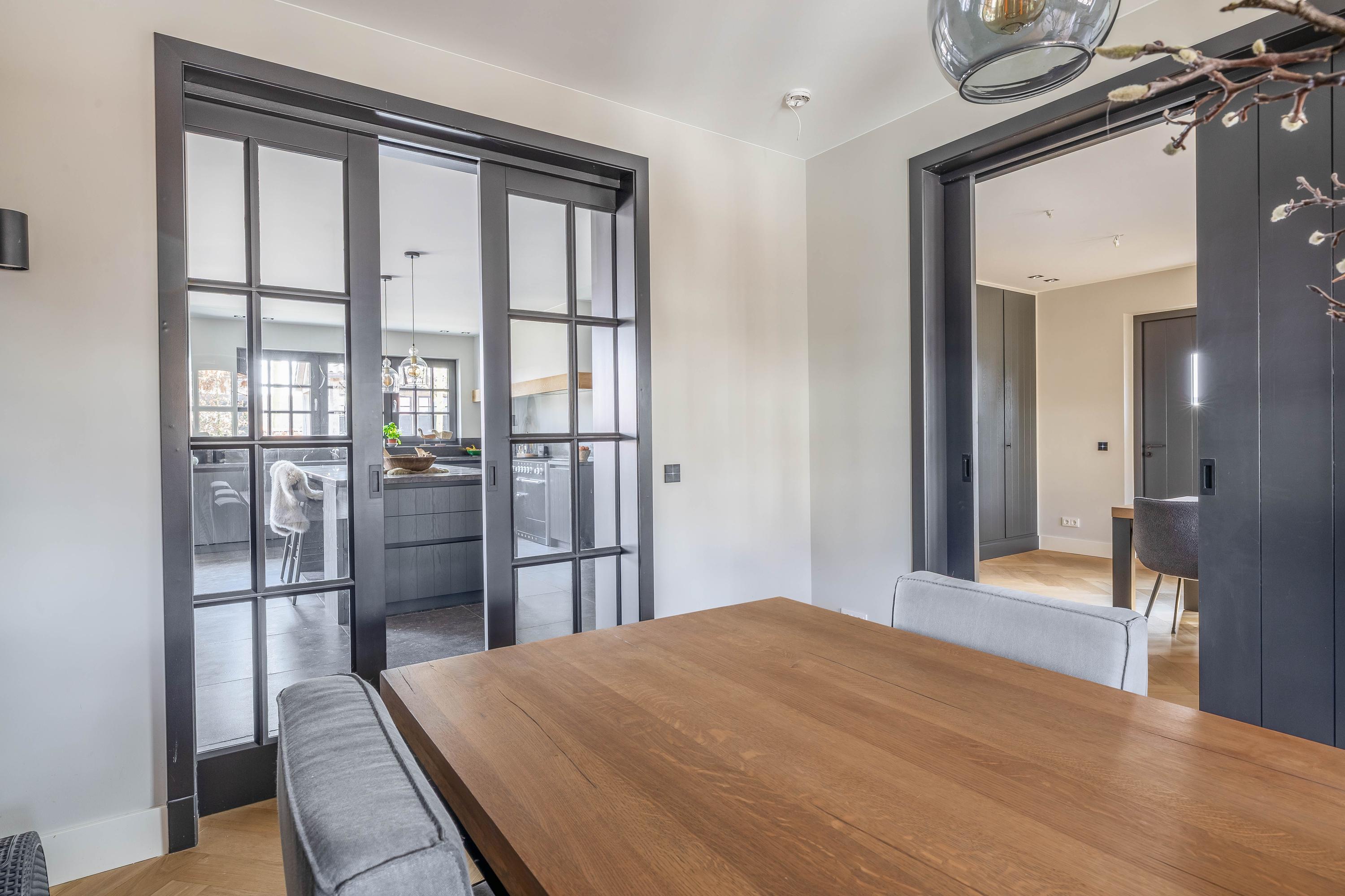 Through the entrance, you reach a hall that provides access to a storage cupboard beneath the staircase, the fuse box, a wardrobe cupboard, and a staircase leading to the first floor. The expansive living room, complete with a gas fireplace and large windows, forms the heart of the ground floor. From the living room, garden doors lead directly to the enchanting rear garden, where the terrace offers a perfect seamless connection between indoor and outdoor living. The spacious kitchen/dining room, equipped with a corner layout, an island, and high-end built-in appliances (such as a Quooker, dishwasher, exclusive cooking unit, oven, and extractor hood), allows you to enjoy culinary experiences at the highest level. A side entrance with a generous vestibule features a toilet, storage area, and practical built-in cabinets, with direct access to the garden via a service door.