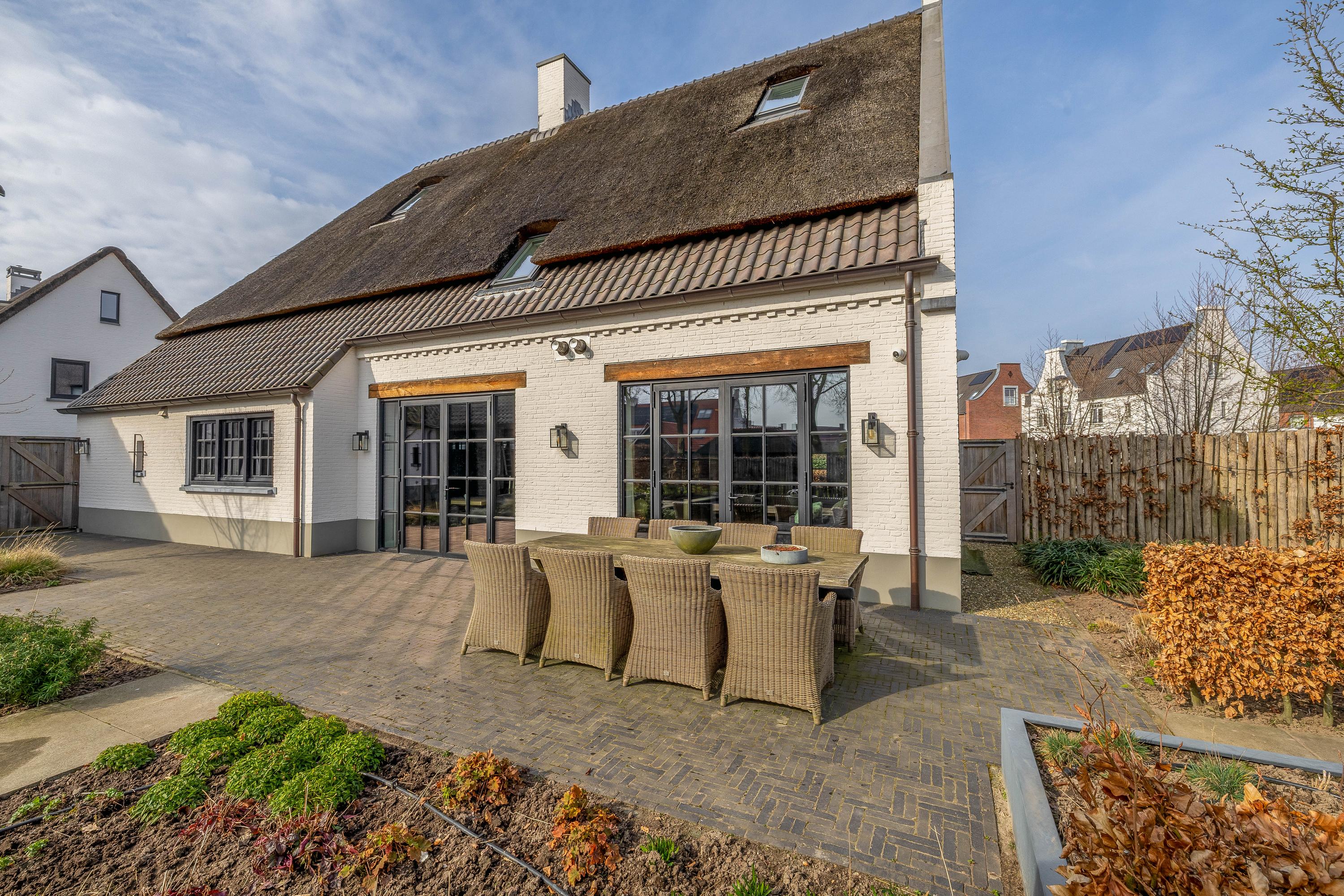 The farmhouse exudes class with its partly thatched roof, distinctive mullioned windows, and striking brickwork. Upon entering, an elegant foyer immediately grants access to high-quality materials and a spacious living environment. Both the generous windows and the atmospheric gas fireplaces in the living room and kitchen/dining area allow abundant daylight to filter in, creating a warm ambiance that invites you to experience optimal living pleasure.