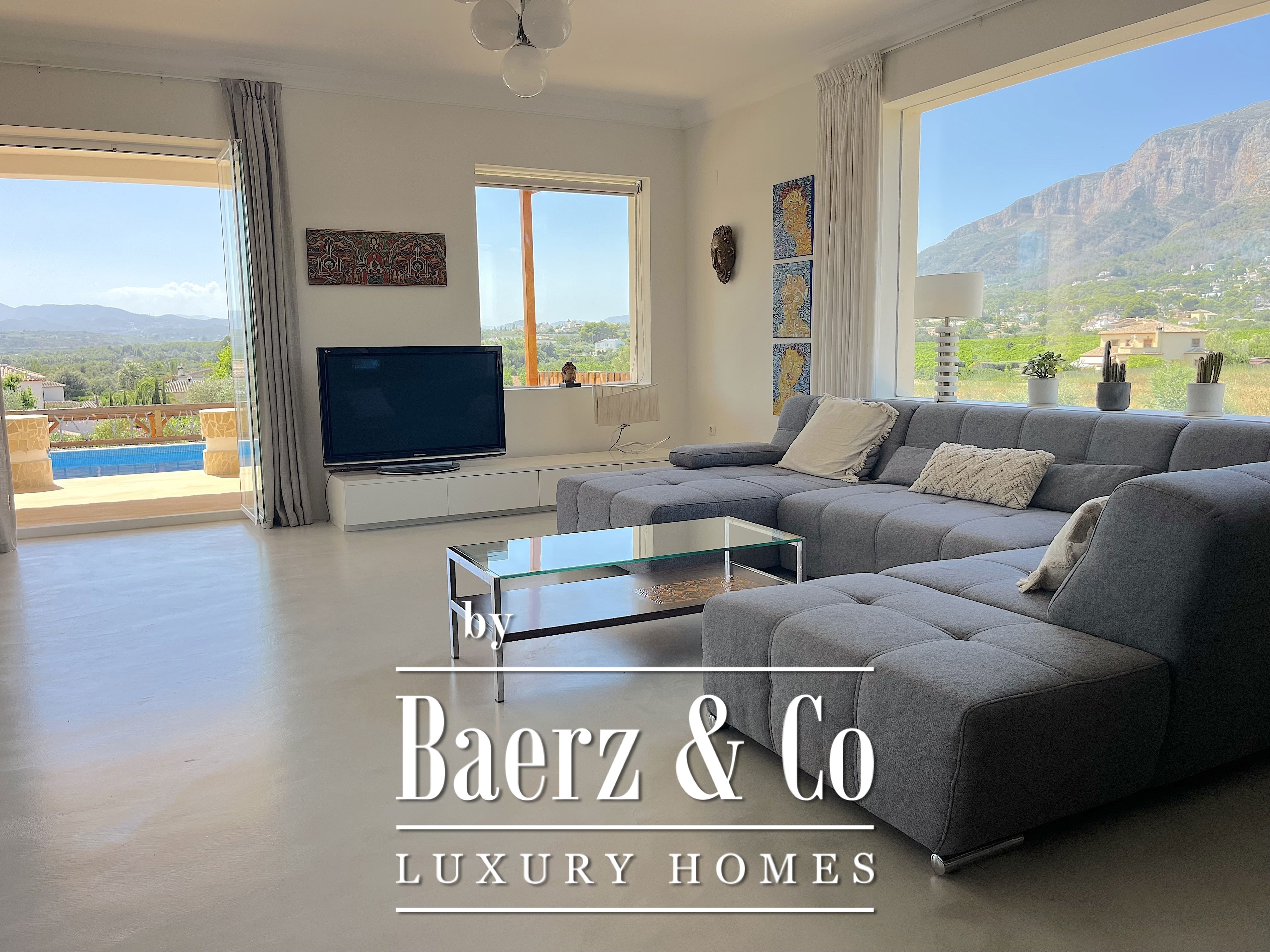 Set on a former olive grove of 1,700 m², the finca enjoys uninterrupted views of the lush green valley and the majestic Montgó Mountain.
