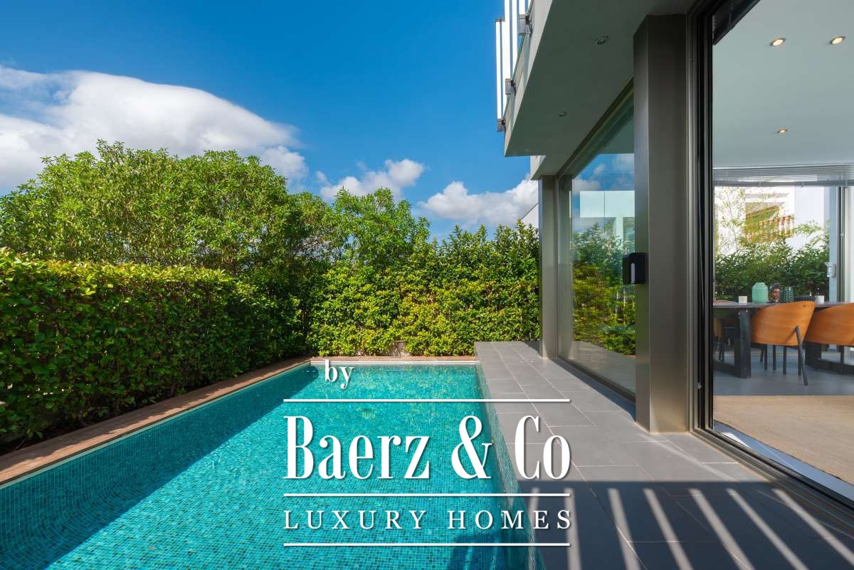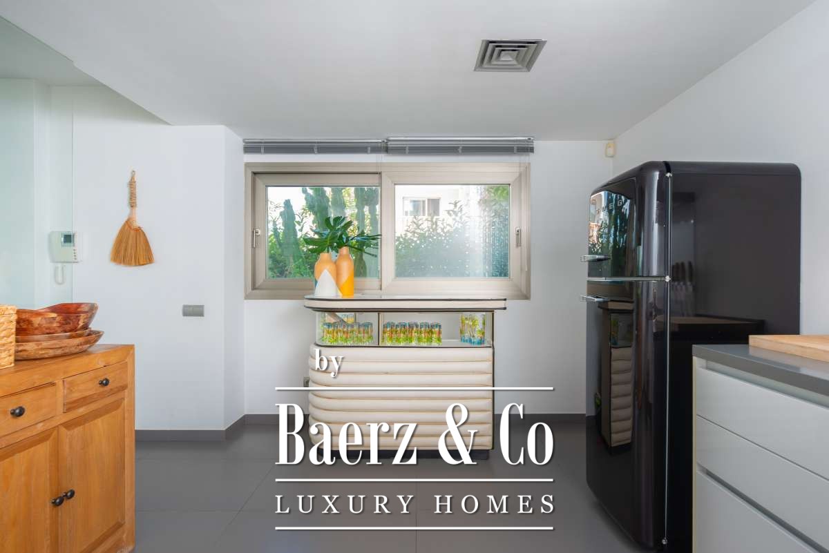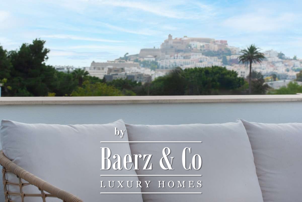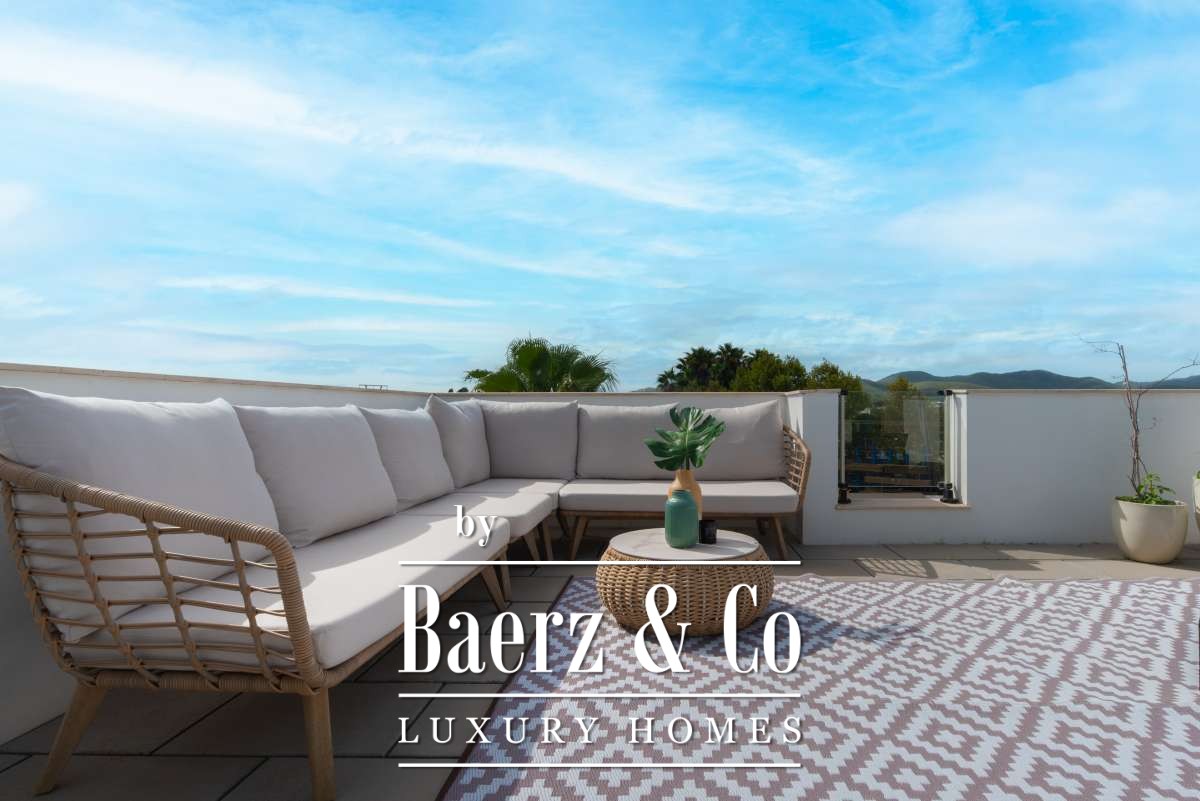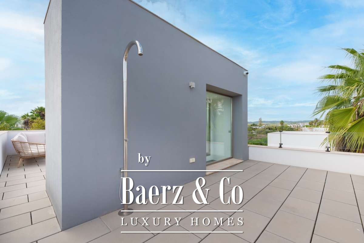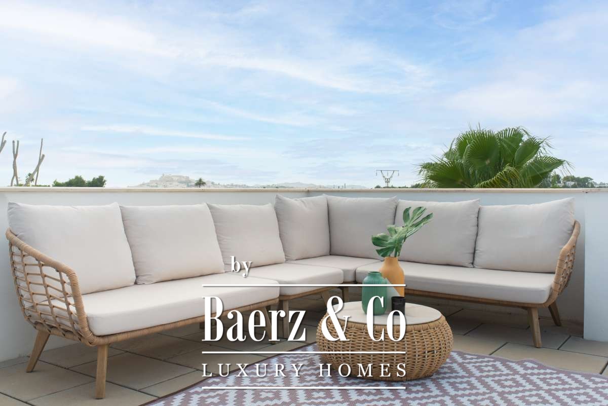bedroom features an ensuite bathroom and a spacious, serene atmosphere thanks to large windows. The second bedroom has its own balcony, perfect for enjoying the morning sun and peaceful surroundings. The third bedroom is versatile and can serve as a guest room, children’s room or home office. These two bedrooms share a bathroom. All rooms are bright and inviting, with practical layouts that offer flexibility for your personal living needs.The outdoor SpaceThe outdoor area surrounding the private pool is designed for relaxation and summer enjoyment. Here you can enjoy sunny days on the loungers, dine outdoors or host cosy evenings with friends and family by the barbecue. The highlight of this property is the spacious rooftop terrace. From here you can enjoy panoramic views over the surroundings and the iconic silhouette of Dalt Vila in the distance – a magical setting for breathtaking sunsets. The rooftop terrace also features an outdoor shower, perfect for cooling off on warm summer days or after a morning yoga session under the blue sky.This townhouse in Jesús offers a relaxed, move-in-ready living experience where indoor and outdoor life blend harmoniously. An ideal home for those seeking comfort, atmosphere and the ultimate Ibiza lifestyle all year round.