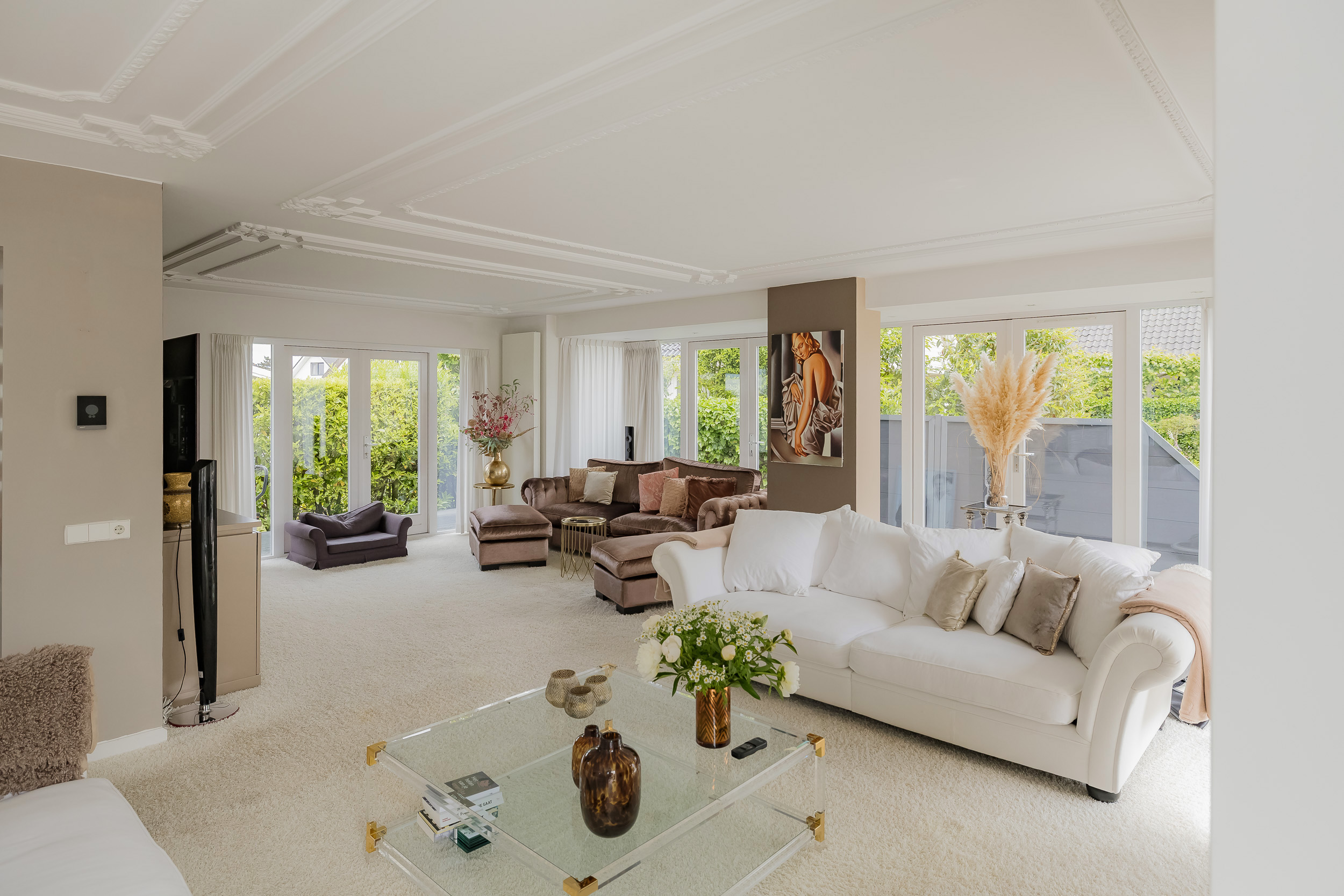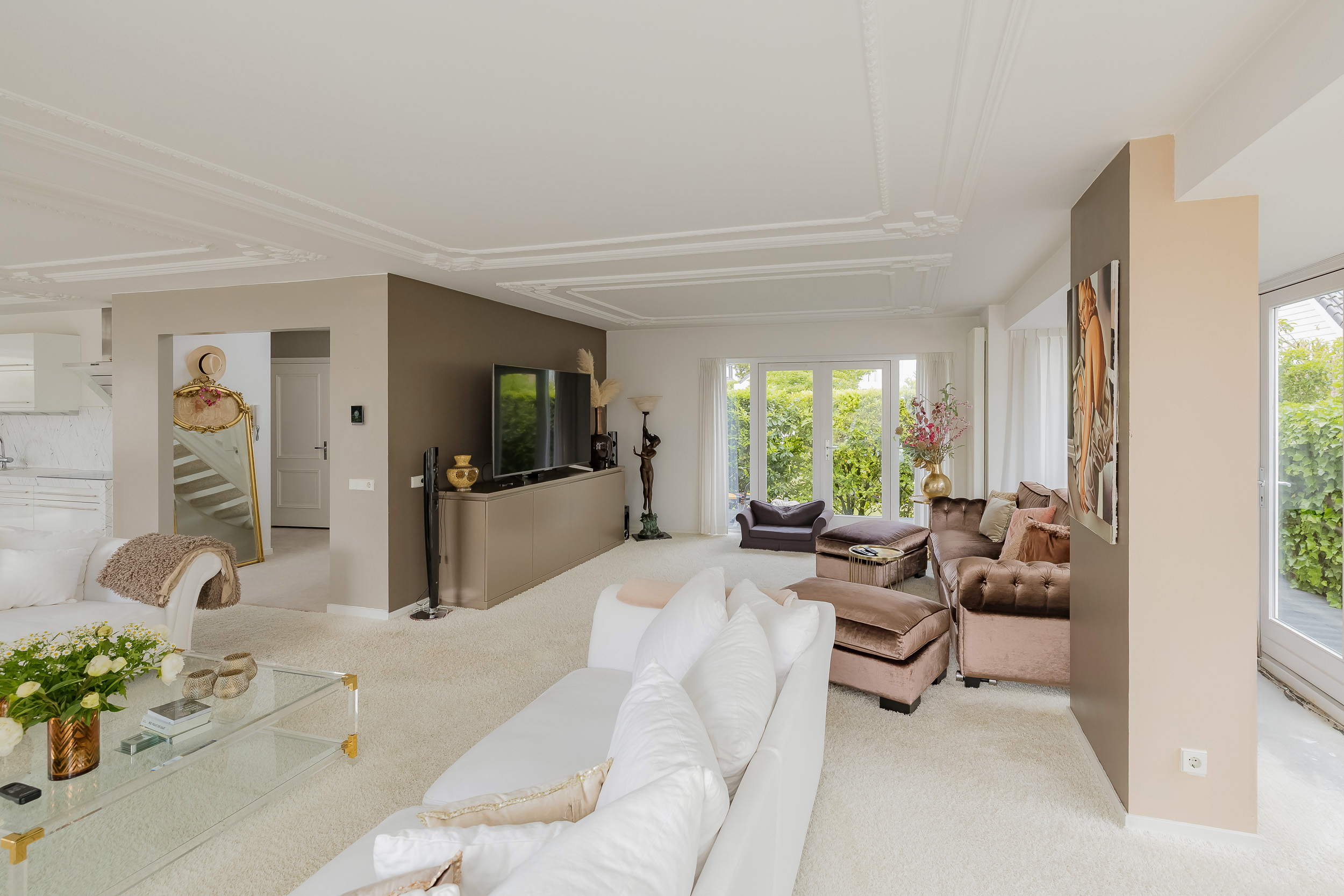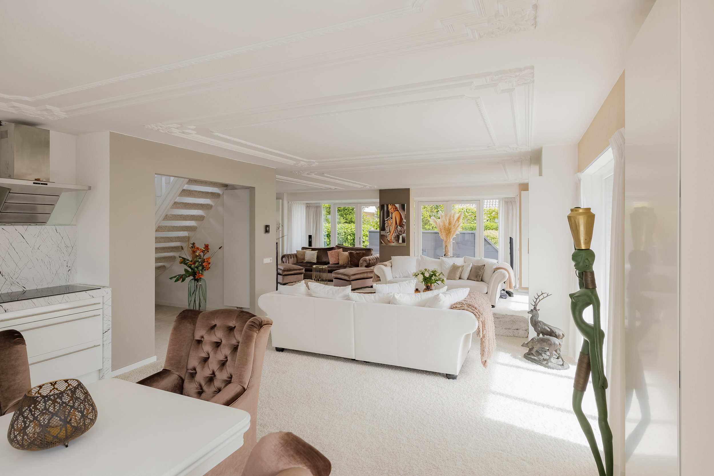 You enter the house through a generous hallway with loft and the staircase upstairs. A checkroom niche with toilet and meter cupboard provide a practical layout. The living room is spacious, bright and cozy and features a large bay window, classic decorative moldings on the ceiling and a cozy gas fireplace. Thanks to three pairs of double doors and a sliding door, the living room is in direct connection with the sunny terrace on the water.