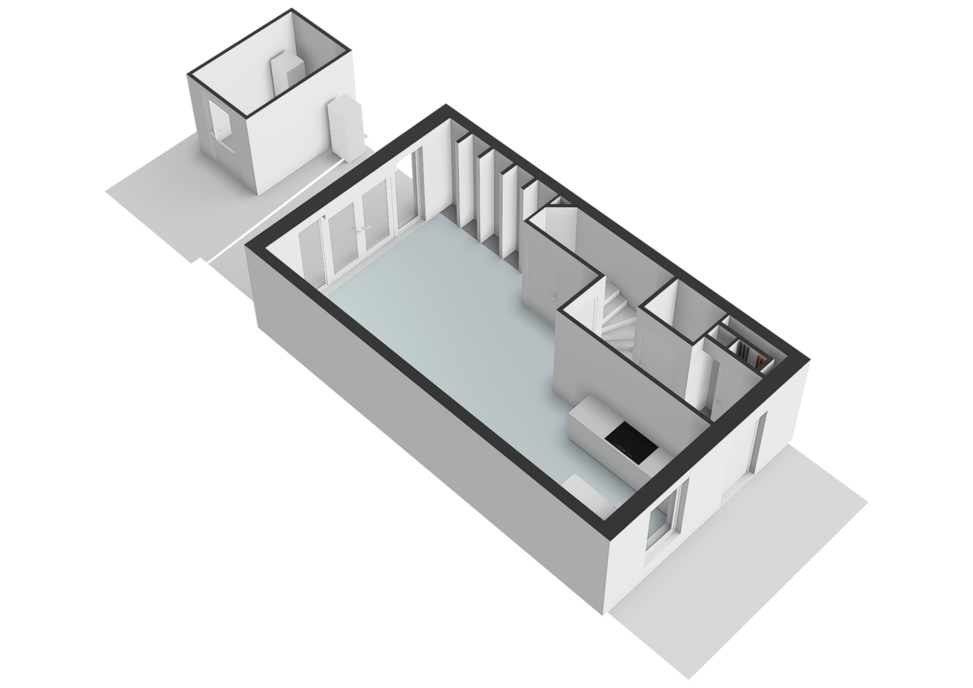 A fixed staircase leads to the second floor. Here you will find two additional full-sized bedrooms, both with natural light. There is also a separate space with connections for a washing machine and dryer, as well as the technical installations.
