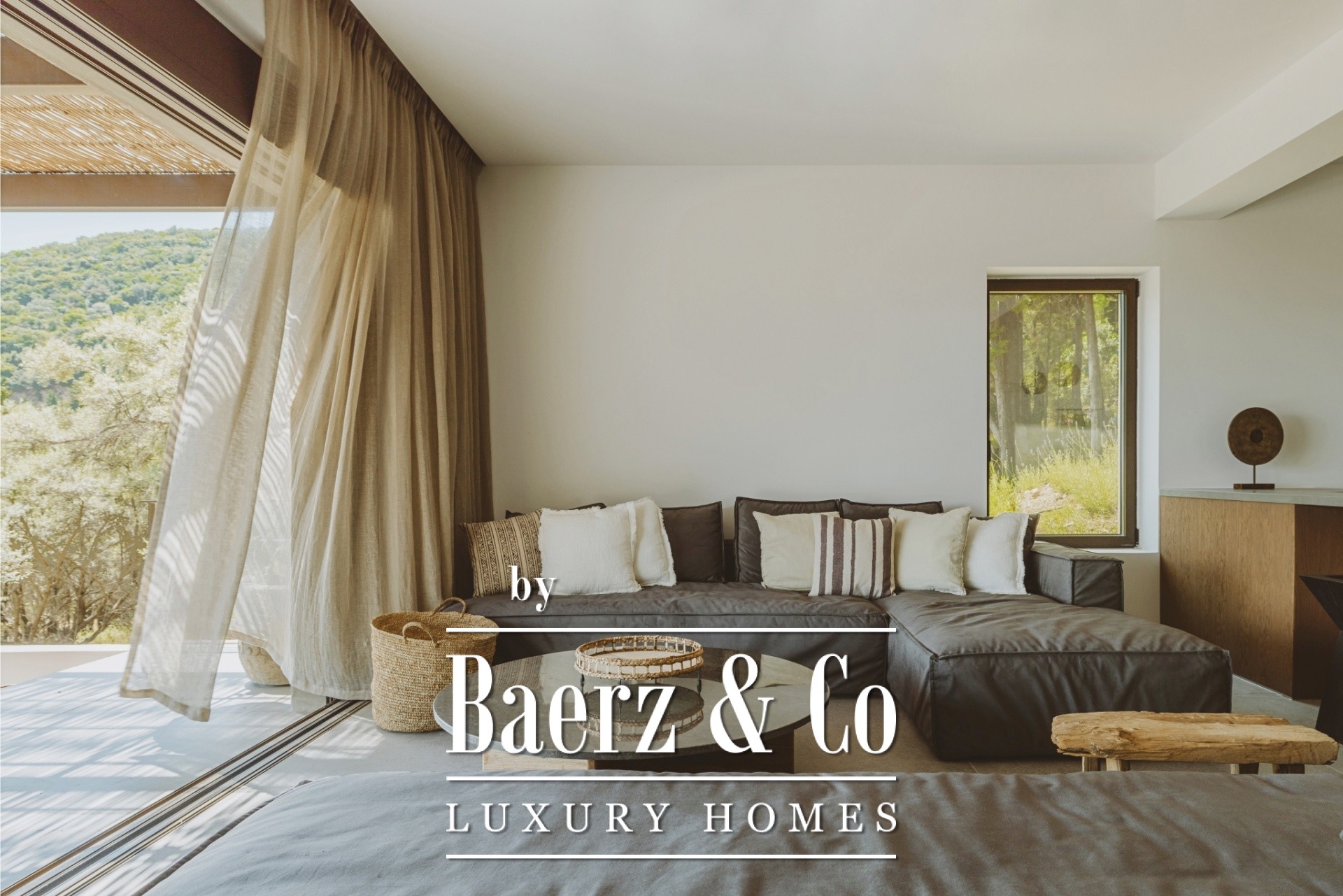 Luxury villa Lefkada defines understated coastal living, set on a commanding 6,820 m² plot in the heart of Nidri. This three-level villa offers 233 m² of sculpted interior space where form and function meet the expanse of the Ionian Sea. Upon entering, an open-plan dining area welcomes natural light and uninterrupted sea views, melding modern architecture with the landscape. The kitchen, seamlessly linked to the living room and dining space, expresses harmony and intentional design. Two en-suite bedrooms on this level provide comfort and privacy.