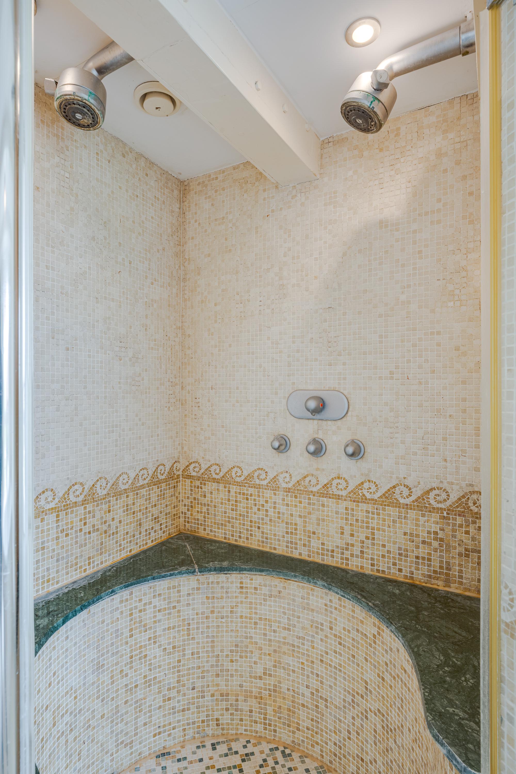 Very spacious master bedroom with en-suite bathroom featuring a bathtub with Jacuzzi, double shower, toilet, and double sink. French doors open onto the large roof terrace, spread over several levels: a sunny and private space with various seating options.