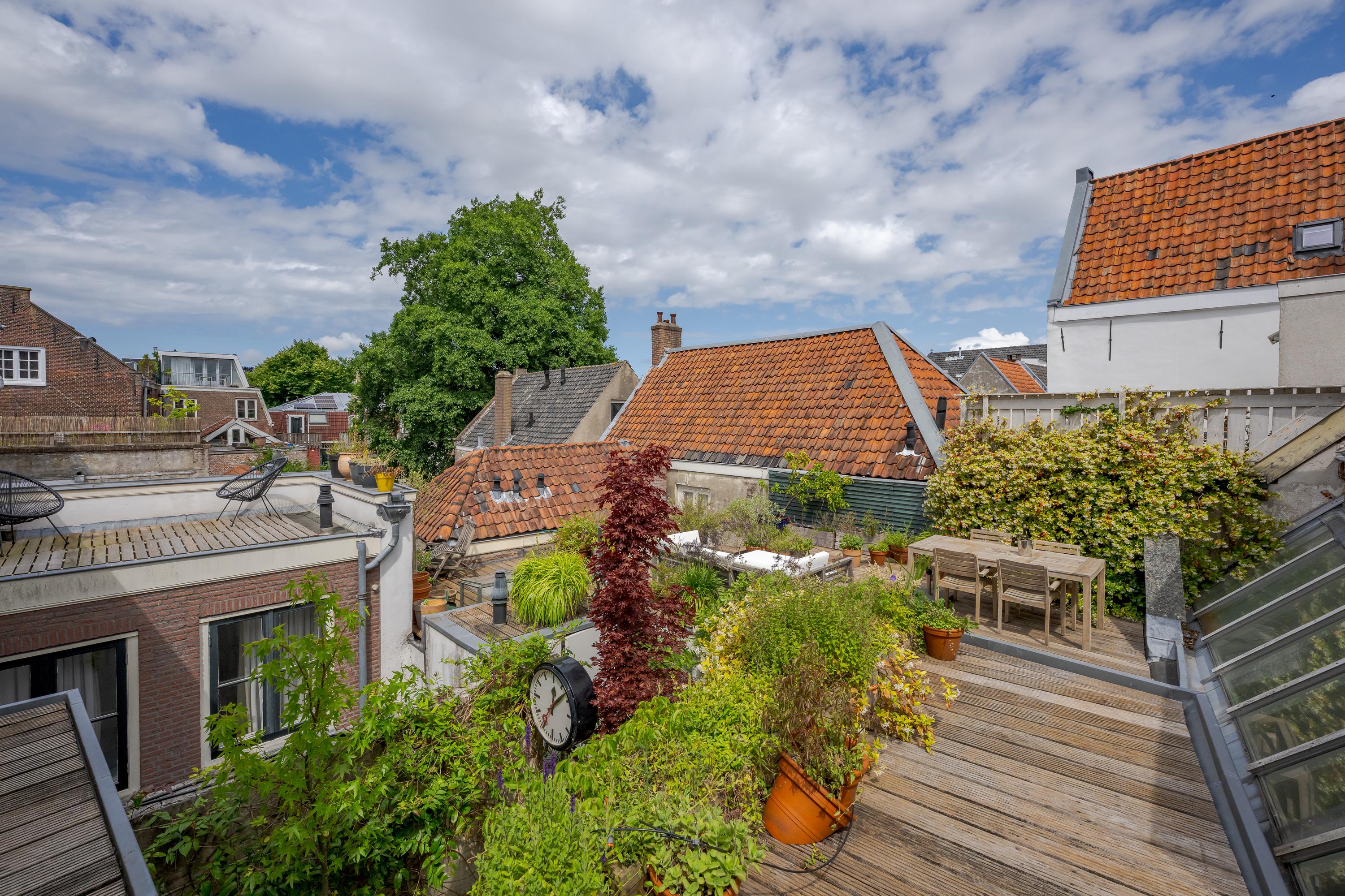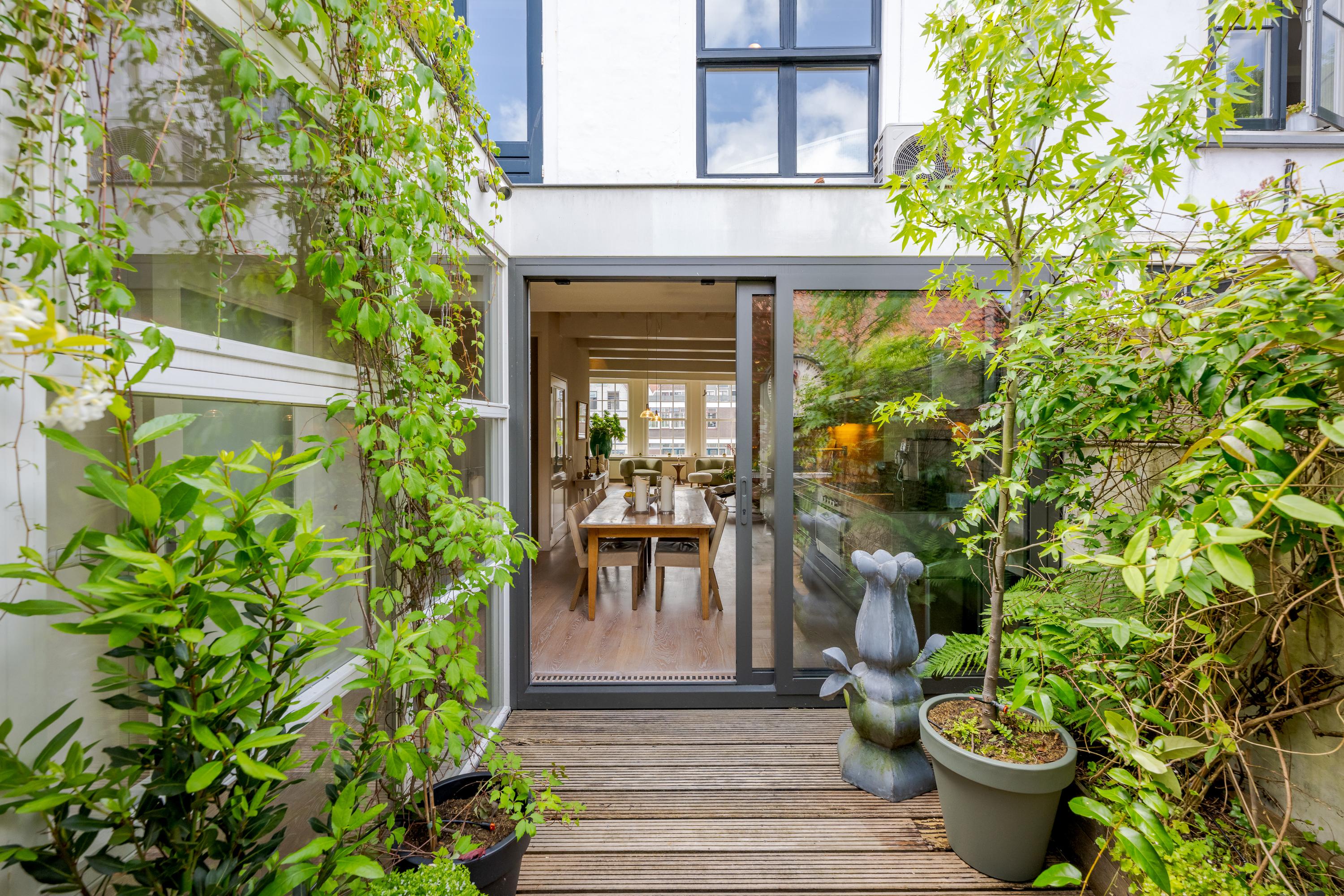 What also makes this property unique is the remarkable combination of a stately, classic façade on the canal side (three windows wide, facing south) and a surprisingly spacious rear garden of over nine meters. On the first floor, at the heart of the house, lies a colorful courtyard garden, and a dozen steps up, a spacious and sunny roof terrace with plenty of privacy and several seating areas.