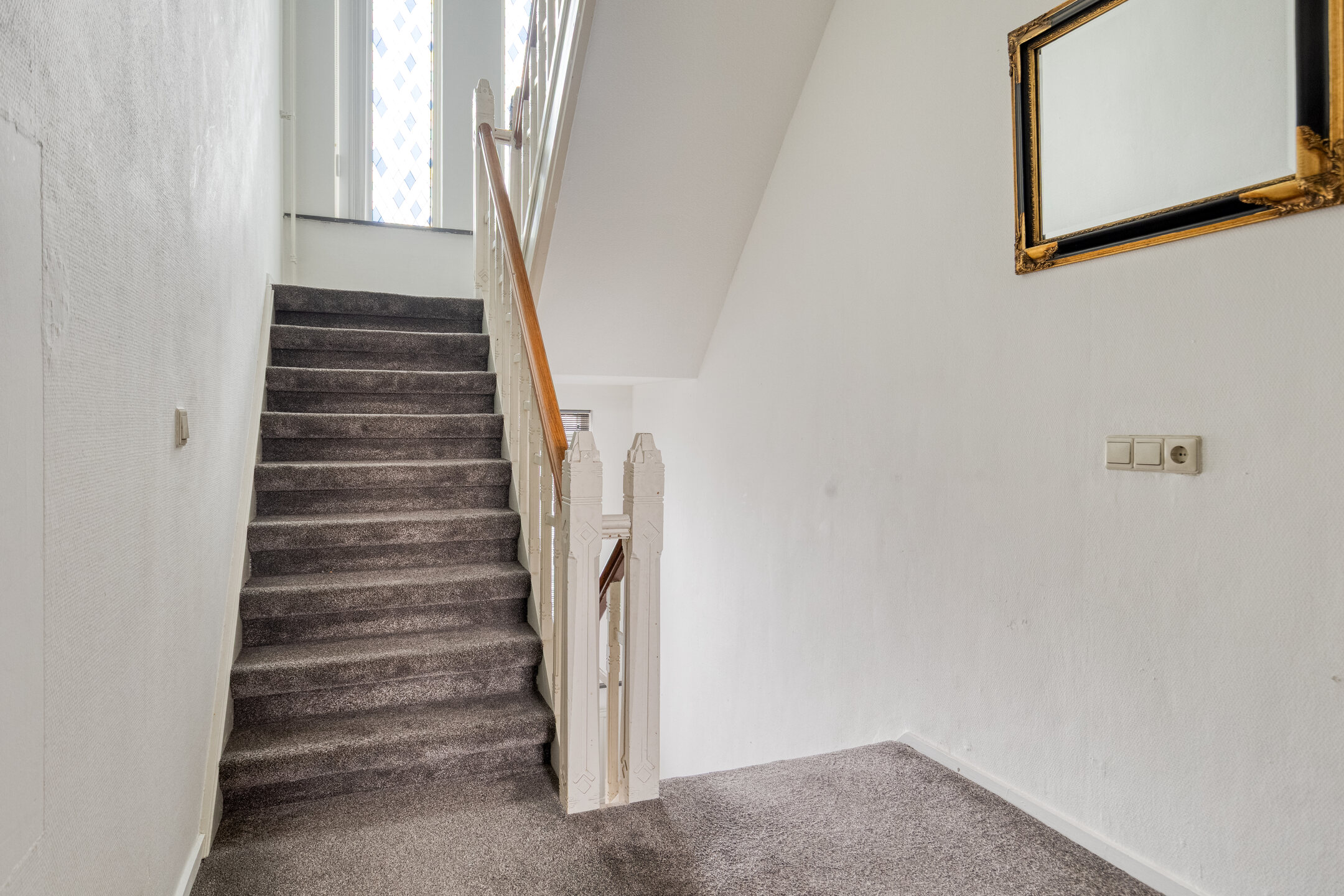 Entrance hall with staircase to the first floor; plastered walls, linoleum flooring, plastered ceiling