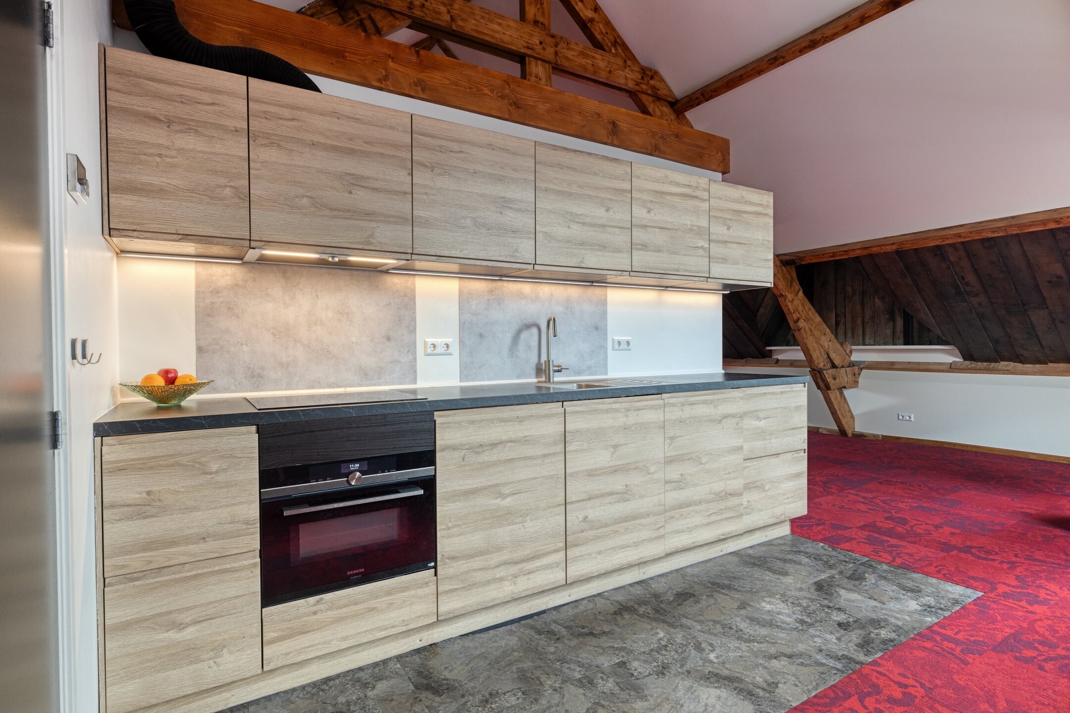 The first floor is currently arranged as a comfortable apartment. Here you will find a spacious living room with an open-plan kitchen, three bedrooms, and a modern bathroom. There is also an attic space that can be further customized as desired, for example as an additional workspace, hobby room, or bedroom.