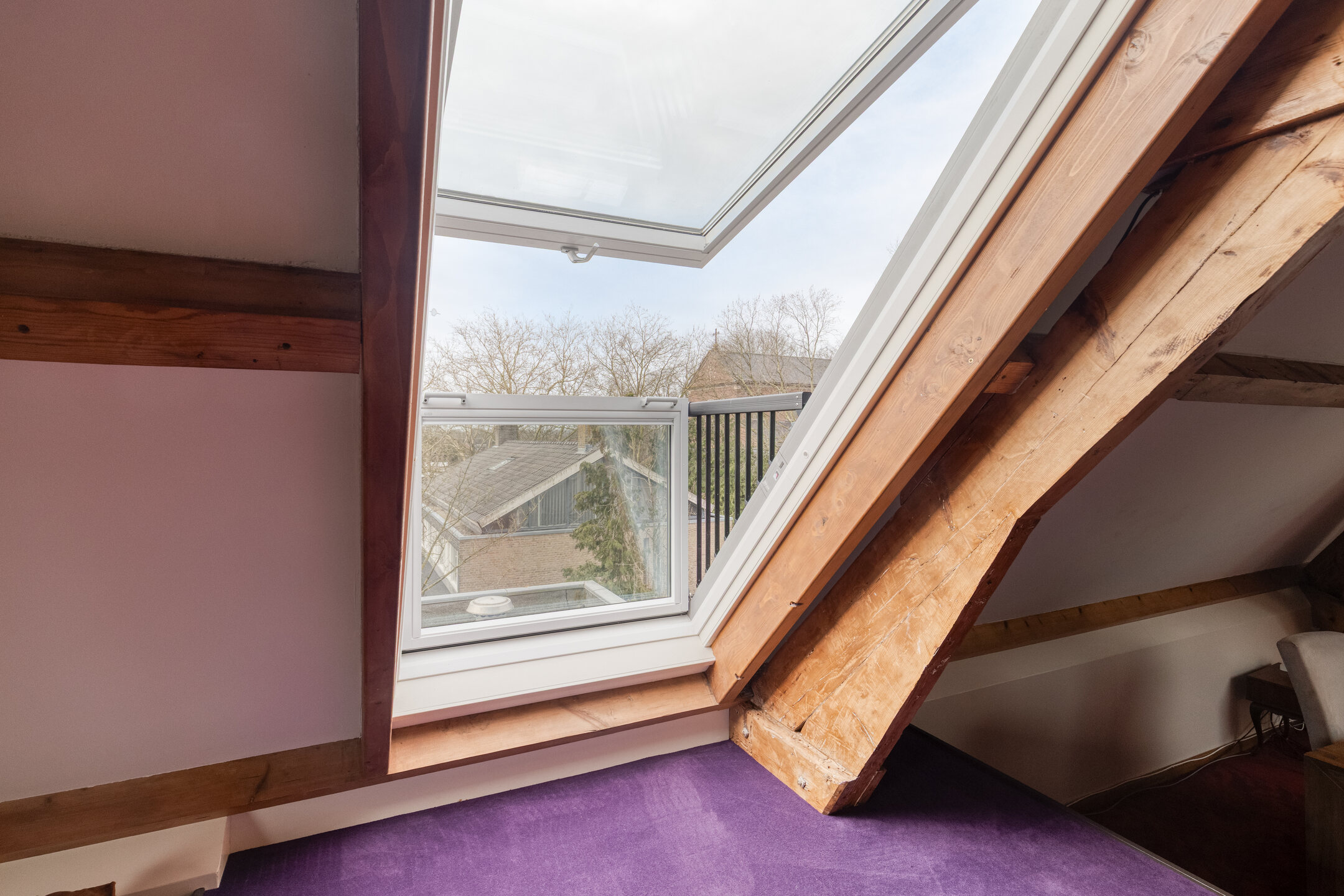 Spacious attic room on the right with potential for an additional bedroom/hobby/work room, two skylights, plastered walls, wooden floor, visible roof structure