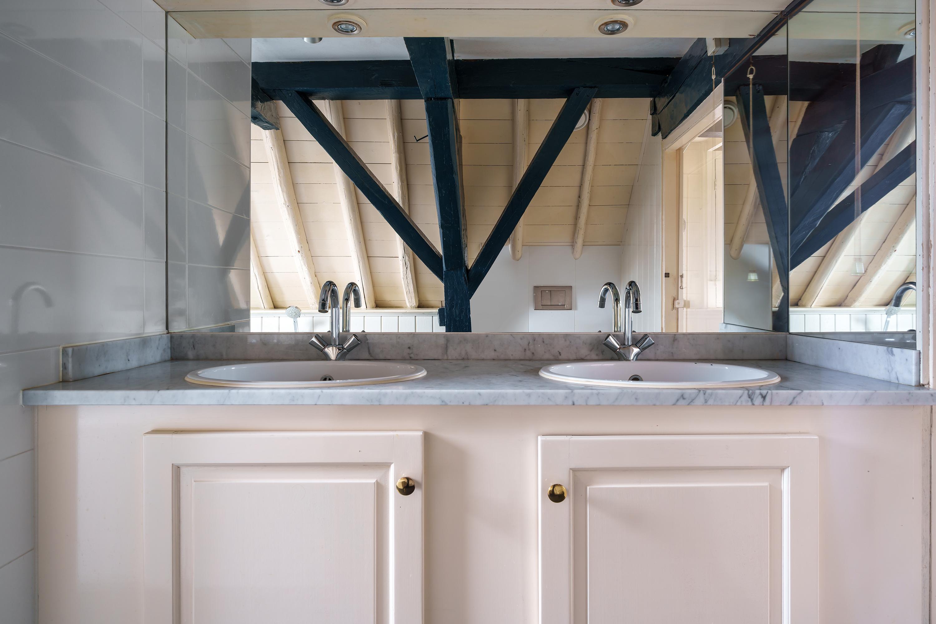 The stately entrance leads to the central hall, which continues into a more spacious hallway. Here you will find the toilet and the impressive staircase to the first floor. Nice details: the low window, the beautiful stair cupboard under the stairs and the authentic washbasin in the corner. The hall is tiled with old ‘Carrara’ marble floor tiles. The incredibly beautiful, very old floor beams (ceiling height of over 2.8 metres) immediately catch the eye here, and these are also reflected in the living areas.