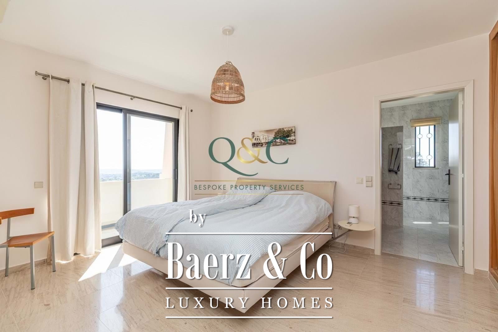 Villa Loulé presents a rare sense of calm just five minutes from the vibrant market town of Loule, with captivating sea and countryside views. This villa rests on a 6,720 m² plot, embraced by established gardens and a distinct rhythm of space and light. The 440 m² residence welcomes you with an open plan living and dining area, anchored by a fireplace and direct access to a broad terrace. The kitchen is well-proportioned and equipped for daily living. On the main floor, the master ensuite offers a generous walk-in dressing room, complemented by a family bathroom.