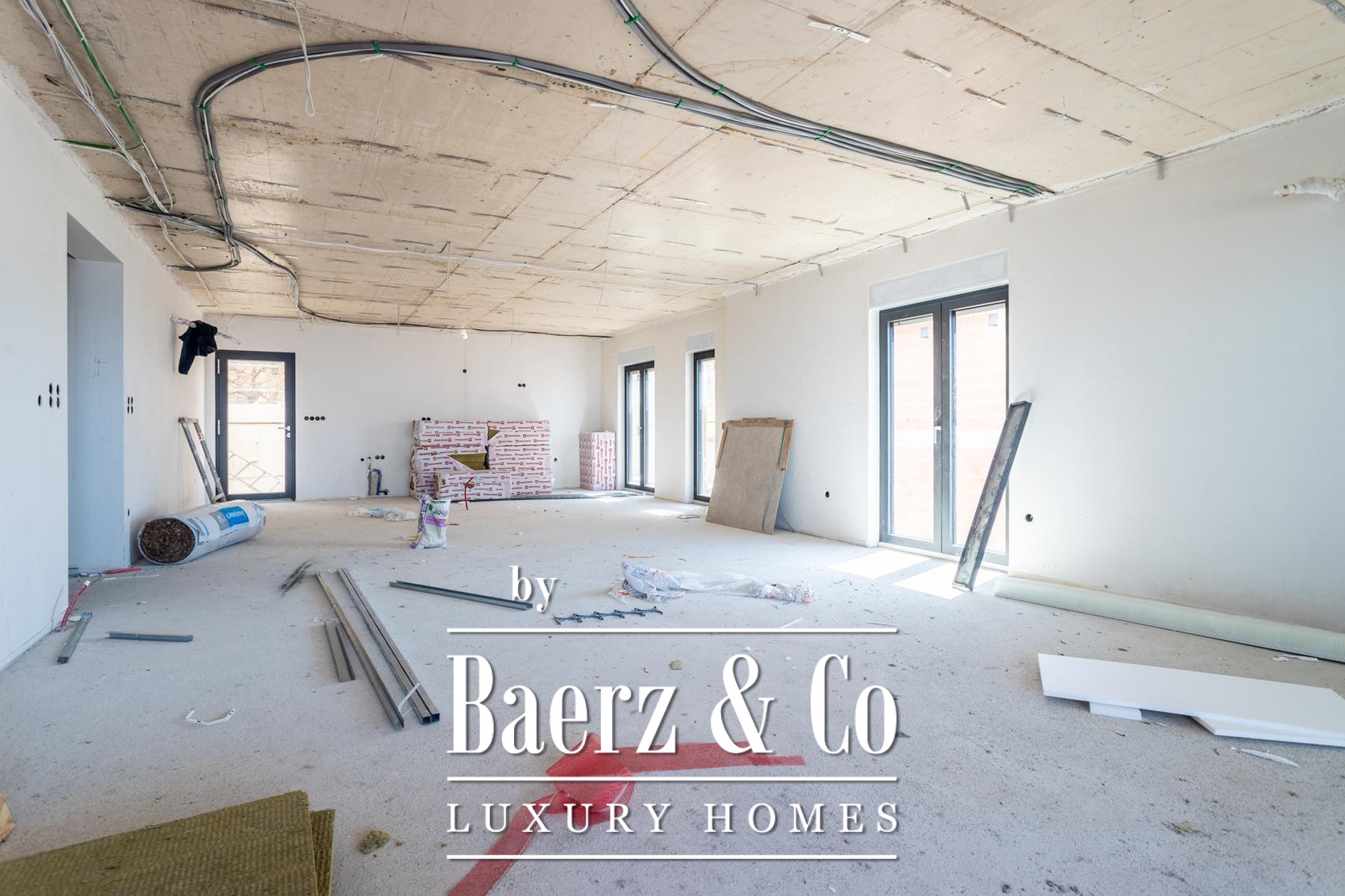 The spatial layout balances generous entertaining areas with quiet retreats, integrating a hallway, pantry, laundry, and an open kitchen and dining room. Interiors are defined by first-class parquet and ceramics, Schuco aluminum carpentry, and controlled comfort via smart home technology, underfloor heating with heat pump, and advanced climate control. Two secure garage parking spaces are available for purchase.
