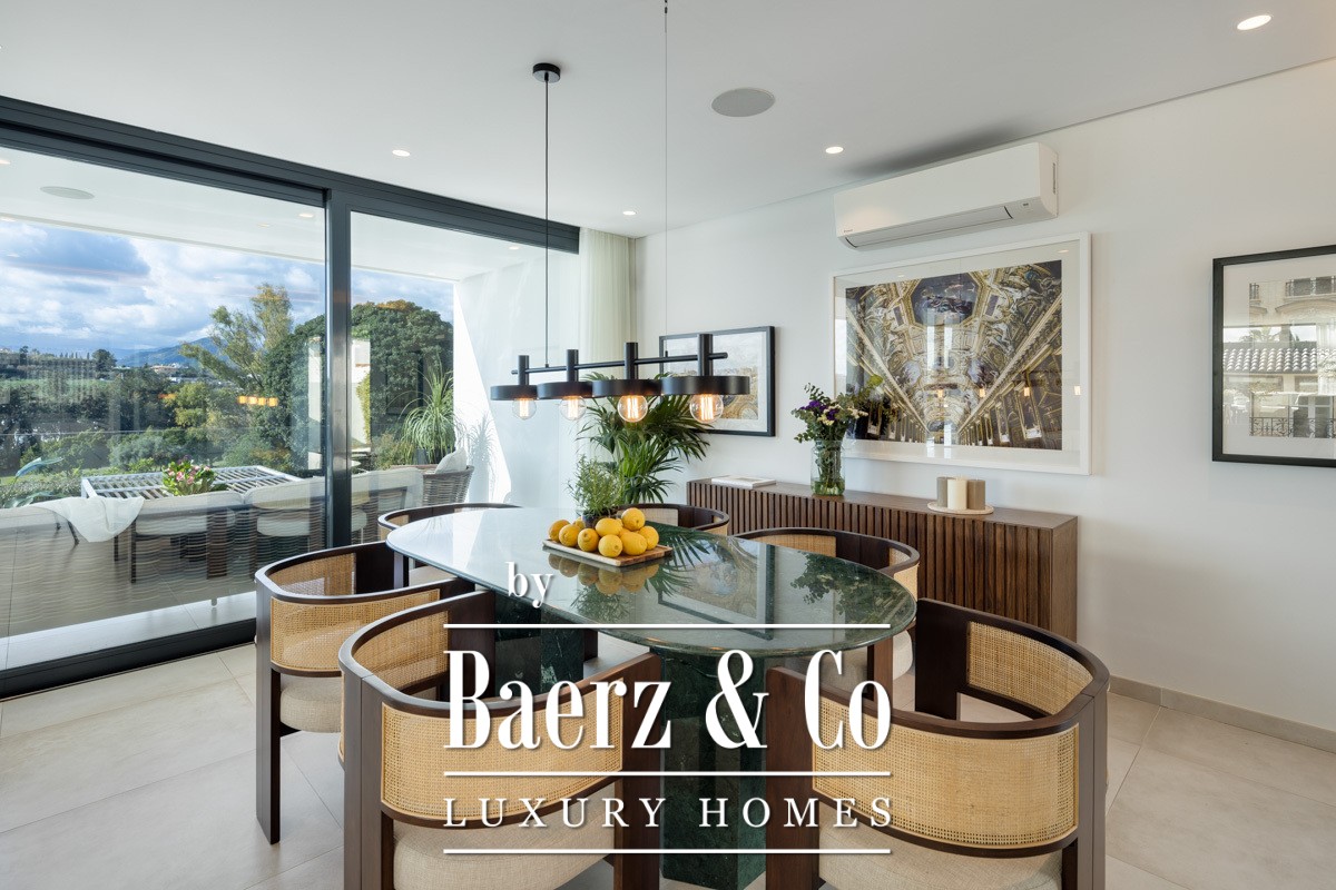 Welcome to a modern frontline golf villa located in the heart of Nueva Andalucía. This stunning property seamlessly combines contemporary design with luxurious comfort, offering an unparalleled living experience. The villa features expansive terraces, thoughtfully designed for entertaining, and a private outdoor pool that invites relaxation under the Mediterranean sun. With a private driveway adding convenience, this villa is perfectly positioned to enjoy breath-taking golf and mountain views from every angle.