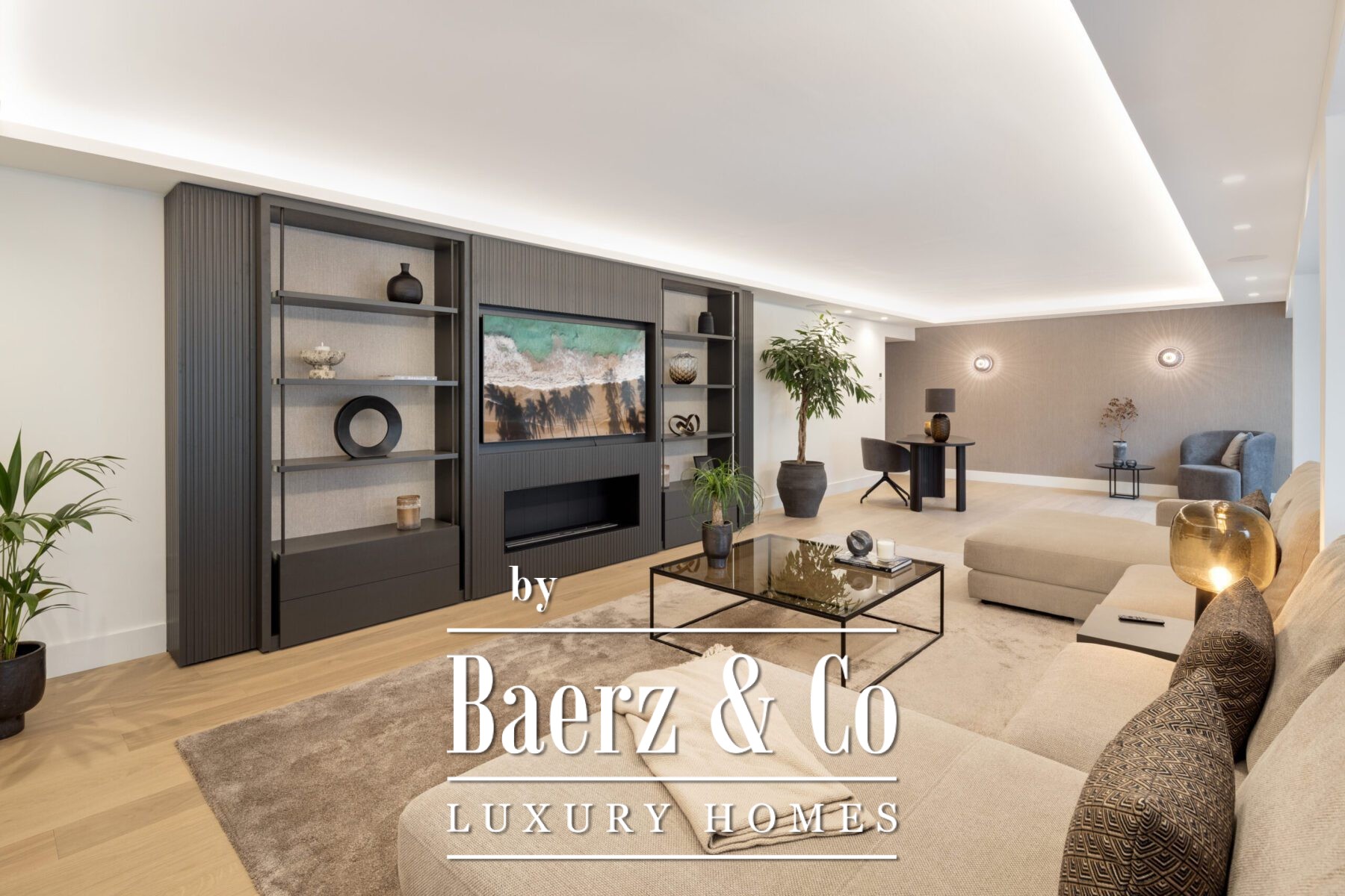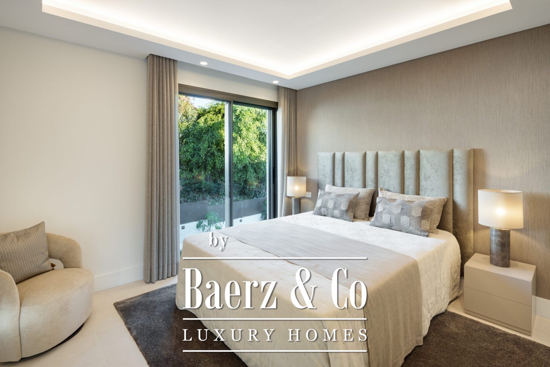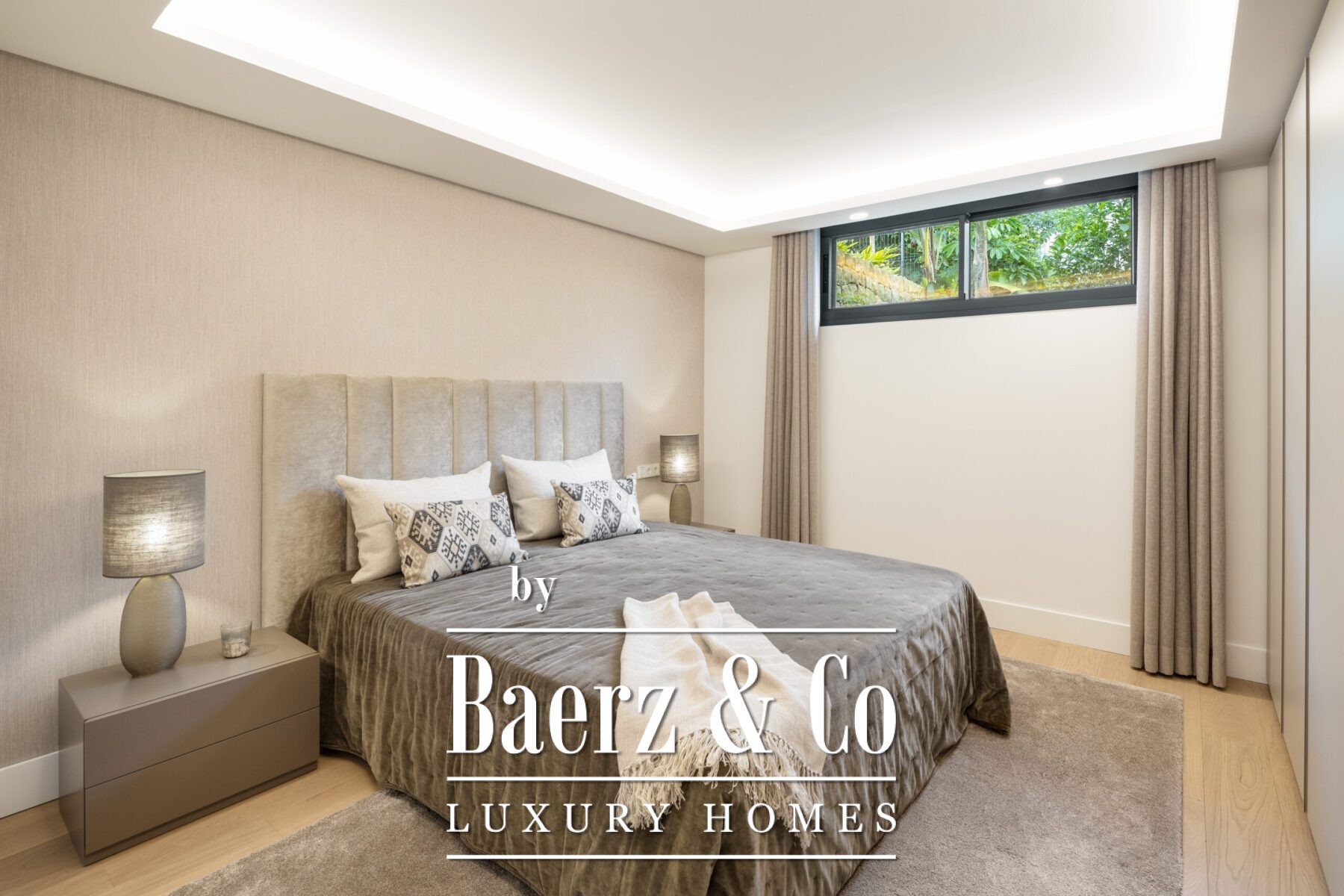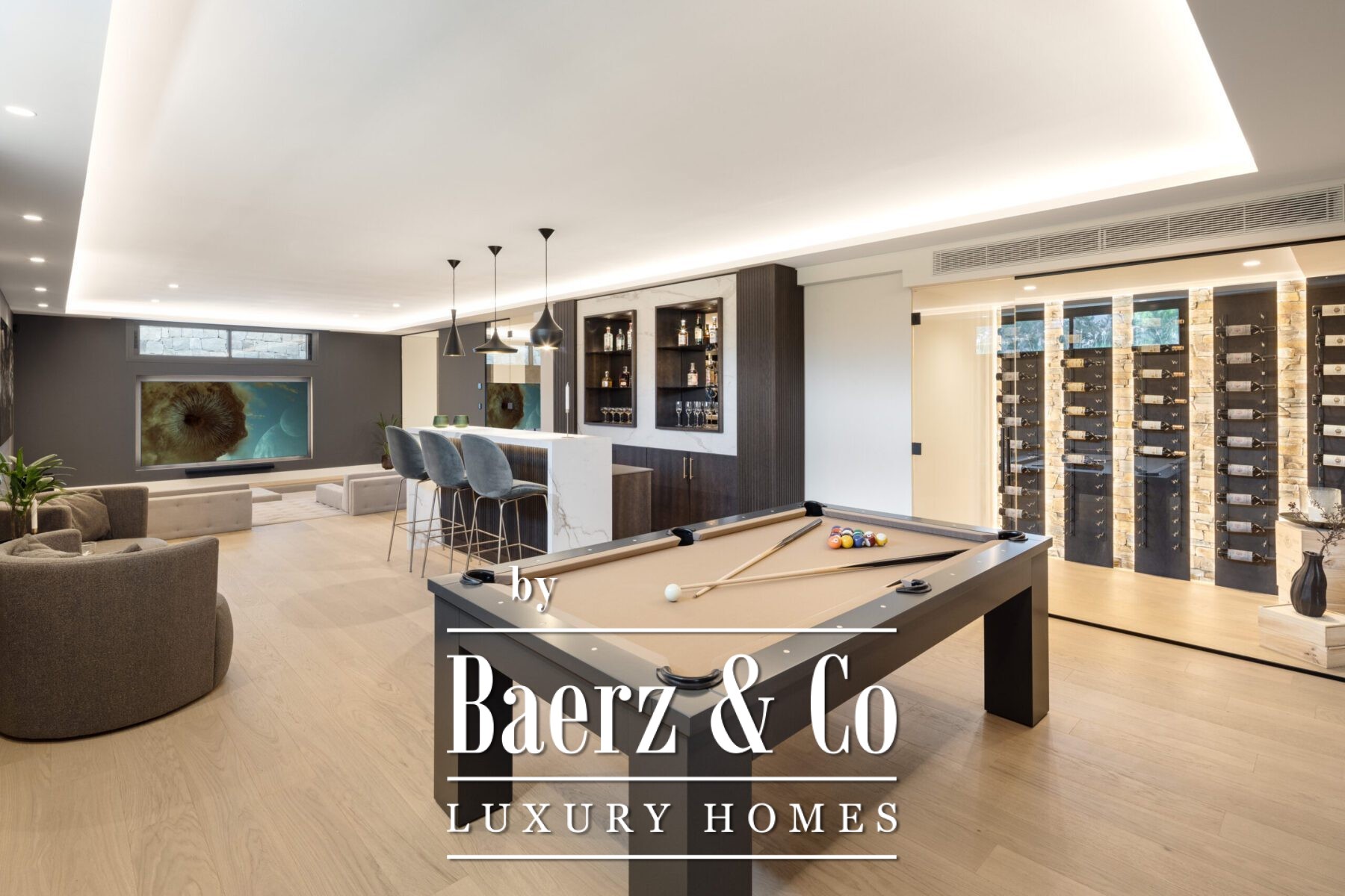 Half a level down, two additional bedrooms, each with en-suite bathrooms, provide ample space for family and guests. Entertainment and relaxation are at the heart. The basement hosts a vibrant social area featuring a bar, cinema, pool table, and wine bodega, complemented by a gym and sauna for wellness activities. This level also includes a beautifully appointed guest suite, enhancing the villa’s capacity to host friends and family in sublime comfort.