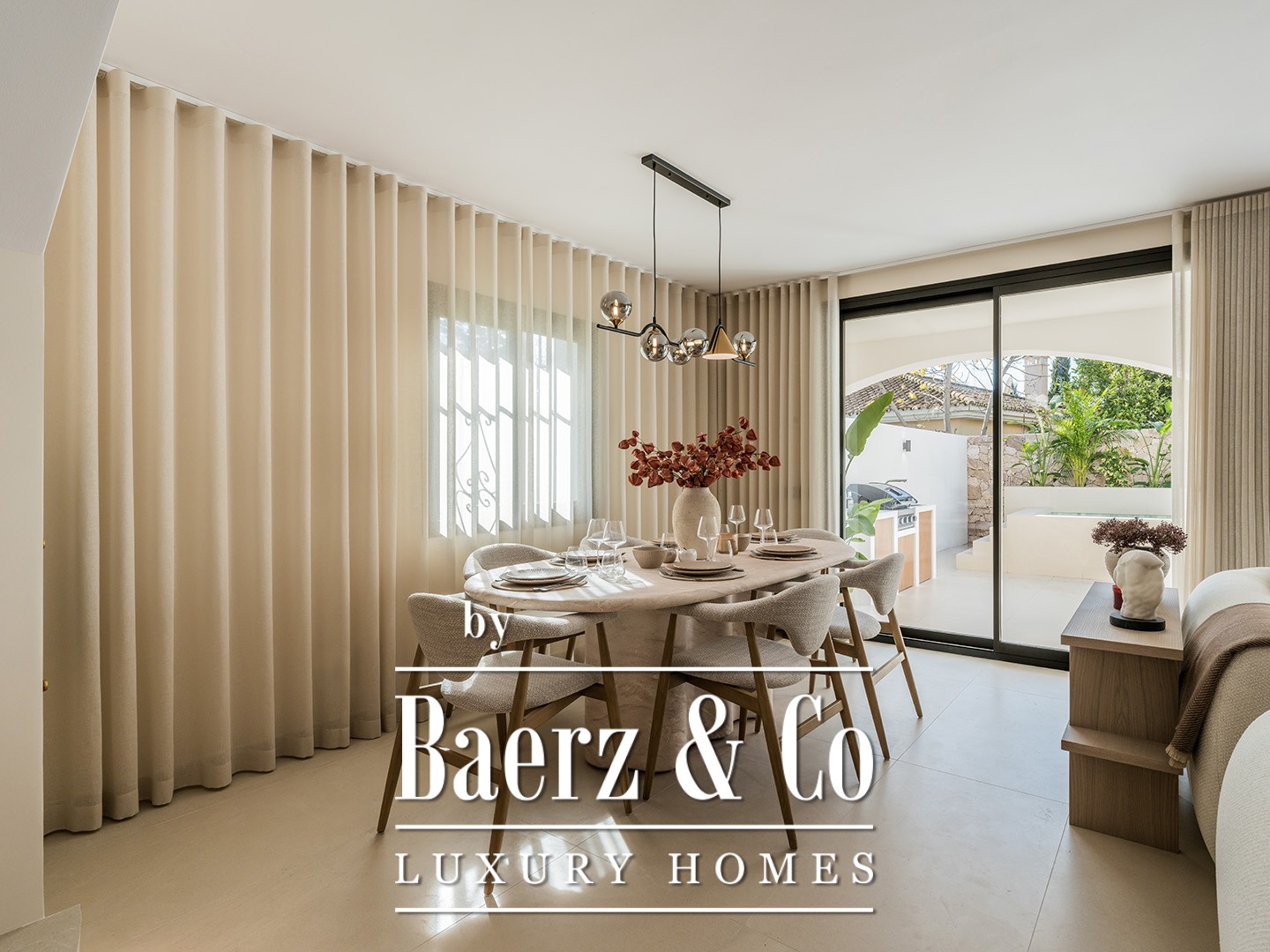 Across two thoughtfully planned levels, the house features four bedrooms and three bathrooms, including a main suite with a double walk-in shower, dressing area, and private terrace. The spacious ground floor provides an open plan living space with a modern kitchen, central island, and integrated high-end appliances. Natural light fills the interiors, while direct access to a partially covered terrace reveals an outdoor kitchen, BBQ, wine fridge, and a private heated pool—ideal for alfresco dining and year-round enjoyment.