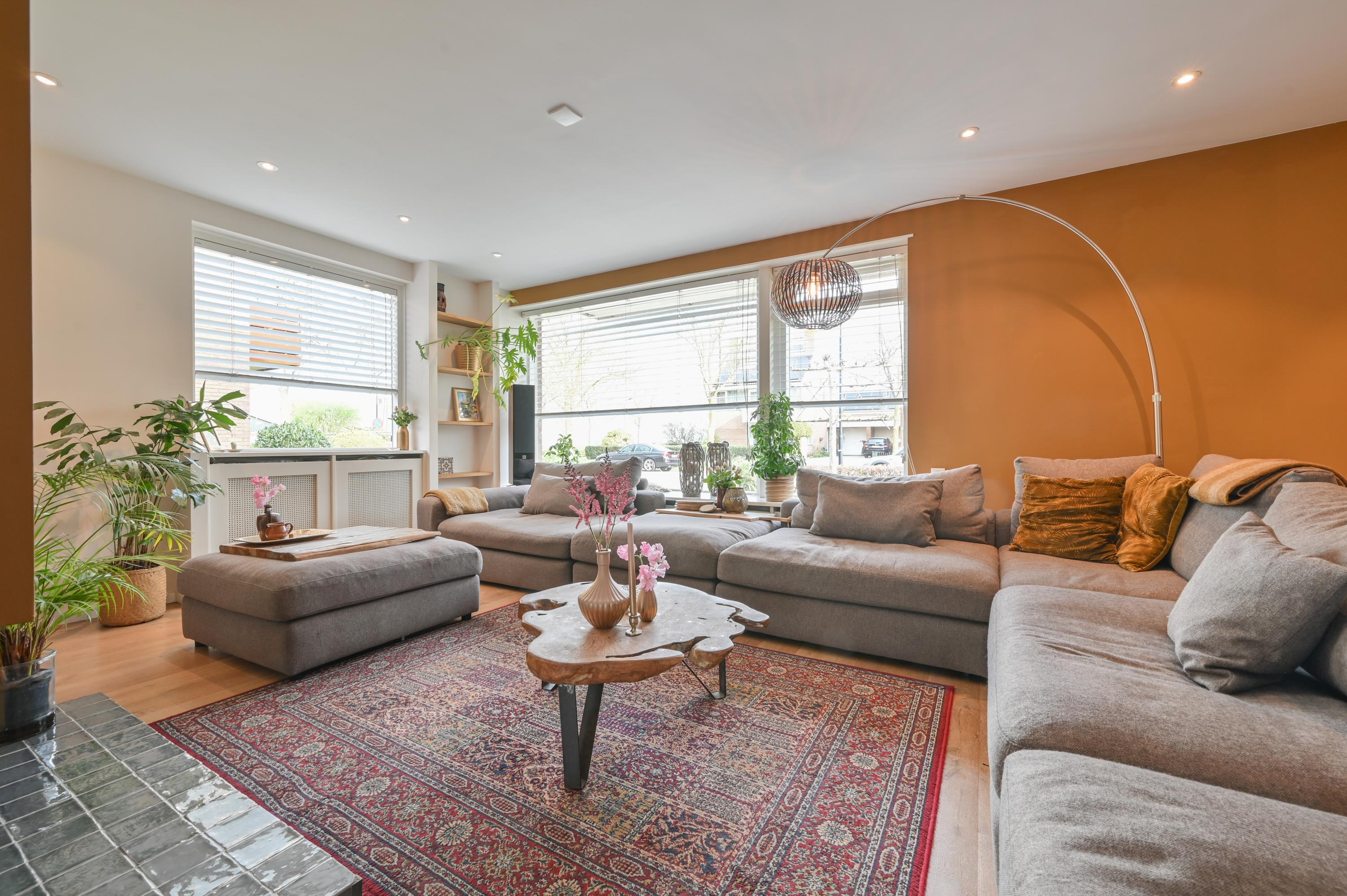 The living room has a cozy L-shaped layout. At the front, a large window provides pleasant natural light and an open connection to the quiet street. The seating area with fireplace forms the warm heart of the home — a place to truly unwind. On the side, a large window offers unique views over the meadows, beautifully blending indoor and outdoor living. The wooden flooring enhances the calm and timeless atmosphere.
